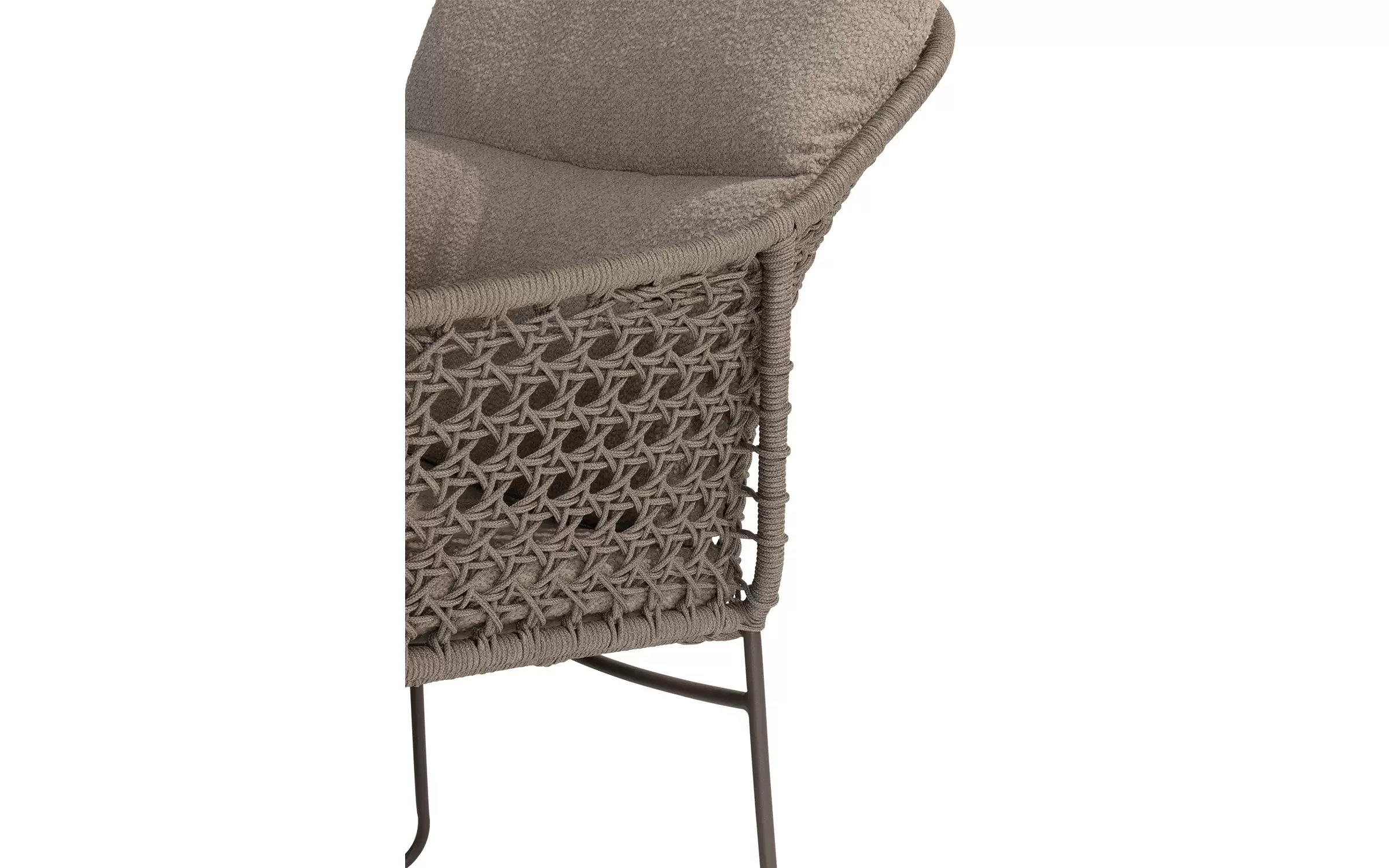 - Do krzesła dołączone są dwie odporne na warunki atmosferyczne poduszki z miękkiej tkaniny bouclé, które zapewniają optymalny komfort siedzenia, nawet podczas dłuższych kolacji.