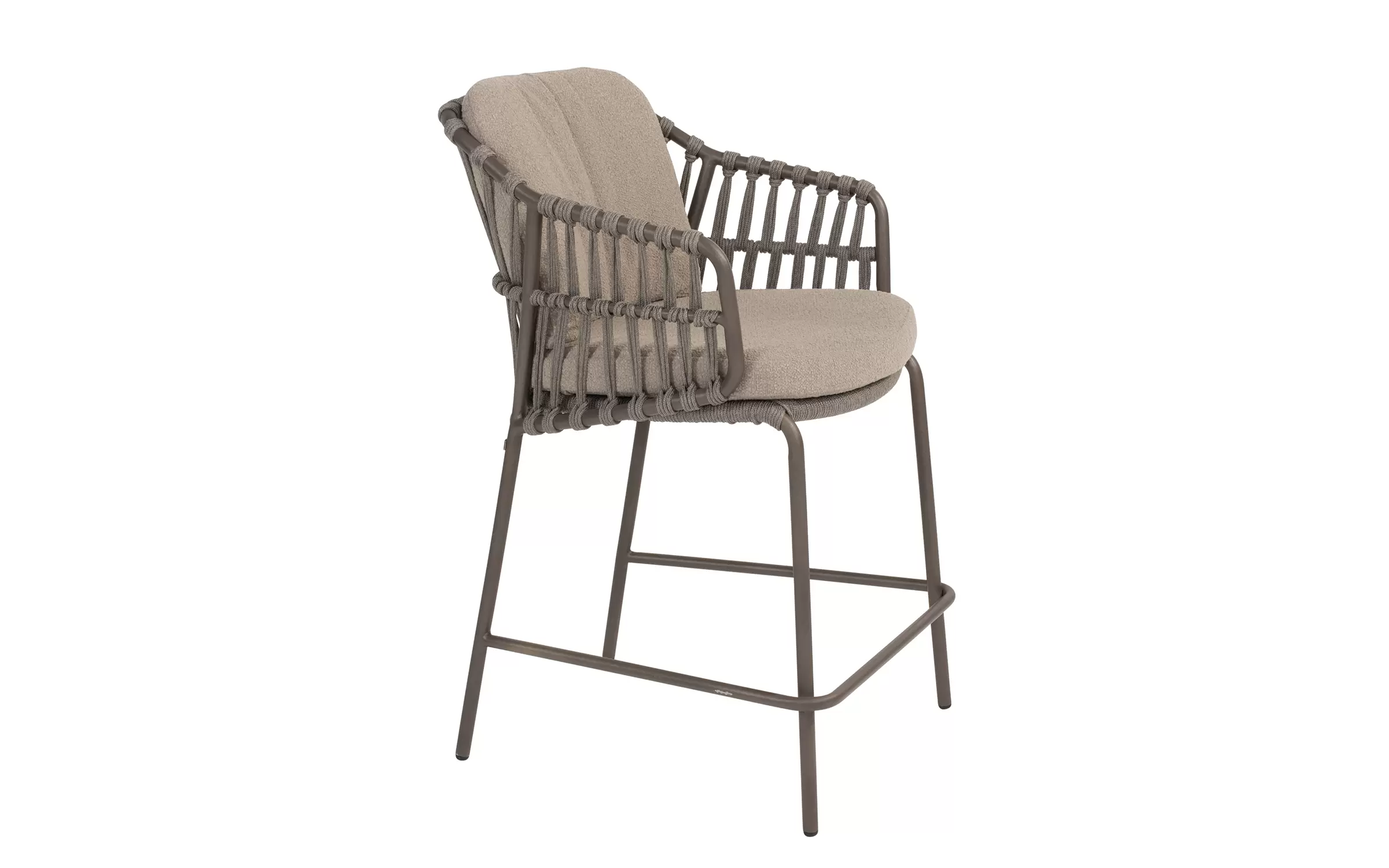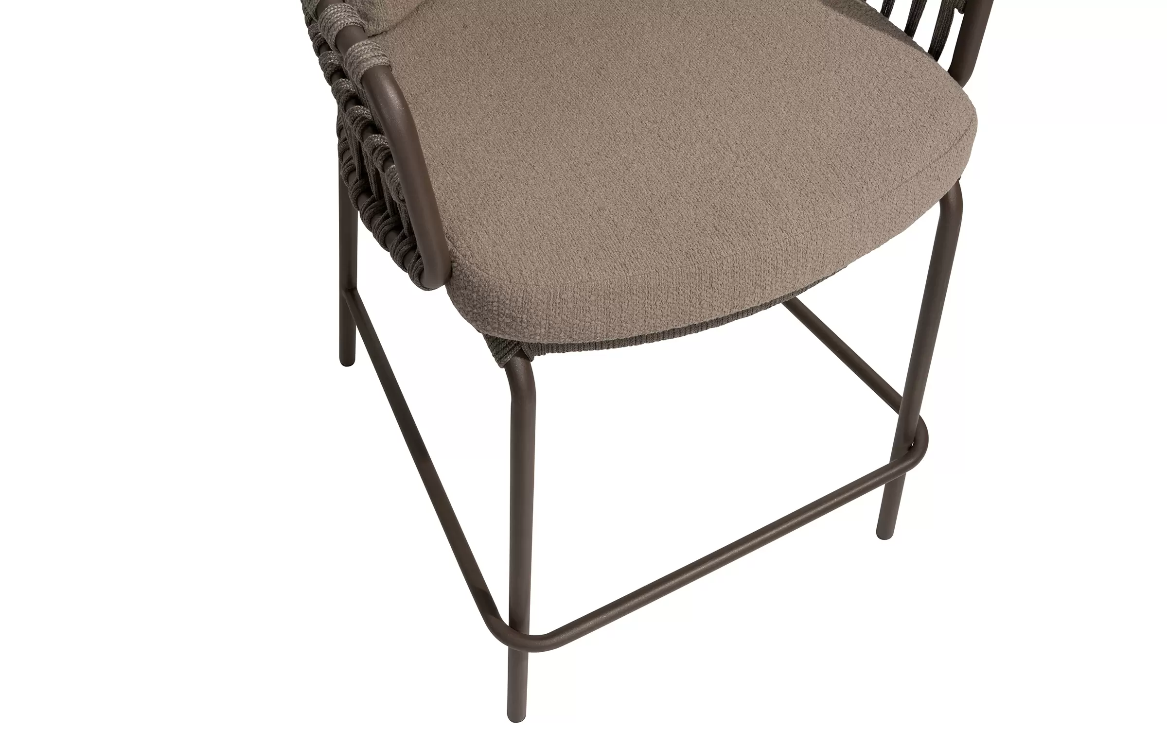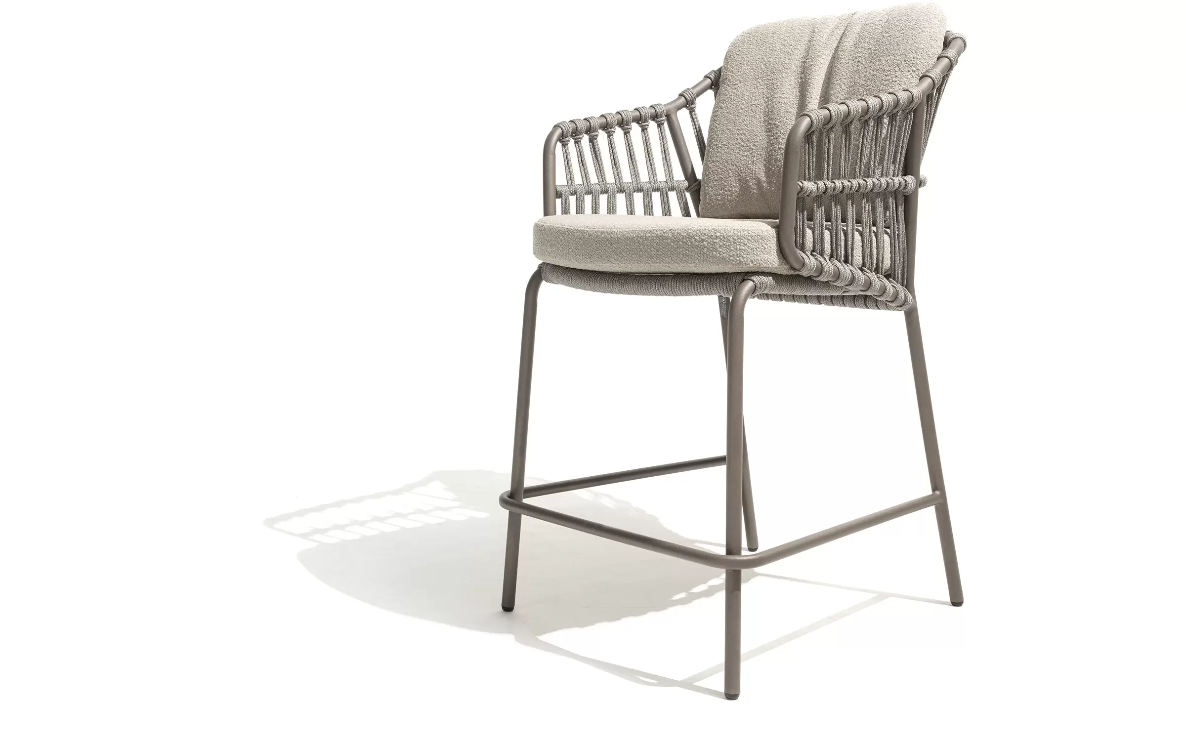 Podstawa ze stali nierdzewnej hoker barowego ogrodowego Capalbio jest wyposażona w dodatkowe wzmocnienie tworzące podnóżek. Poduszki są pokryte tkaniną poduszkową Bouclé, dzięki czemu są cudownie miękkie.