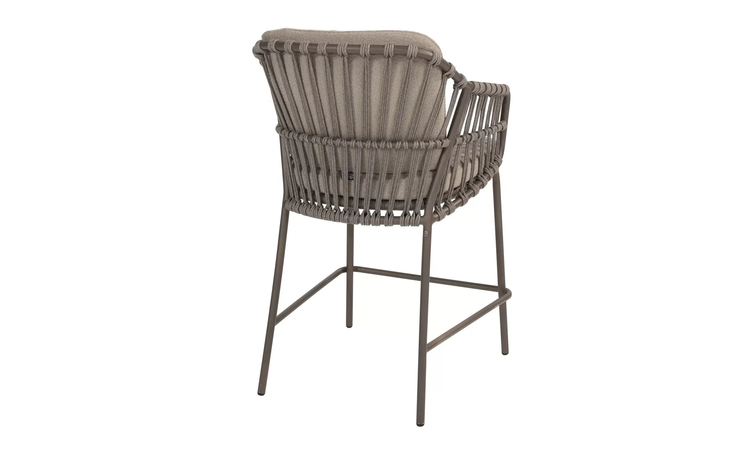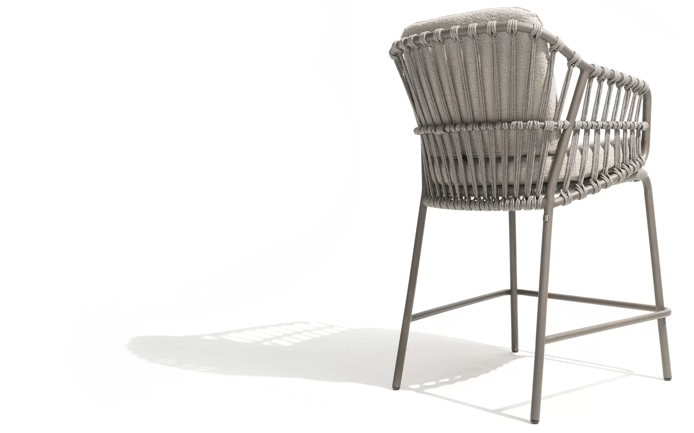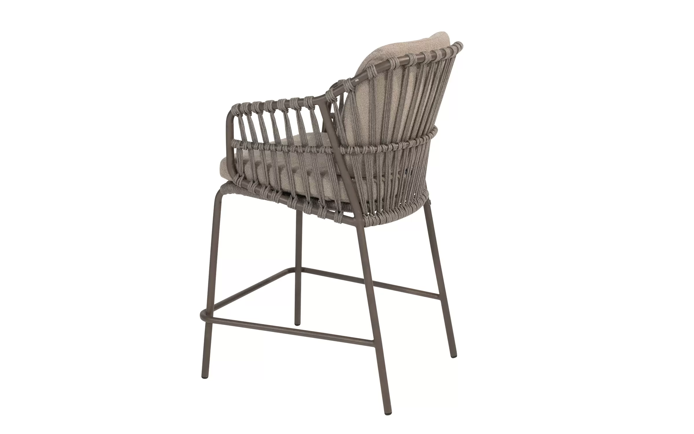 Podstawa ze stali nierdzewnej hoker barowego ogrodowego Capalbio jest wyposażona w dodatkowe wzmocnienie tworzące podnóżek. Poduszki są pokryte tkaniną poduszkową Bouclé, dzięki czemu są cudownie miękkie.