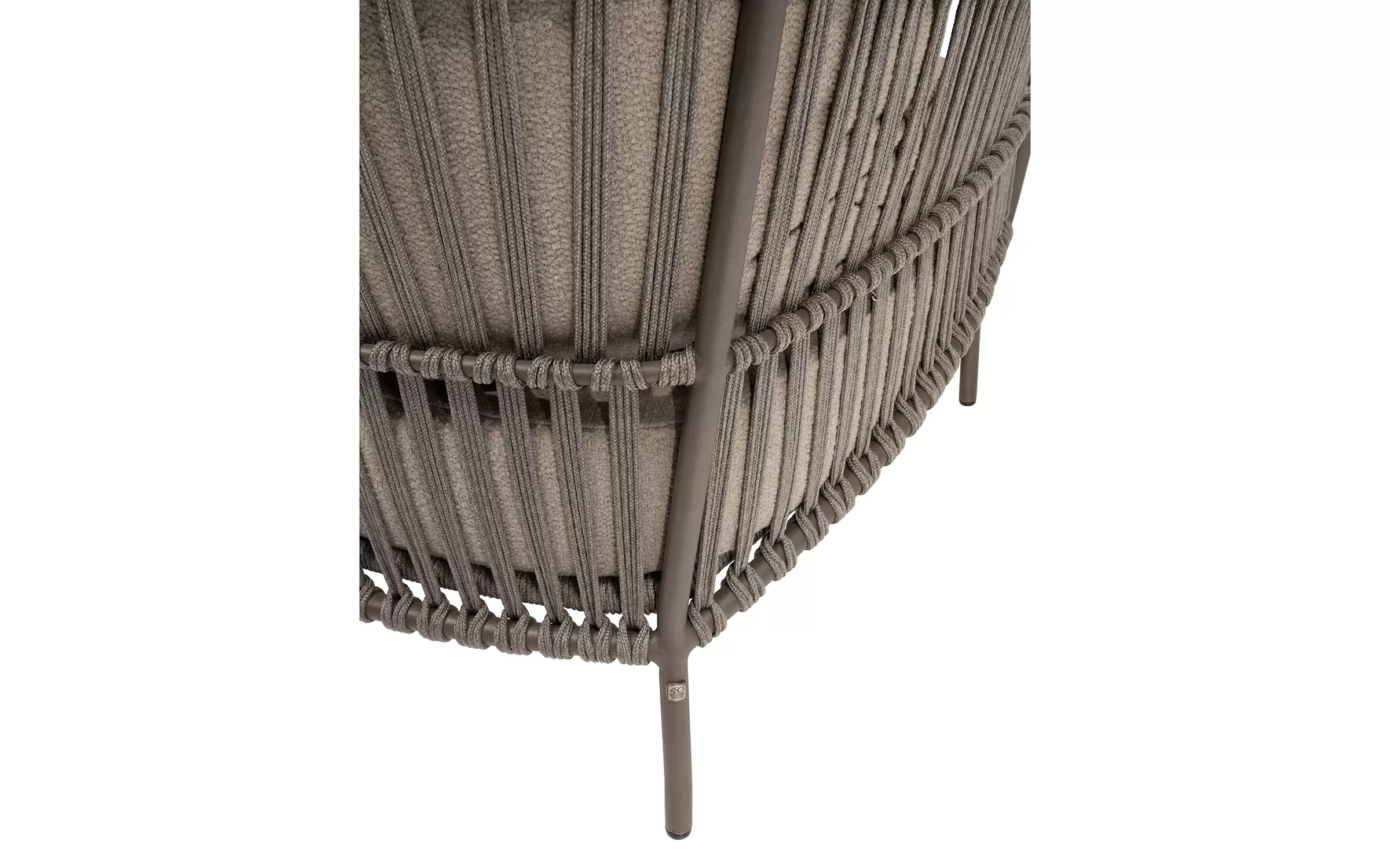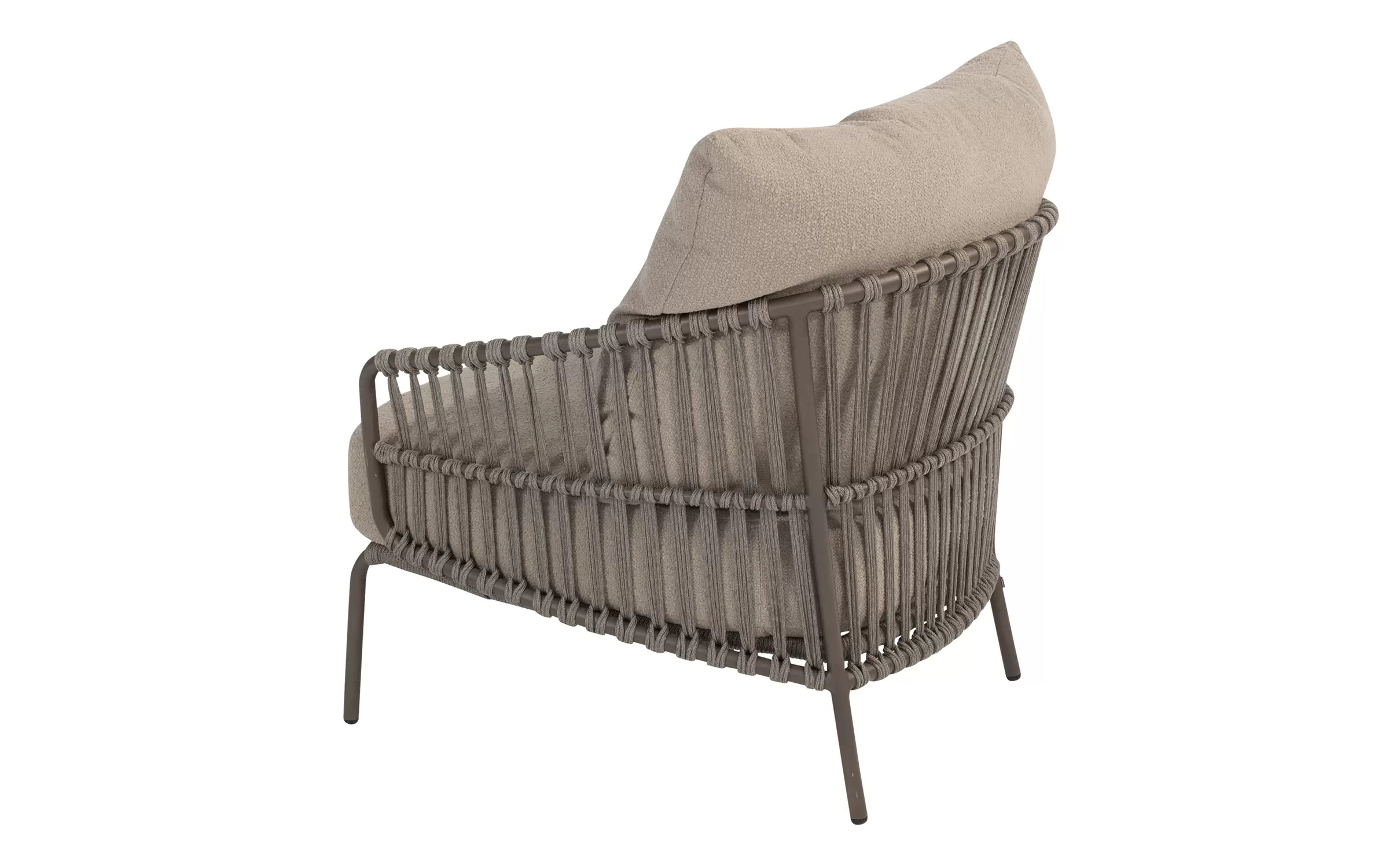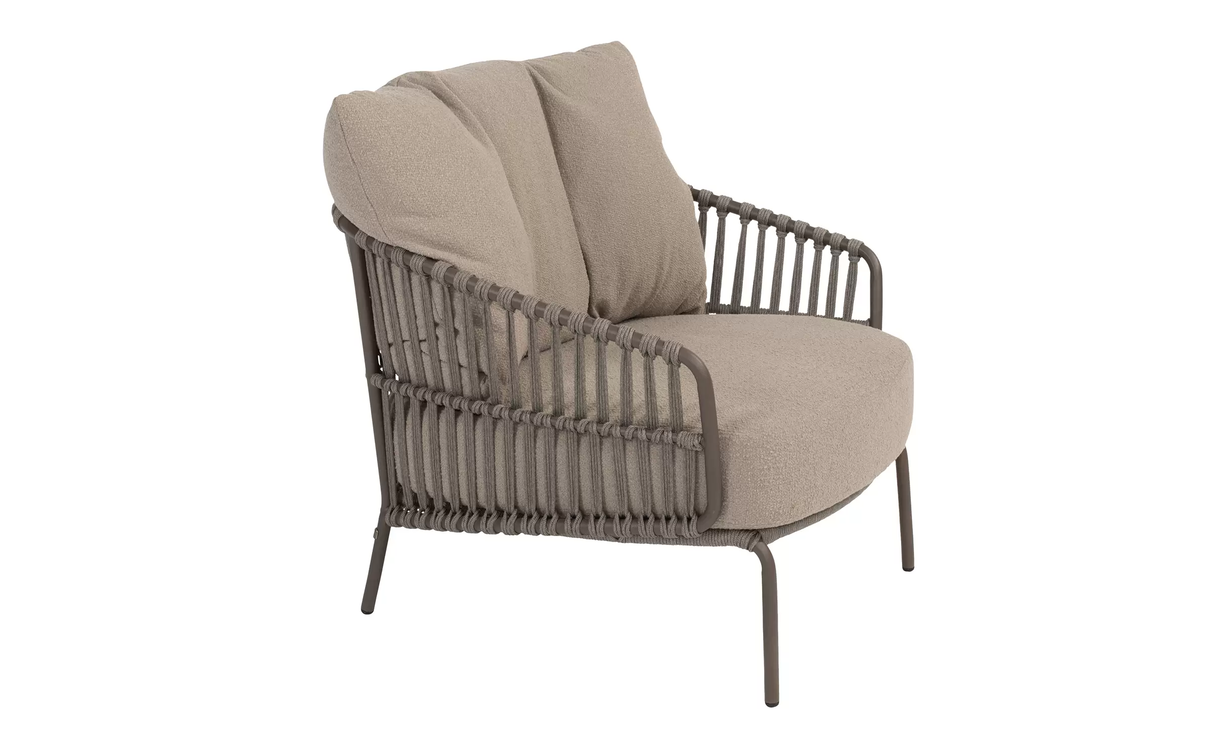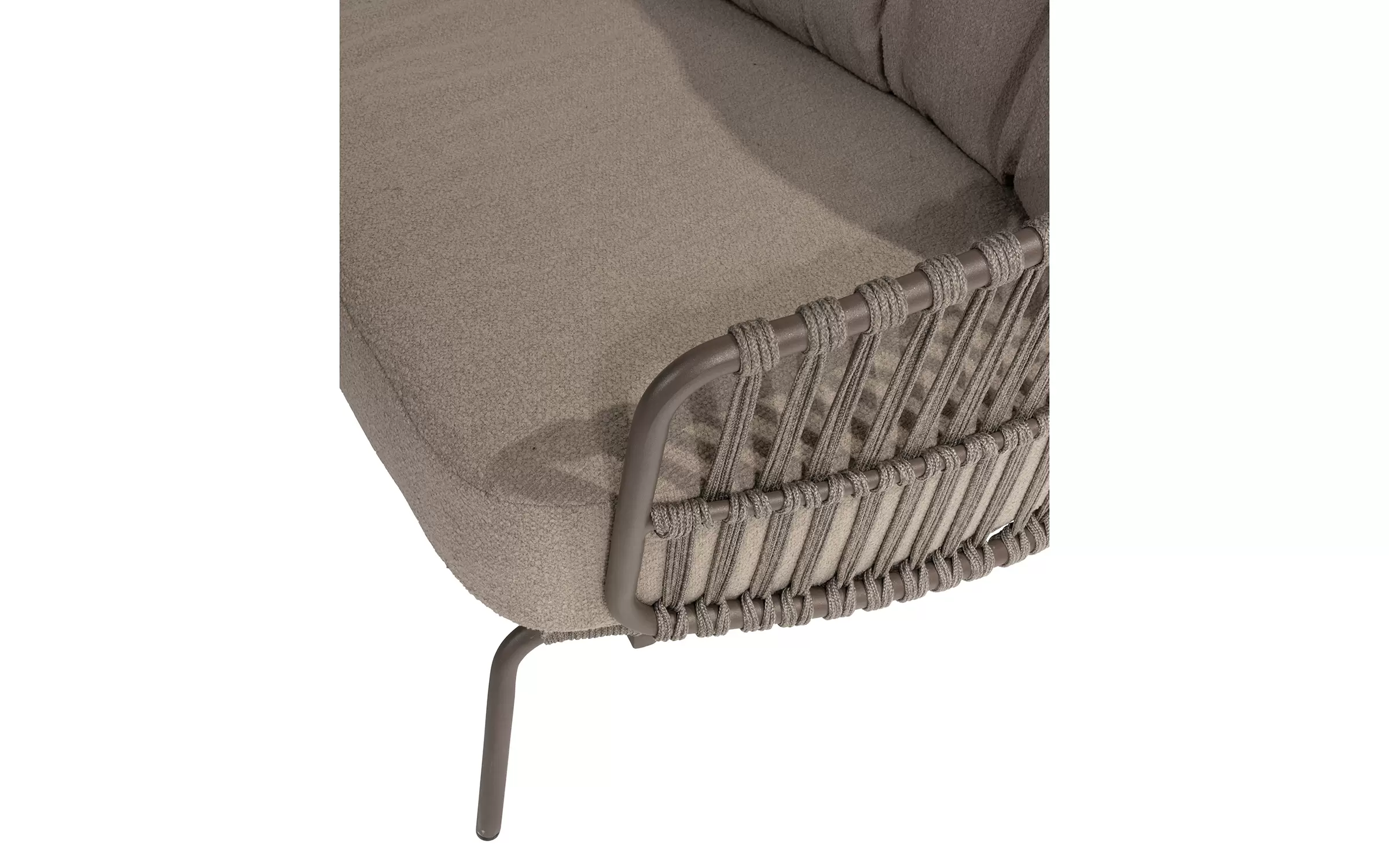Komfort wypoczynku dzięki fotelowi wypoczynkowej z kolekcji 4SO Capalbio. Fotel został zaprojektowany tak, abyś mógł marzyć w wyjątkowo grubych poduszkach z miękkiej tkaniny bouclé. Nowoczesny design z eleganckimi krzywiznami i otwartymi wzorami lin dodaje stylowego akcentu każdemu ogrodowi.