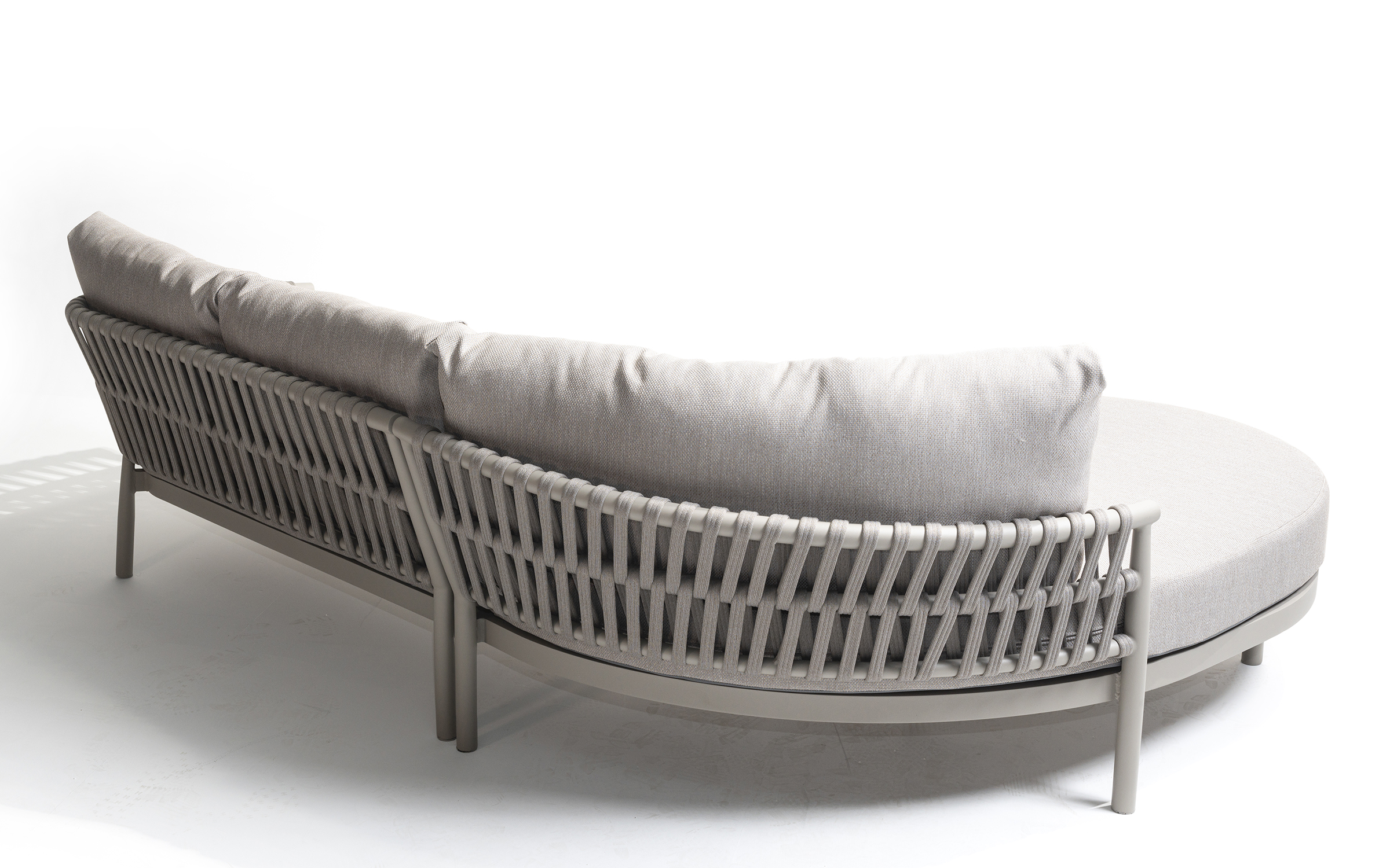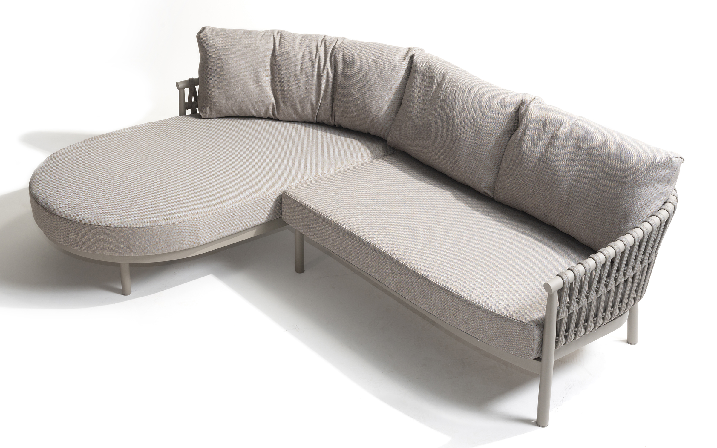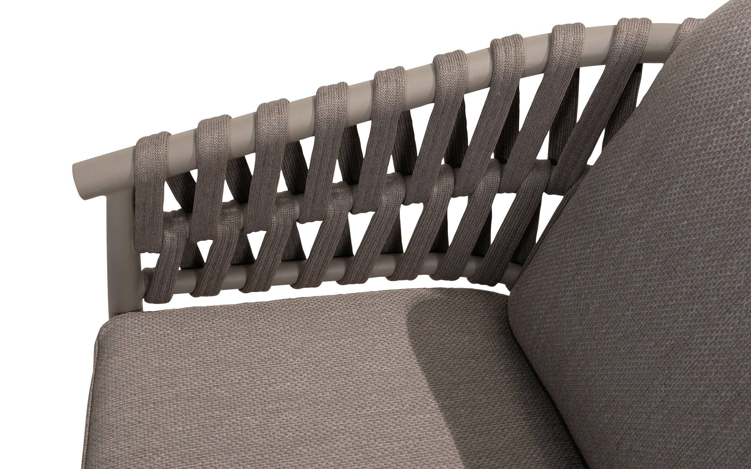 Aluminiowa konstrukcja sofy z szezlongiem Catalana posiada ochronną warstwę szarej powłoki proszkowej, która nadaje sofie nowoczesny wygląd. Konstrukcja tworzy piękne połączenie z wyrafinowaną szarą liną oplatająca oparcia.