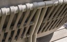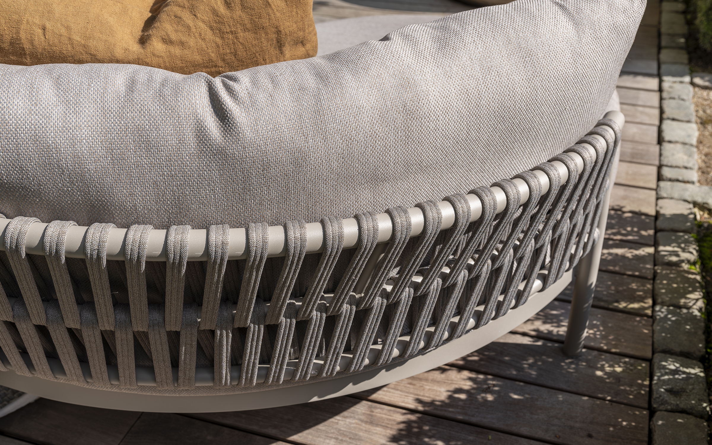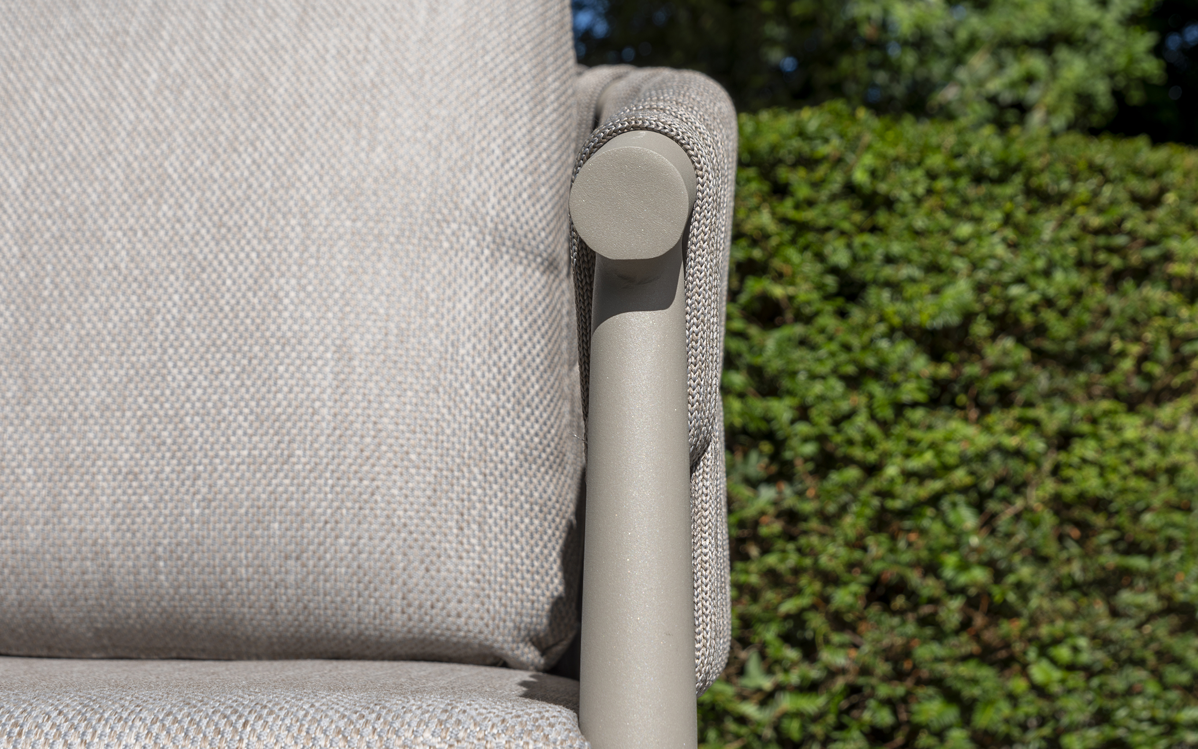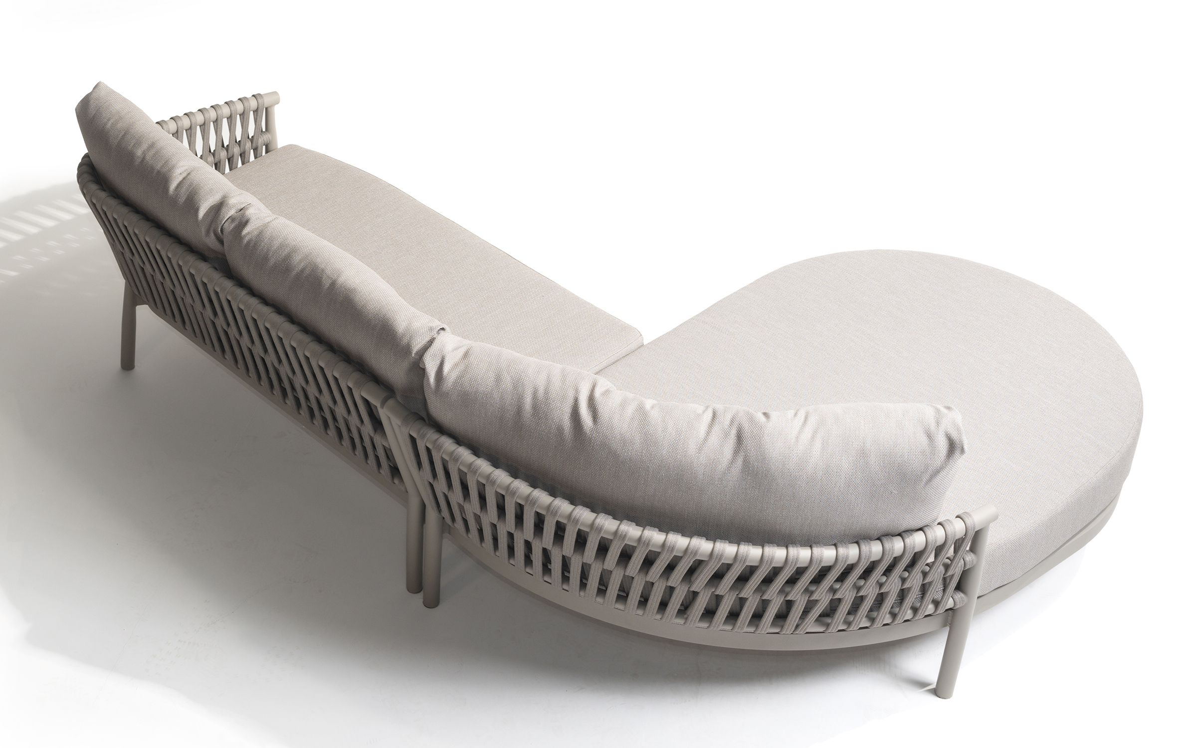 Aluminiowa konstrukcja sofy z szezlongiem Catalana posiada ochronną warstwę szarej powłoki proszkowej, która nadaje sofie nowoczesny wygląd. Konstrukcja tworzy piękne połączenie z wyrafinowaną szarą liną oplatająca oparcia.