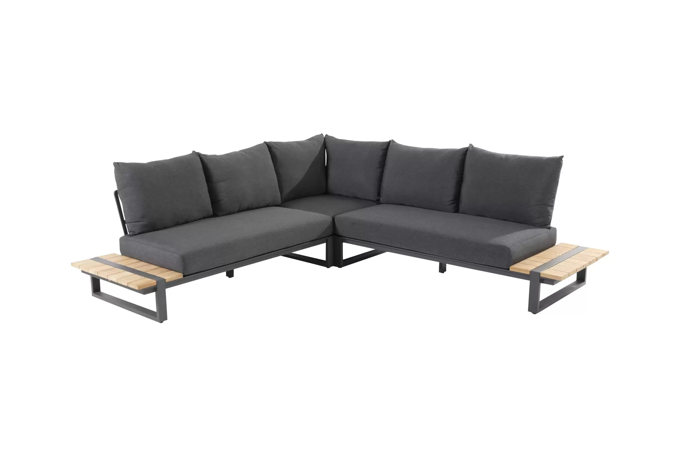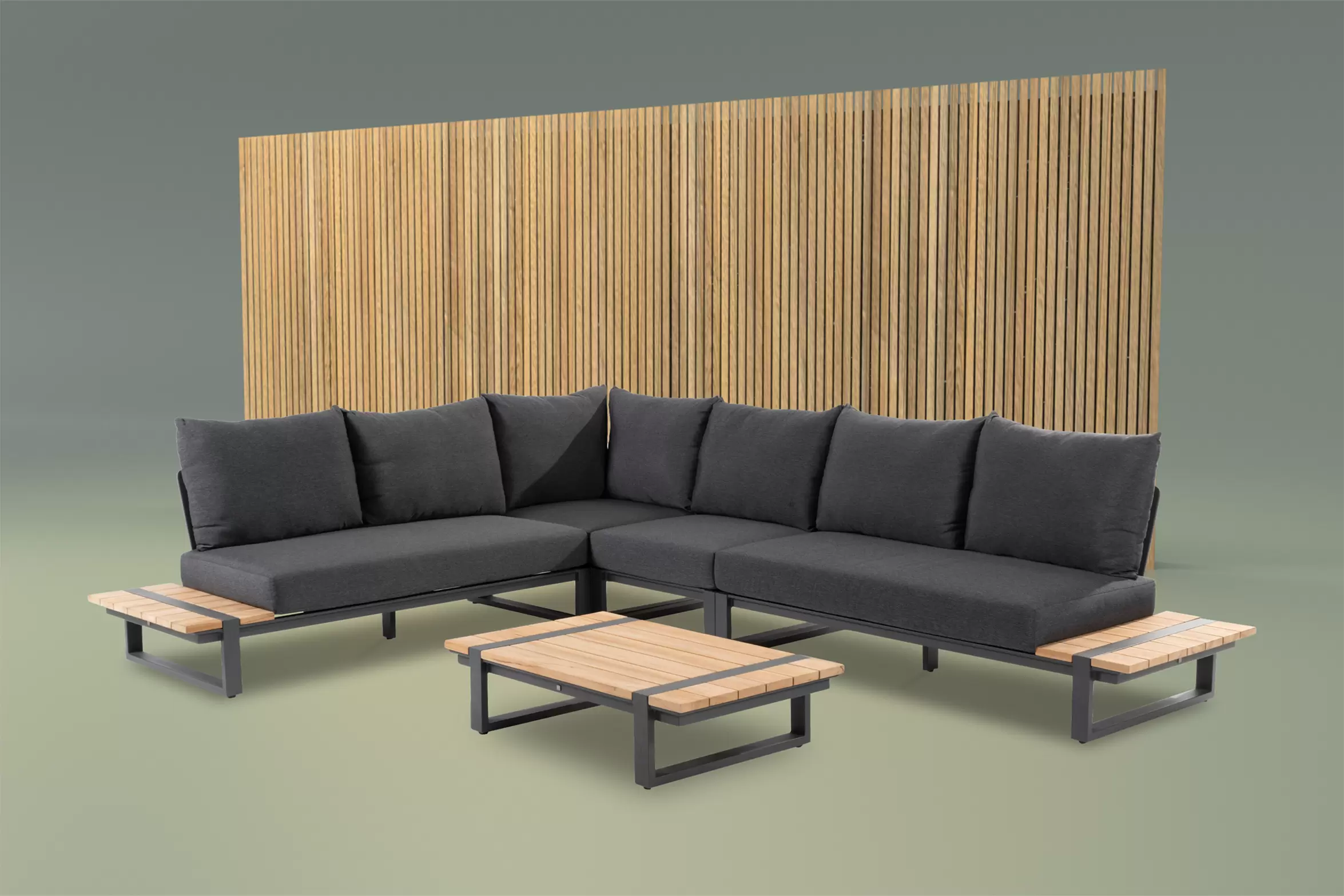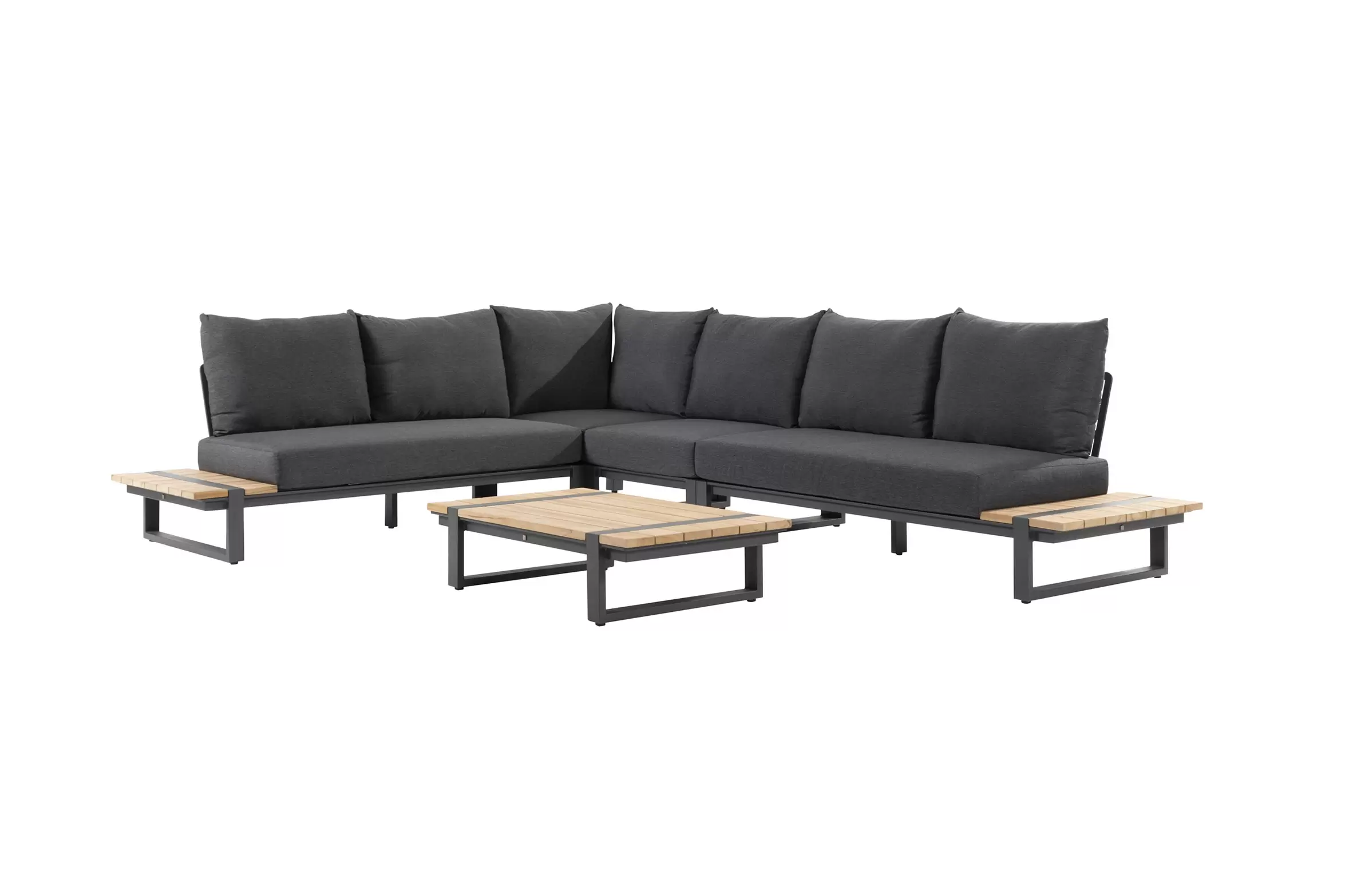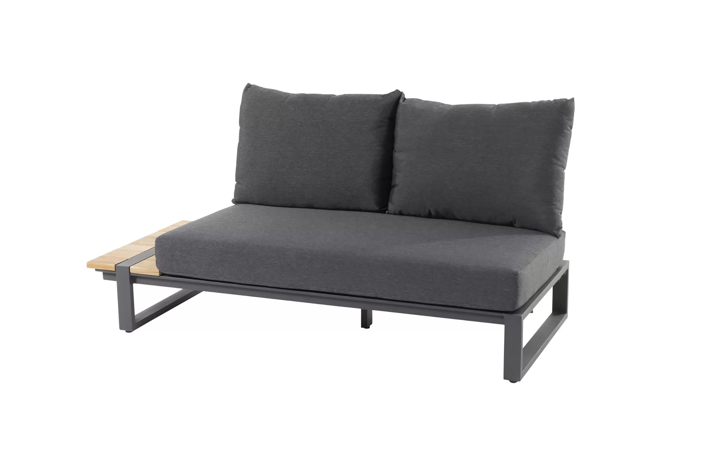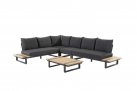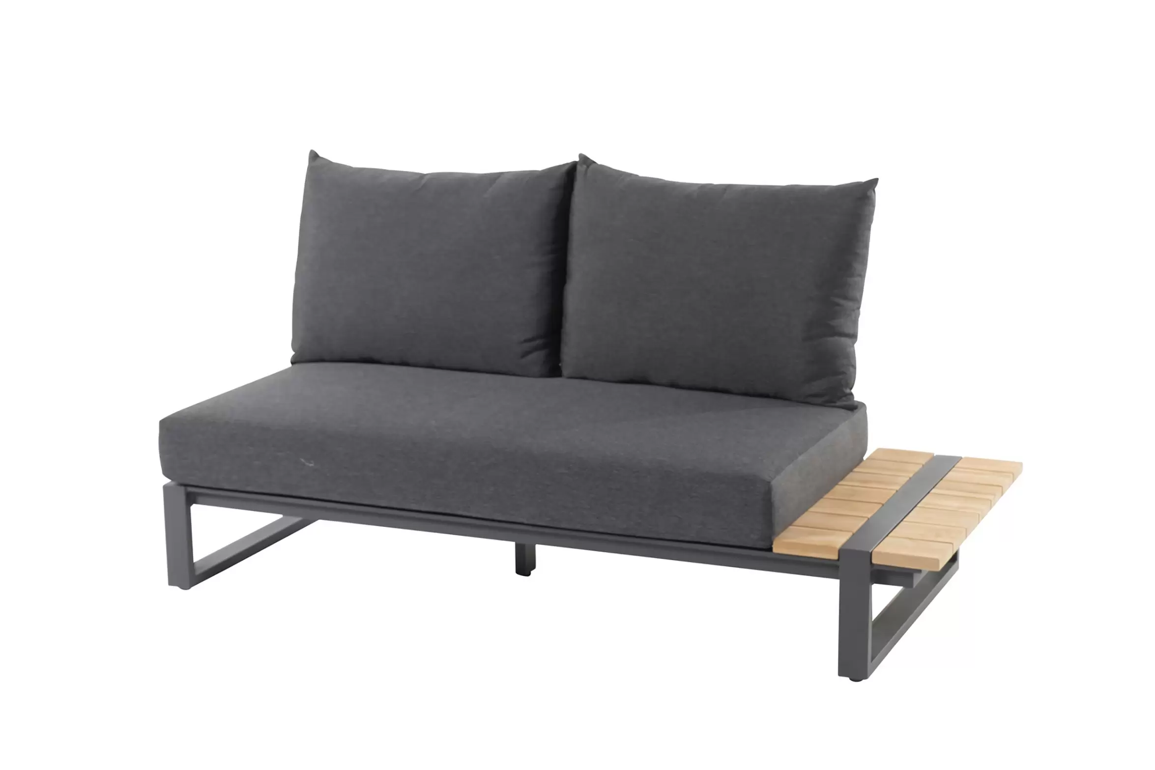 Konstrukcja aluminiowa malowana proszkowo z blatami z deseczek z drewna teakowego.