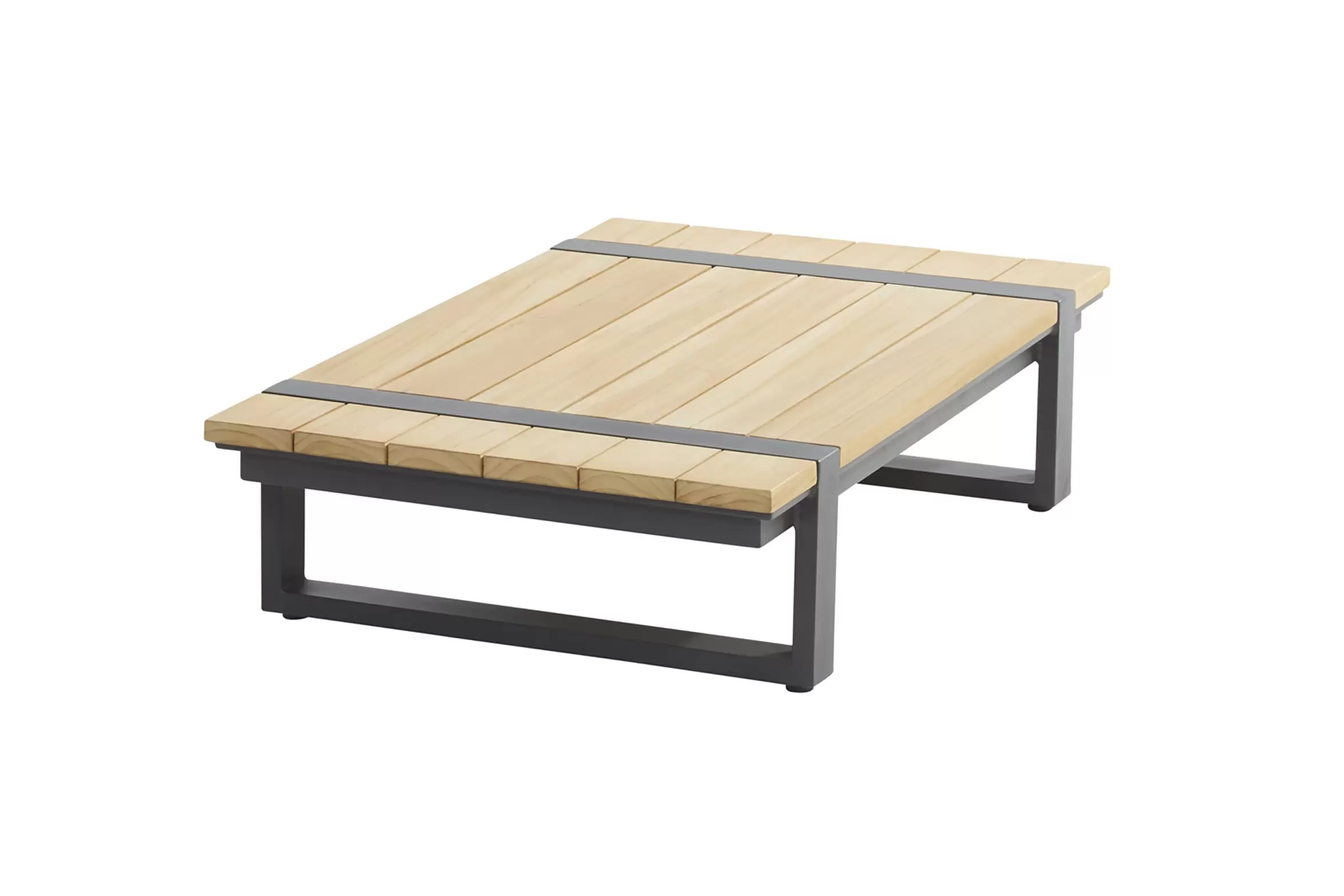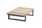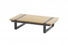 Stolik kawowy prostokątny o wysokości 25 cm i dużym blacie 150x65 cm wykonany jest w całości ze szczotkowanego drewna tekowego.