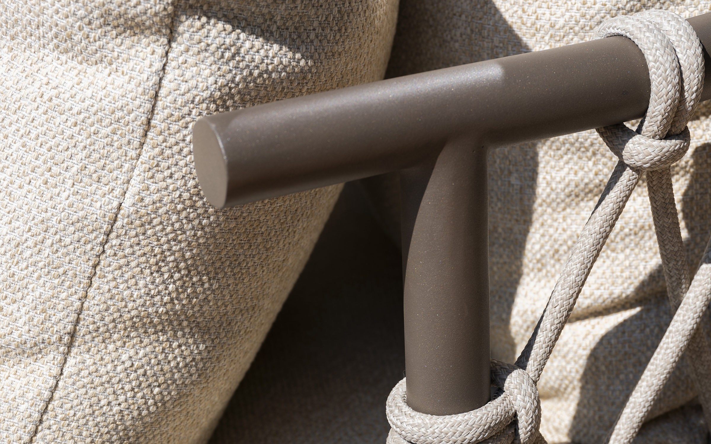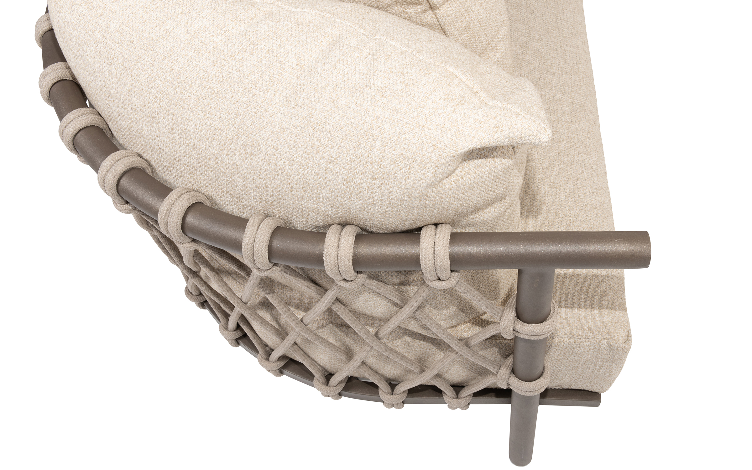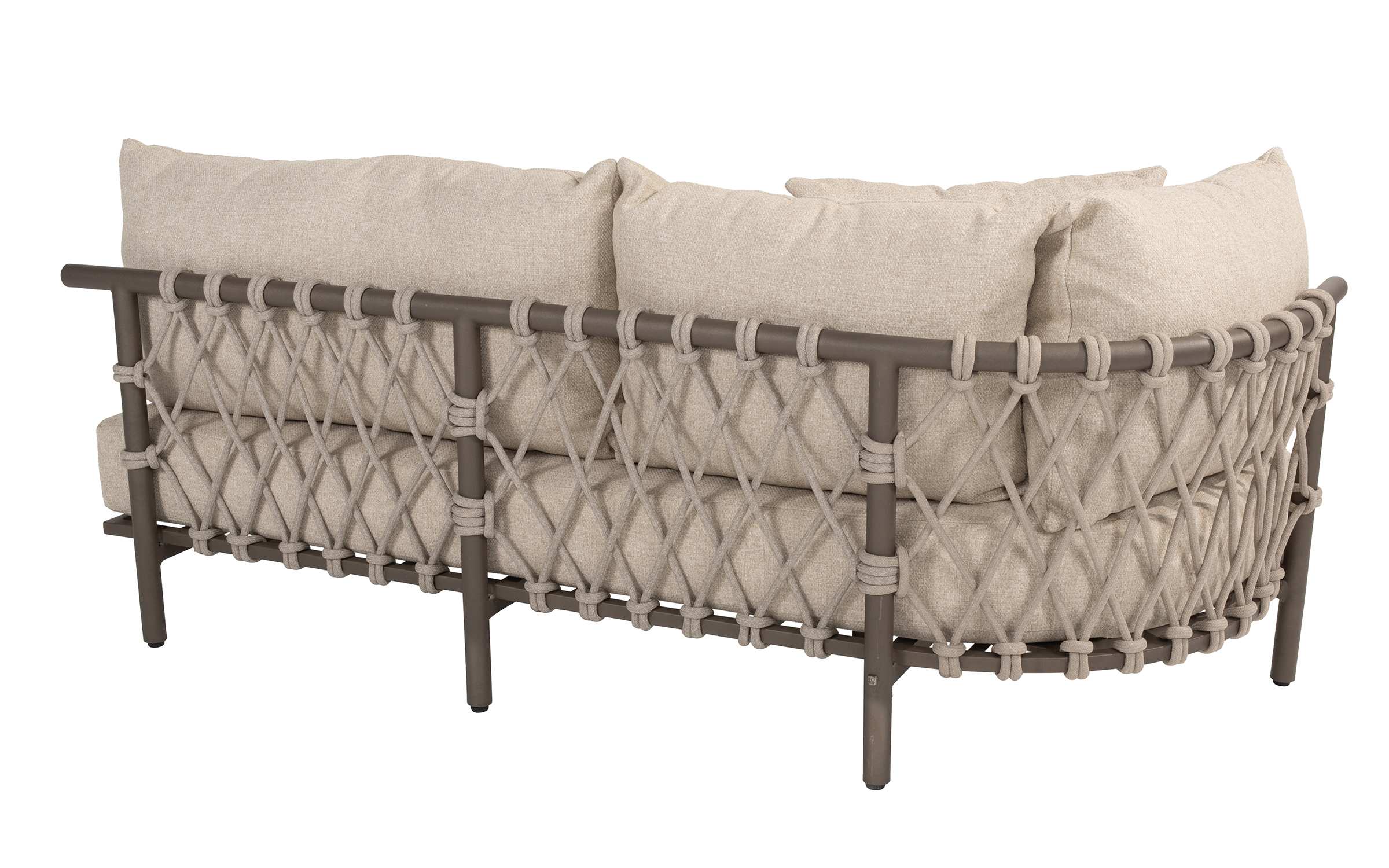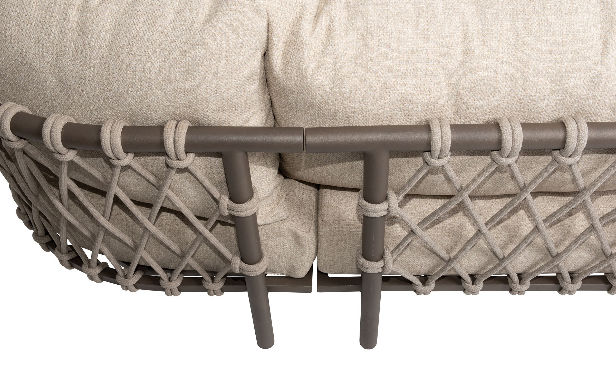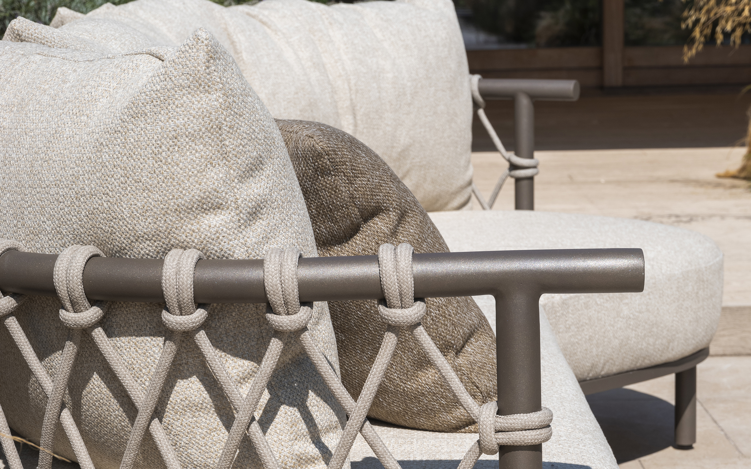 Subtelne wyplatanie ze sznurka jest w finezyjny sposób splecione z aluminiową ramą pokrytą powłoką proszkową w kolorze Terre (ciemnoszarobrazową), co nadaje tej dużej kanapie luksusowy wygląd. Bogato tapicerowane poduszki są niezwykle miękkie i oferują fantastyczny komfort siedzenia i leżenia.