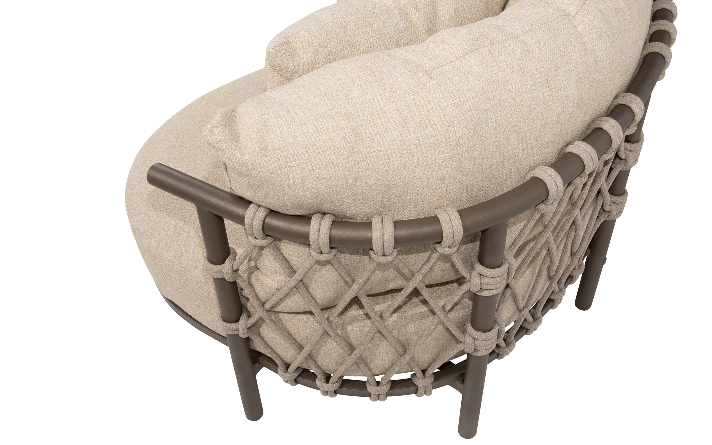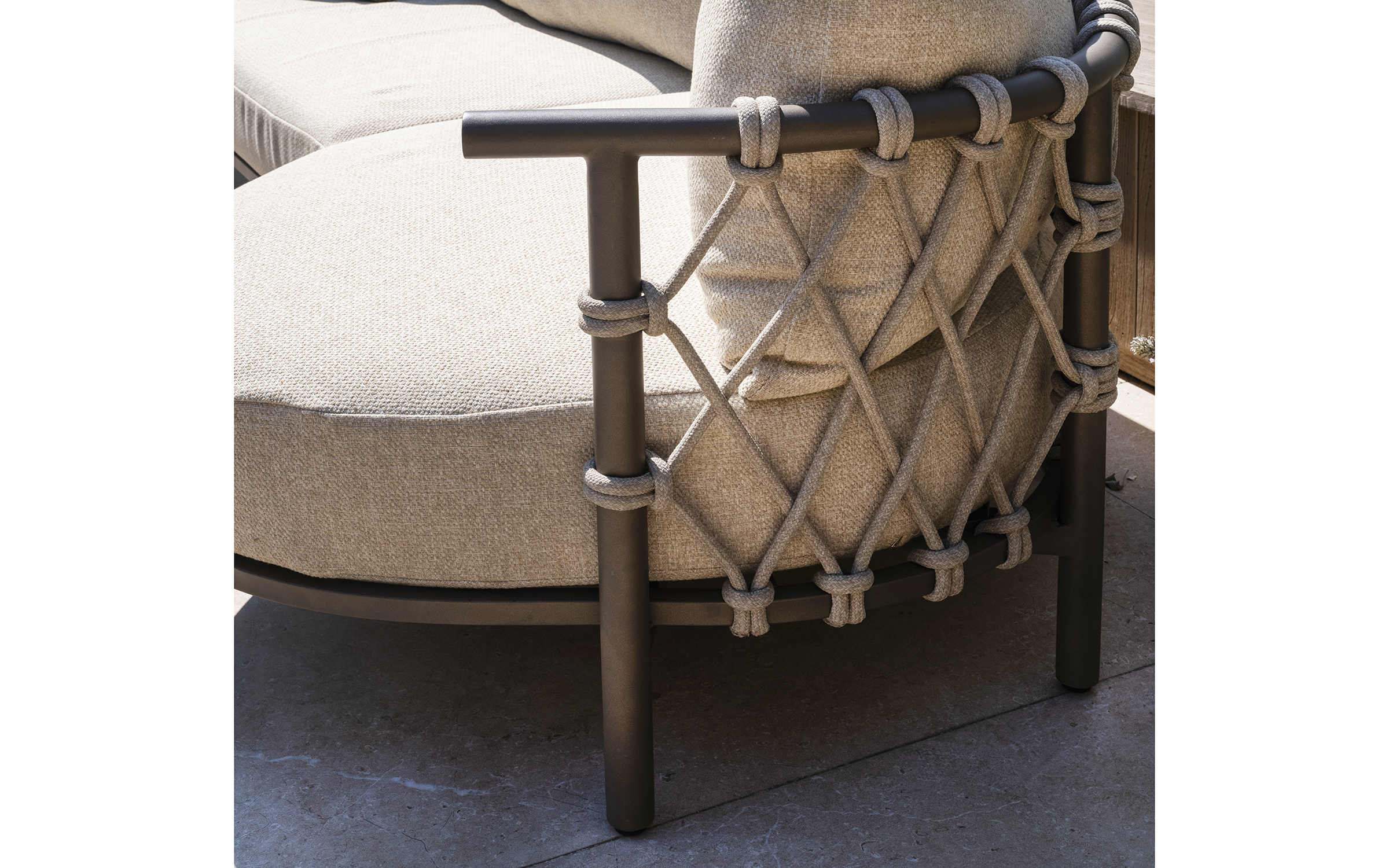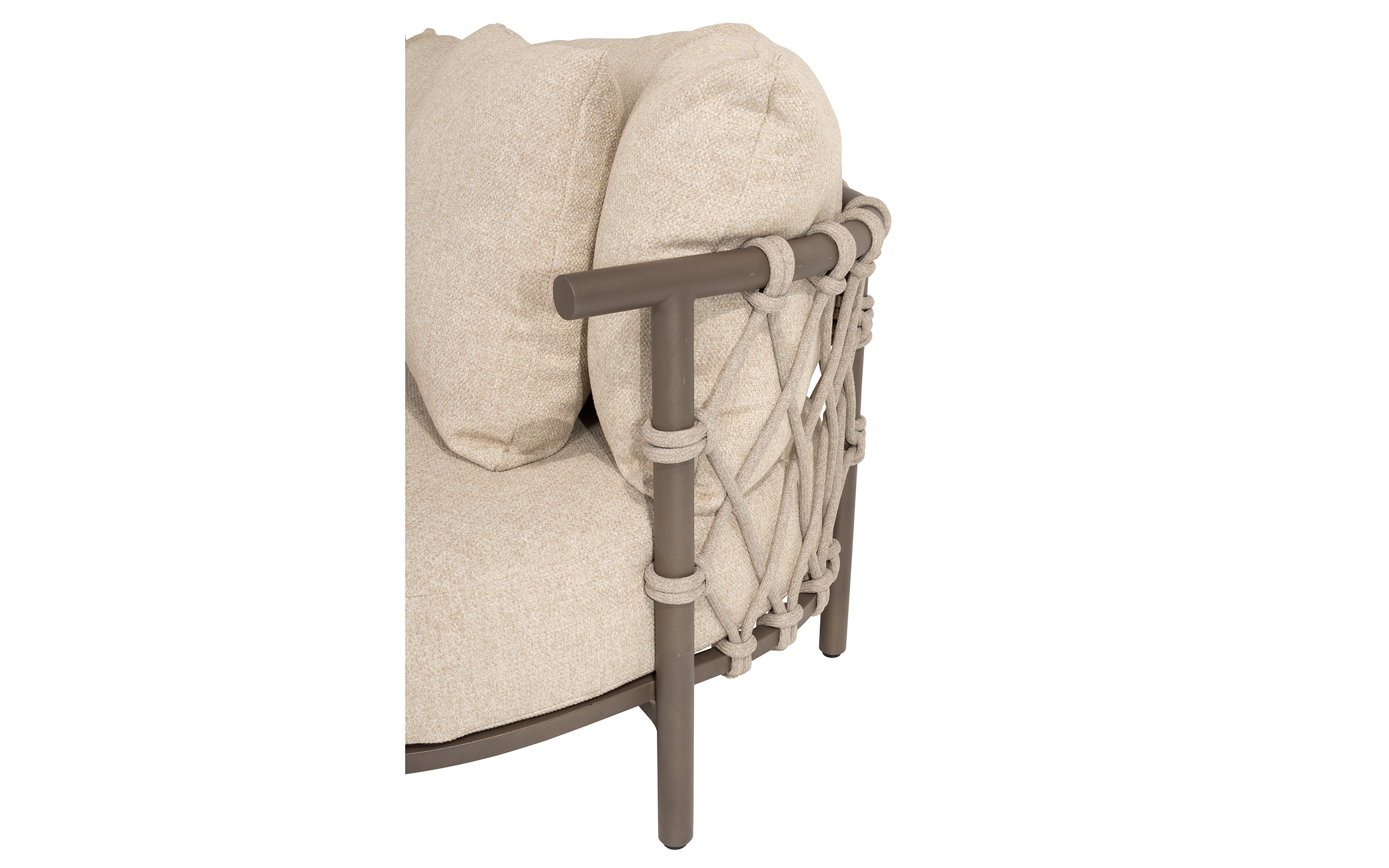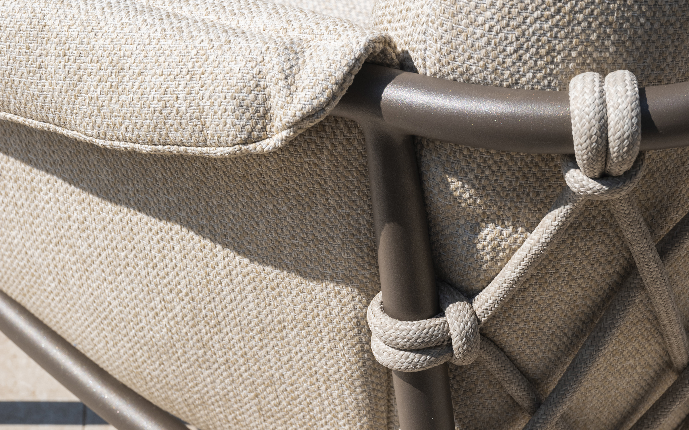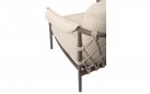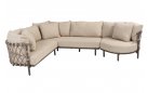 Subtelne wyplatanie ze sznurka jest w finezyjny sposób splecione z aluminiową ramą pokrytą powłoką proszkową w kolorze Terre (ciemnoszarobrazową), co nadaje tej dużej kanapie luksusowy wygląd. Bogato tapicerowane poduszki są niezwykle miękkie i oferują fantastyczny komfort siedzenia i leżenia.