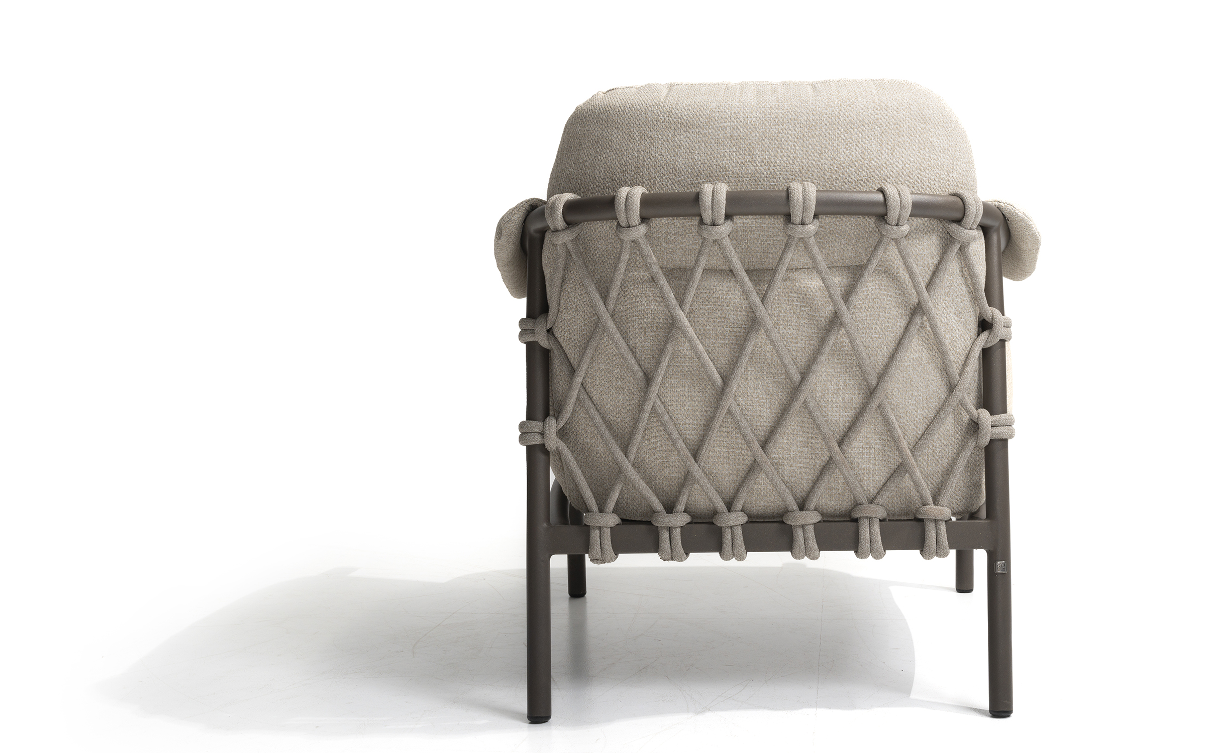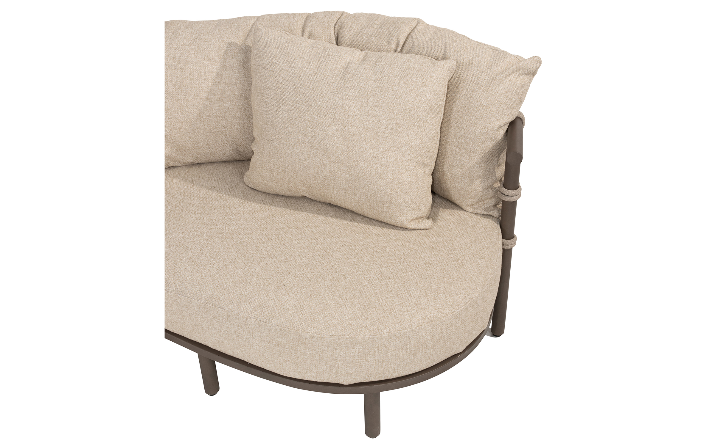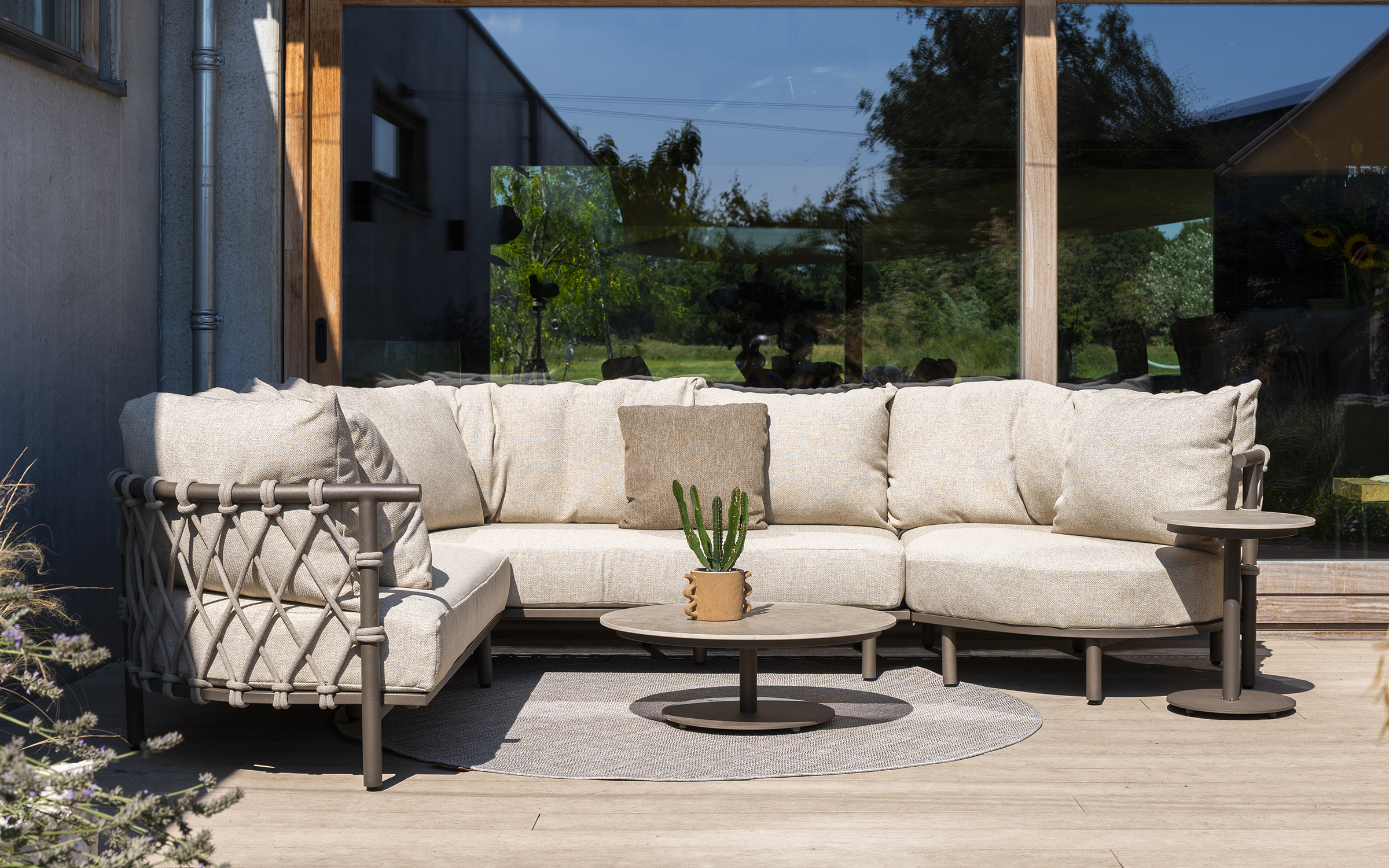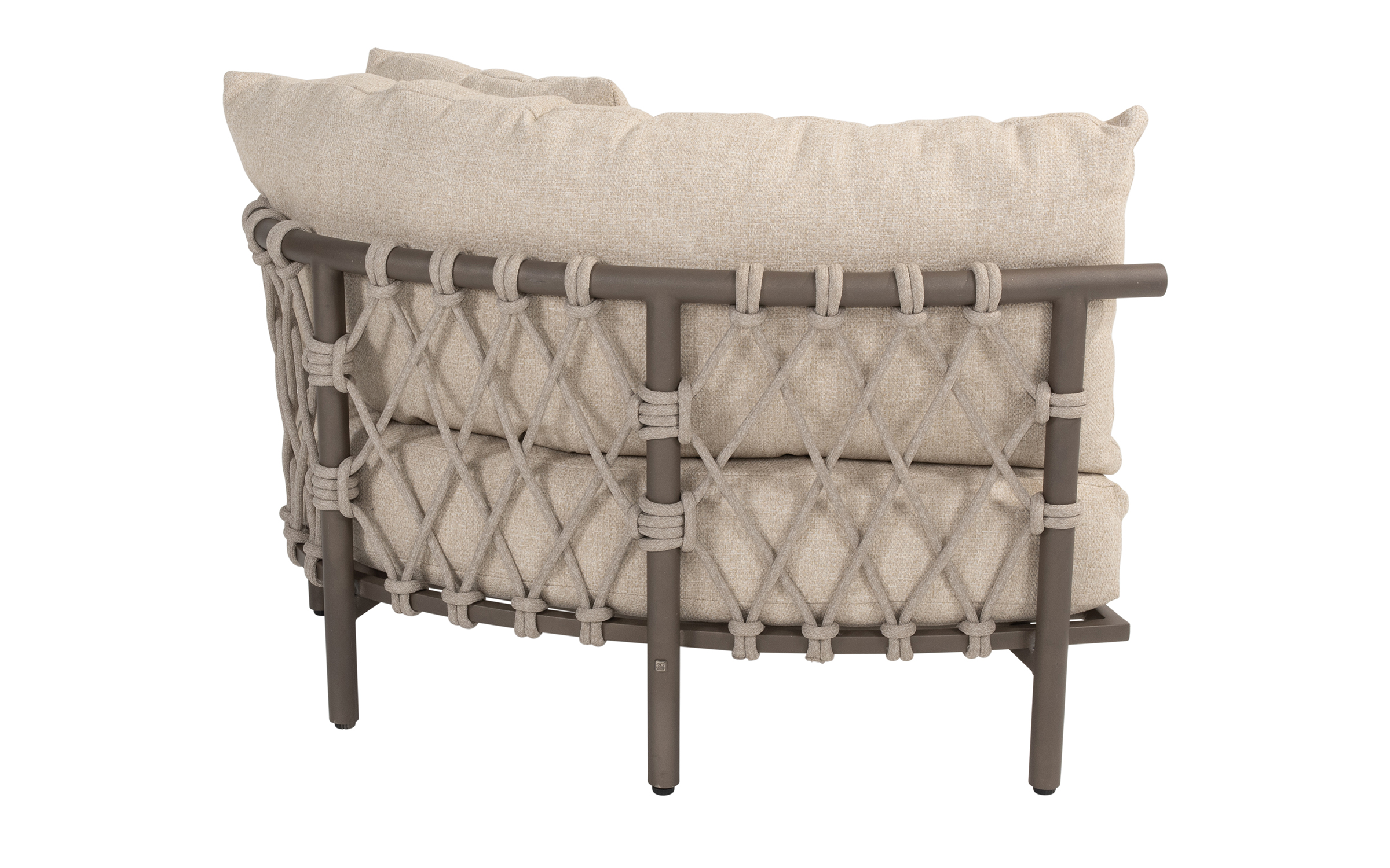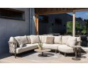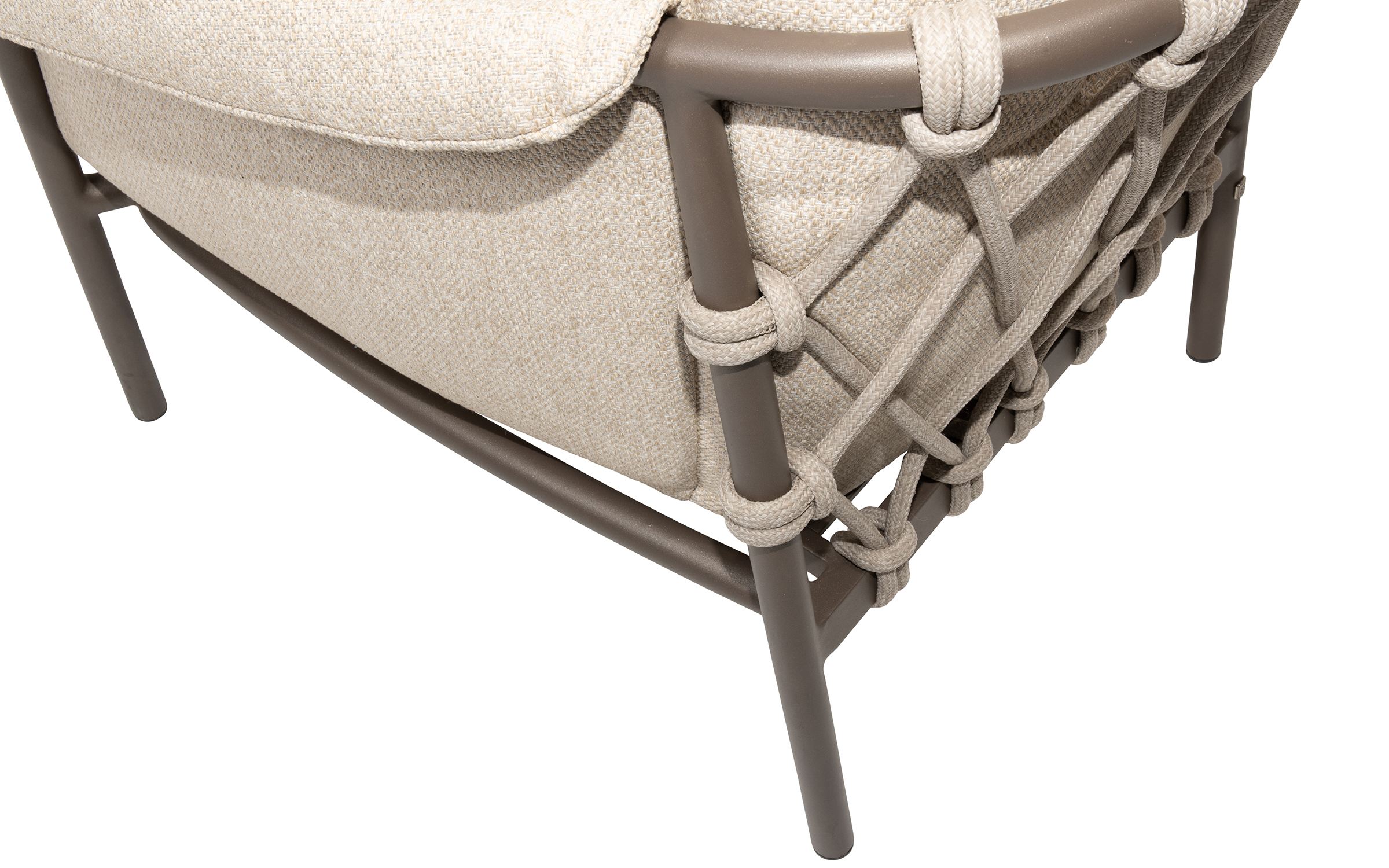 Subtelne wyplatanie ze sznurka jest w finezyjny sposób splecione z aluminiową ramą pokrytą powłoką proszkową w kolorze Terre (ciemnoszarobrazową), co nadaje tej dużej kanapie luksusowy wygląd. Bogato tapicerowane poduszki są niezwykle miękkie i oferują fantastyczny komfort siedzenia i leżenia.