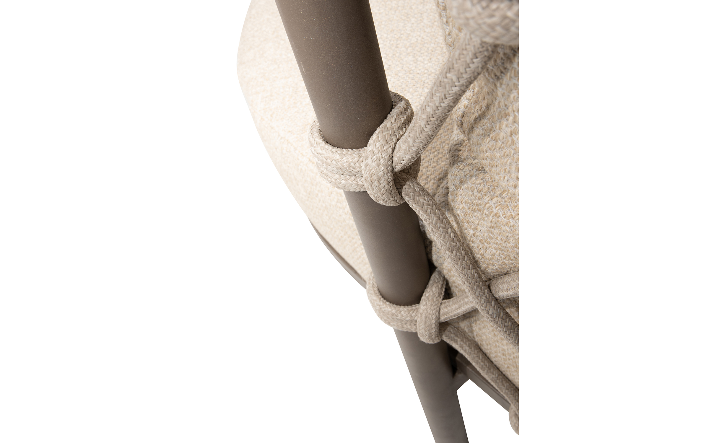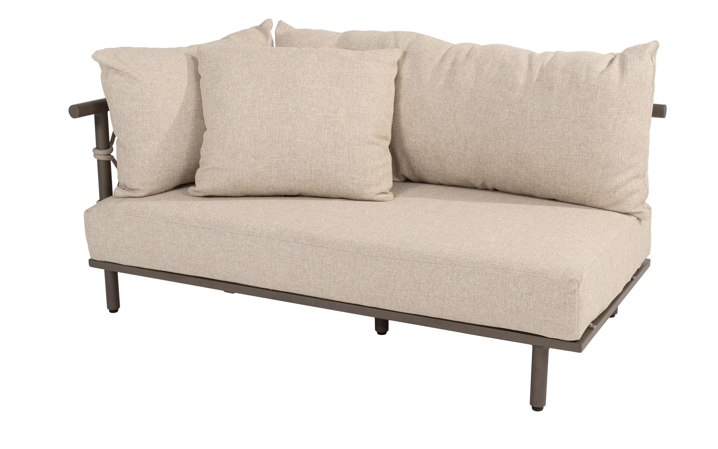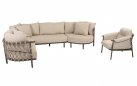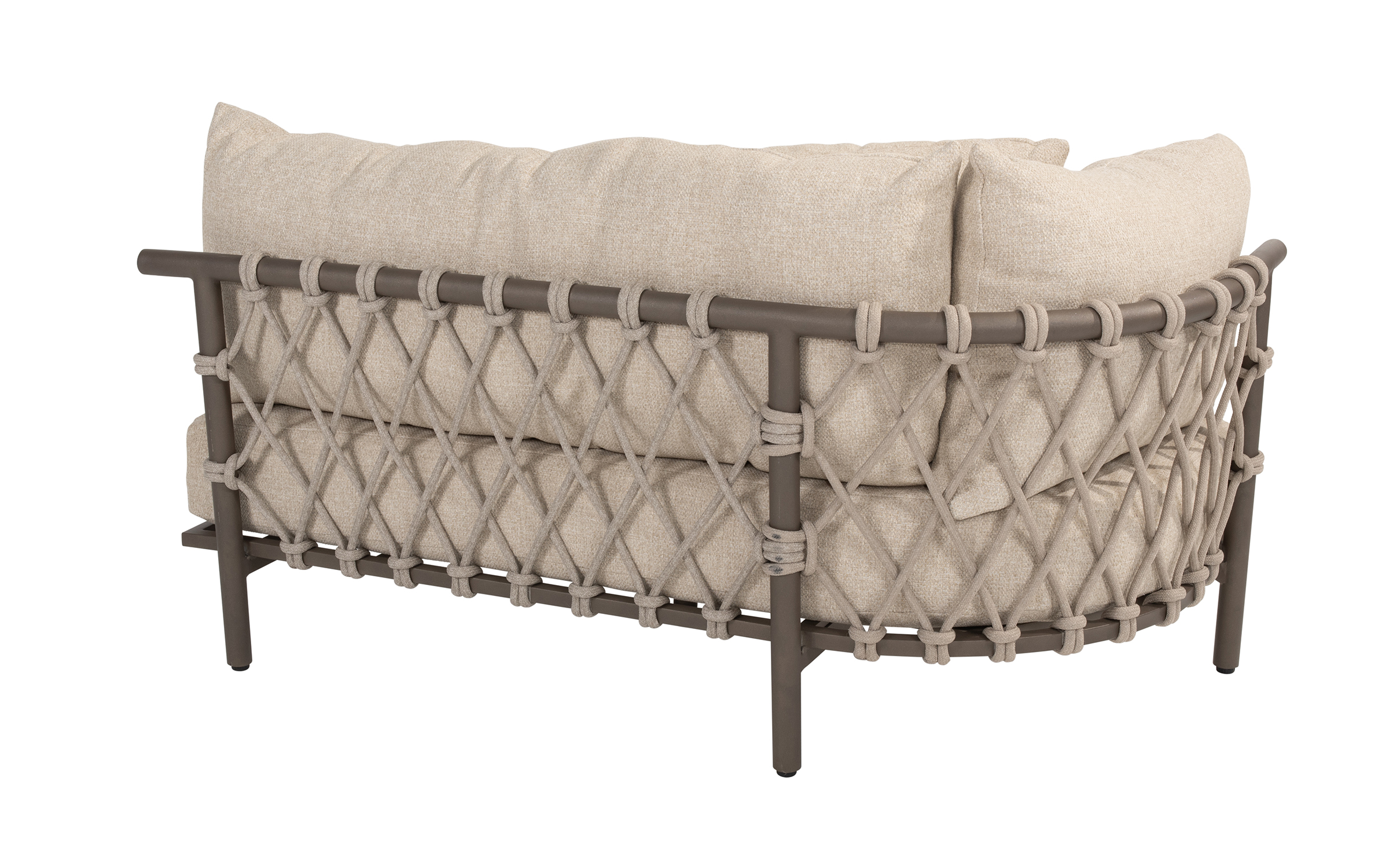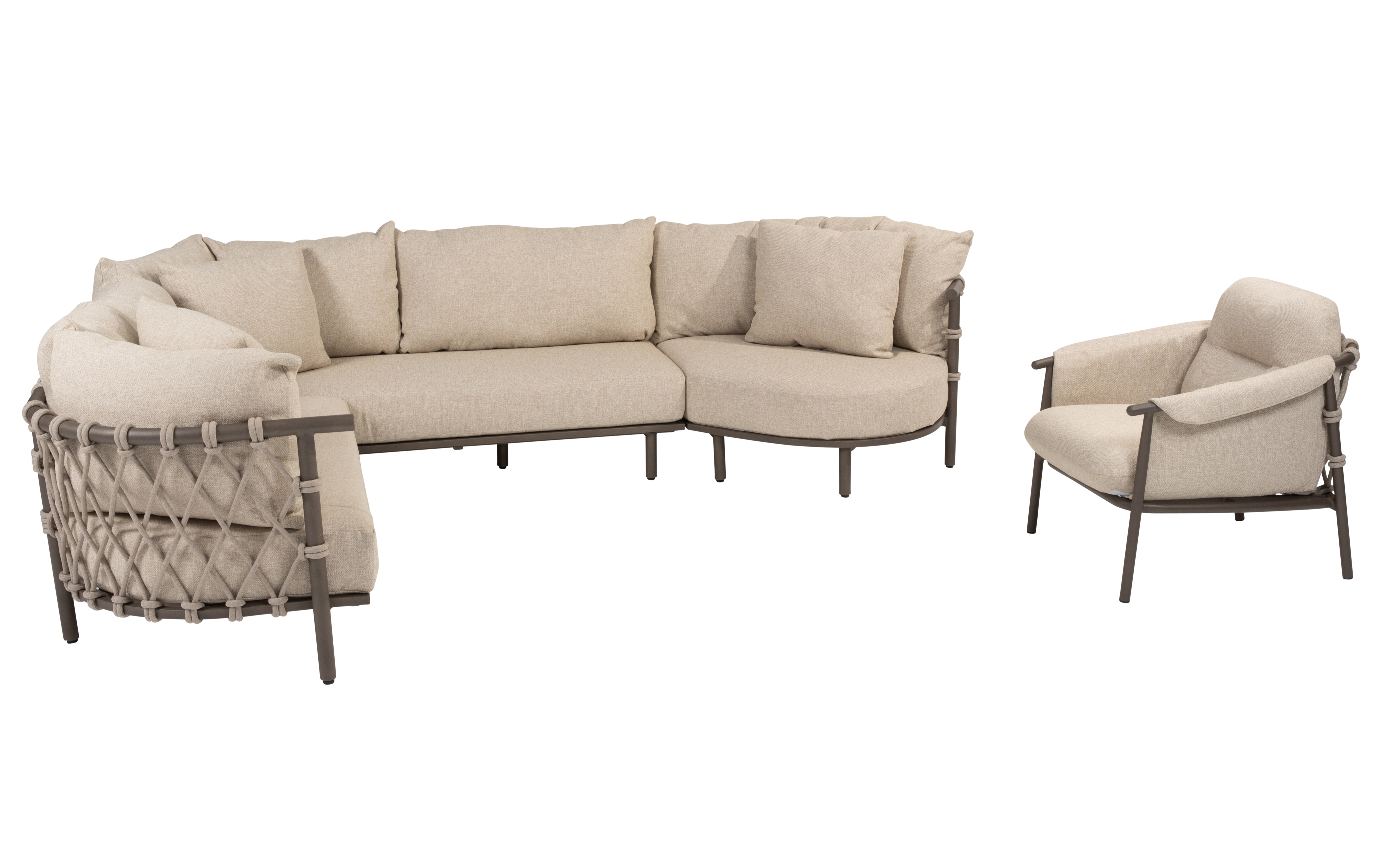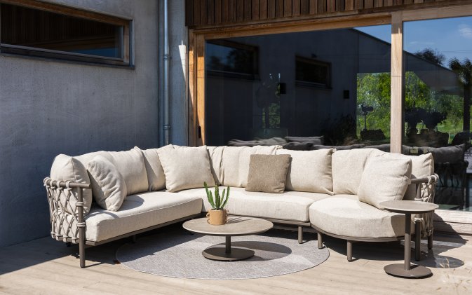 Subtelne wyplatanie ze sznurka jest w finezyjny sposób splecione z aluminiową ramą pokrytą powłoką proszkową w kolorze Terre (ciemnoszarobrazową), co nadaje tej dużej kanapie luksusowy wygląd. Bogato tapicerowane poduszki są niezwykle miękkie i oferują fantastyczny komfort siedzenia i leżenia.