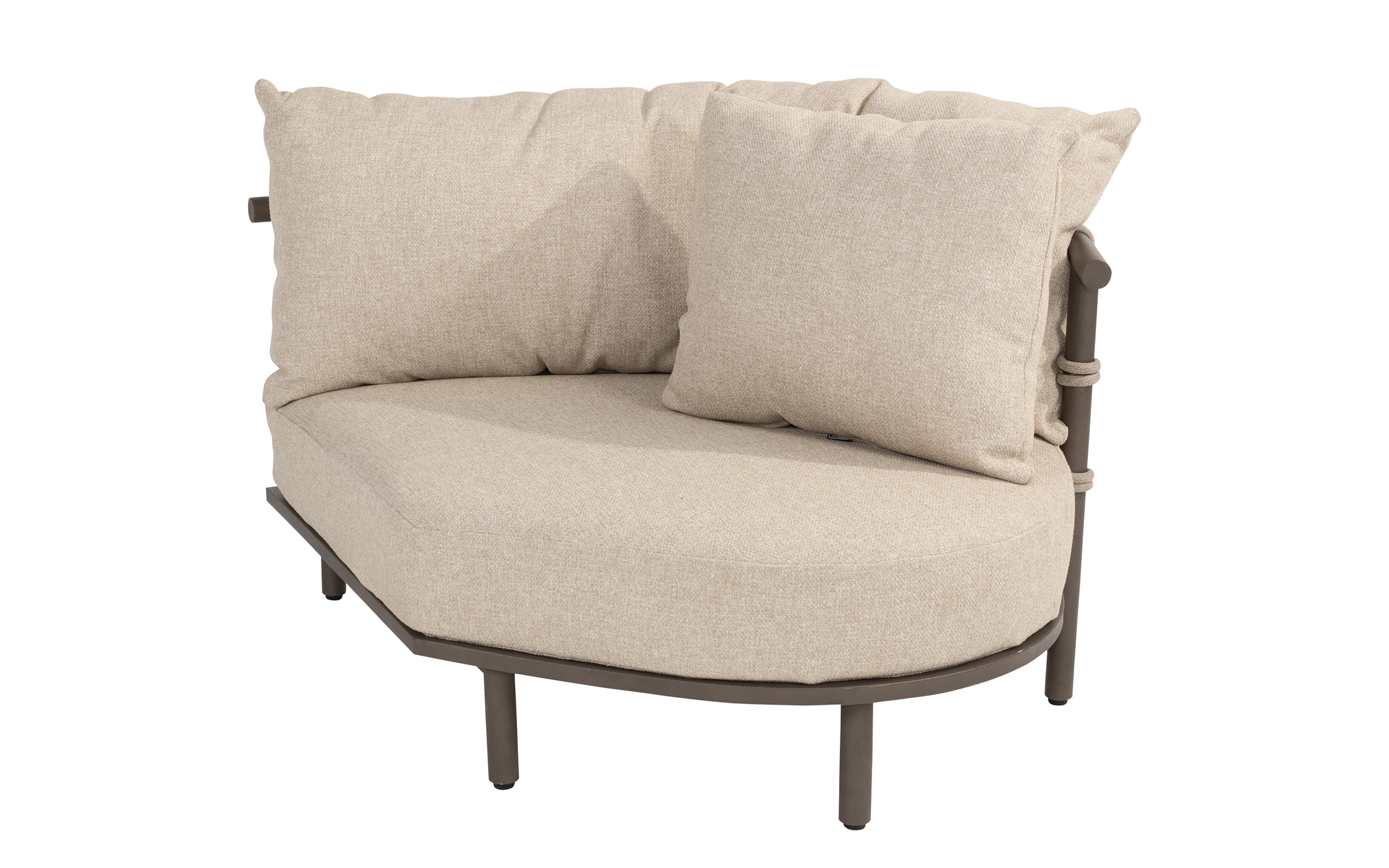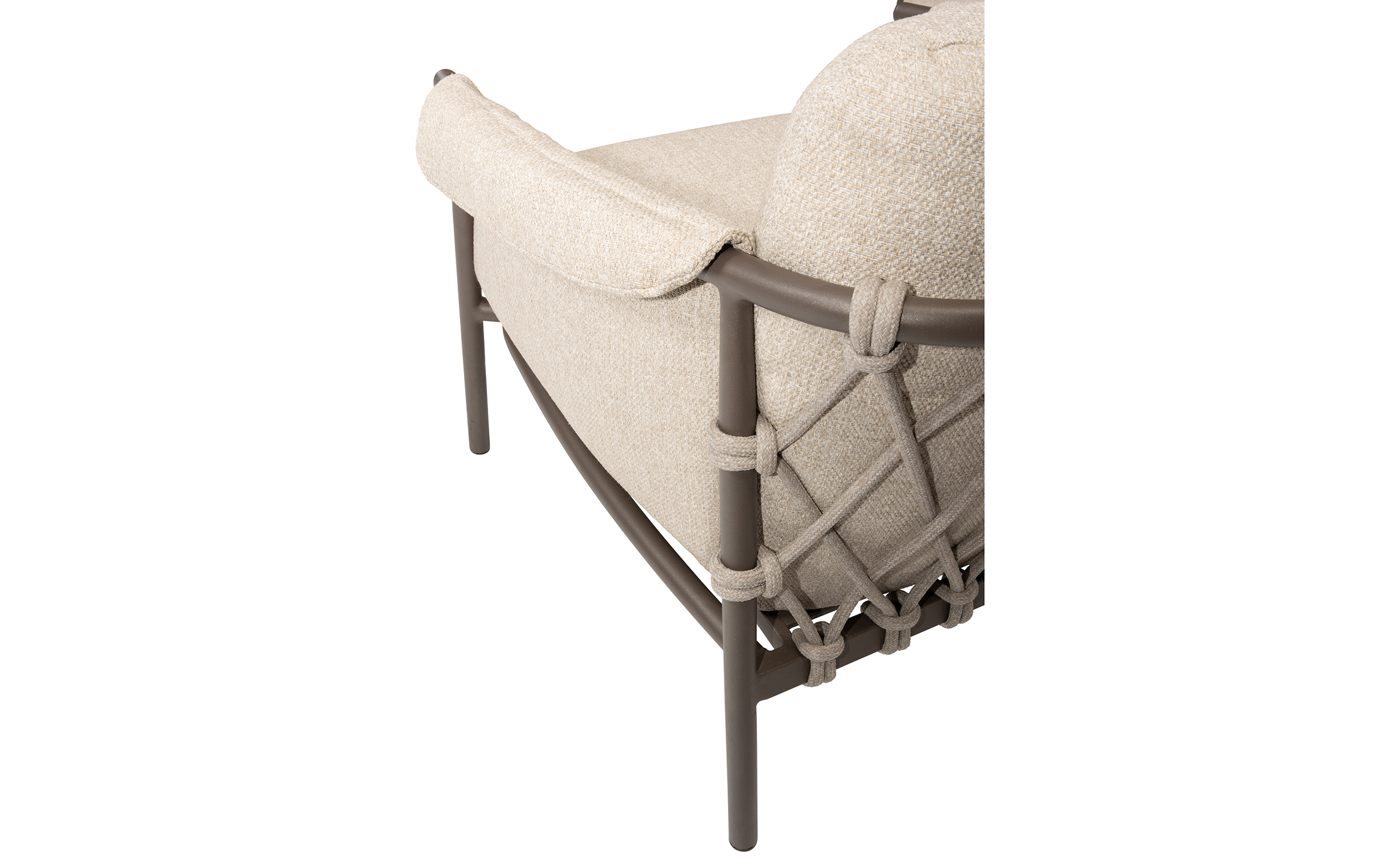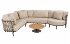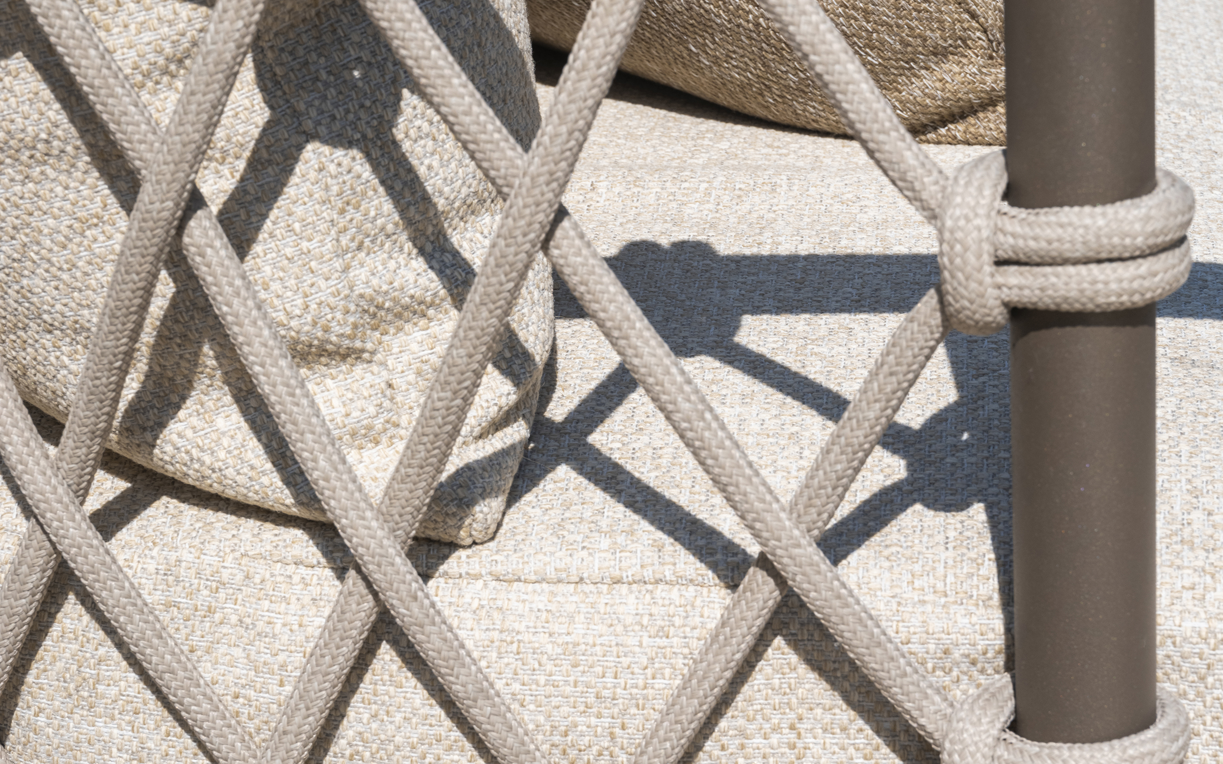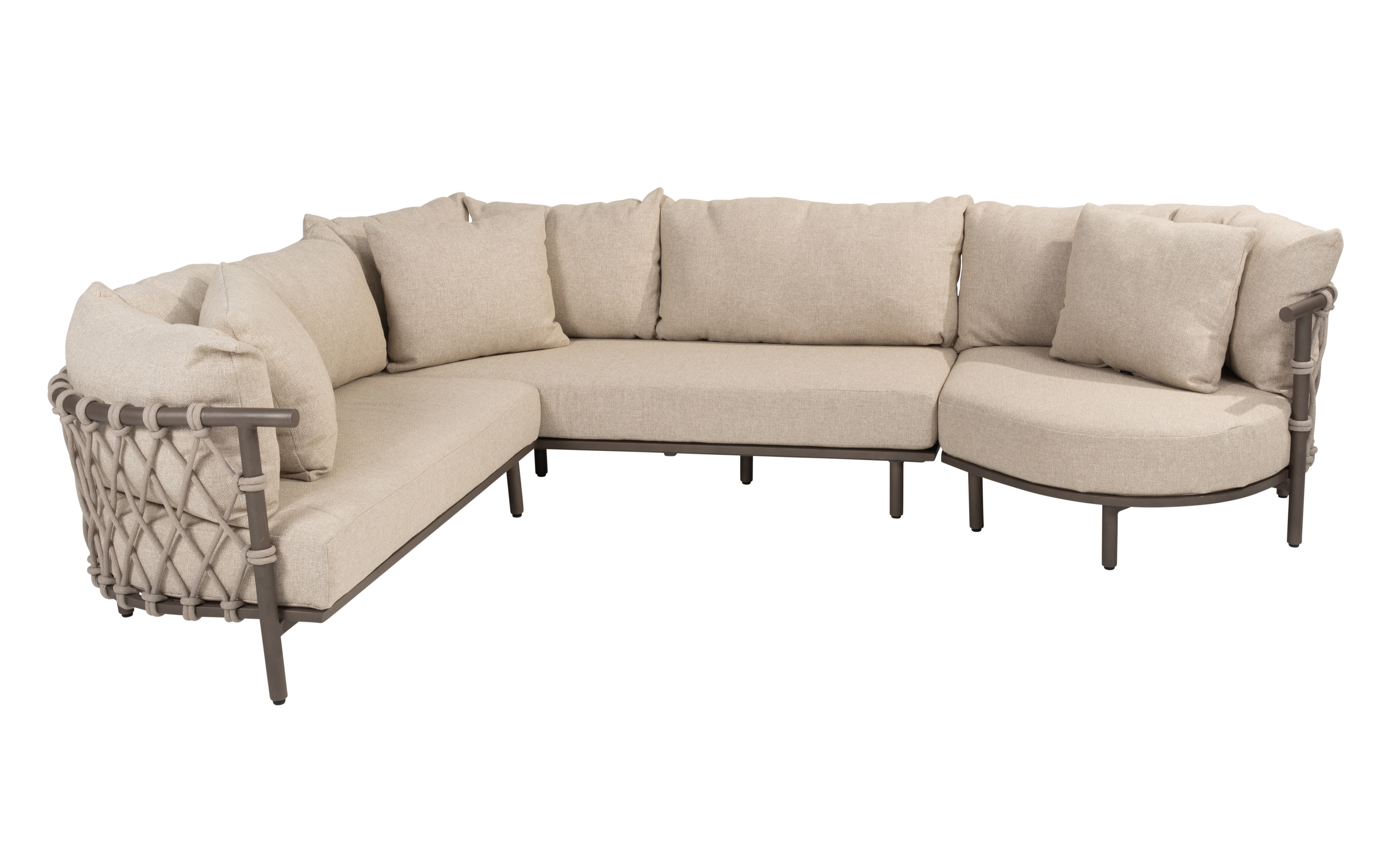 Subtelne wyplatanie ze sznurka jest w finezyjny sposób splecione z aluminiową ramą pokrytą powłoką proszkową w kolorze Terre (ciemnoszarobrazową), co nadaje tej dużej kanapie luksusowy wygląd. Bogato tapicerowane poduszki są niezwykle miękkie i oferują fantastyczny komfort siedzenia i leżenia.