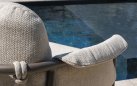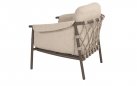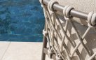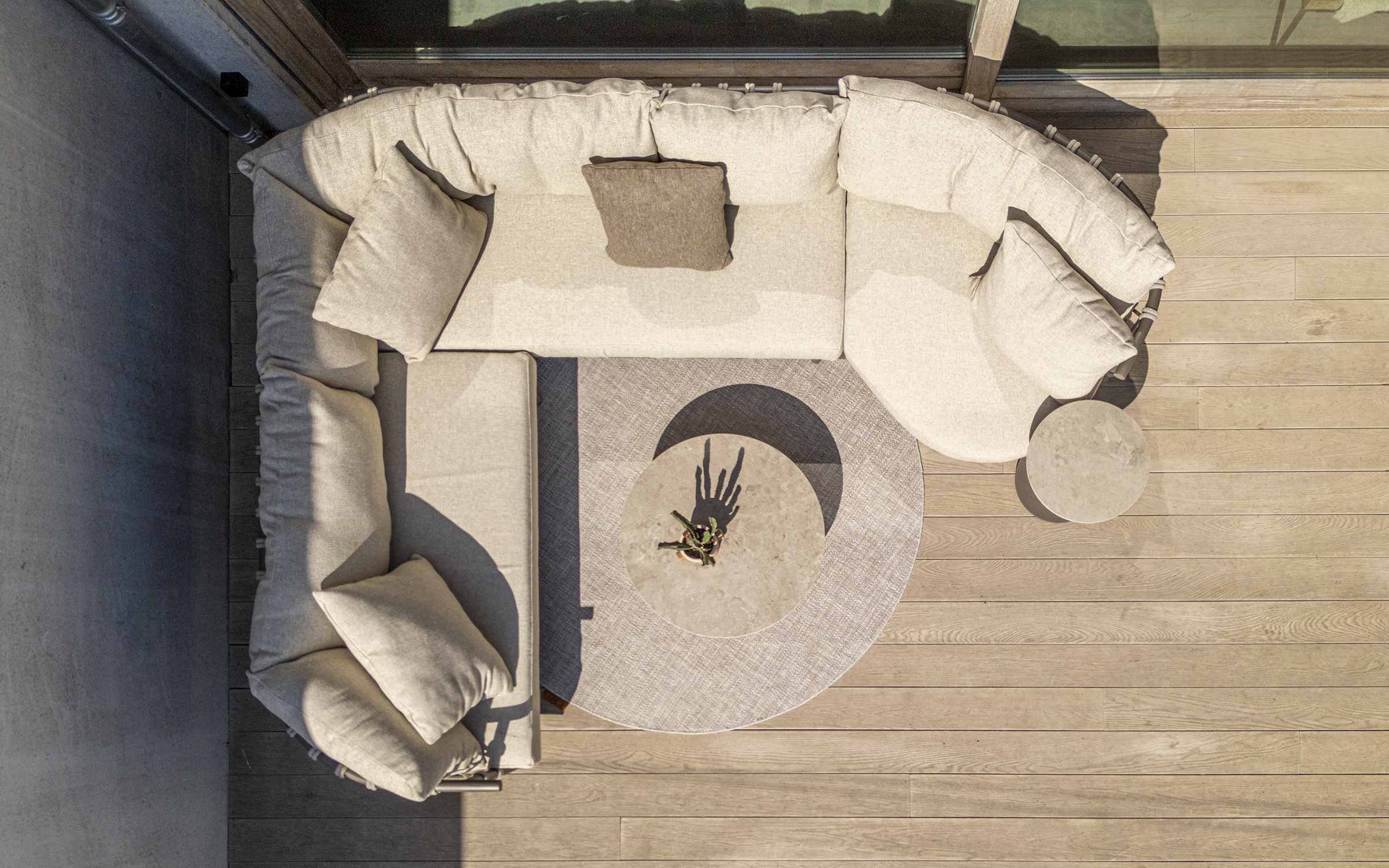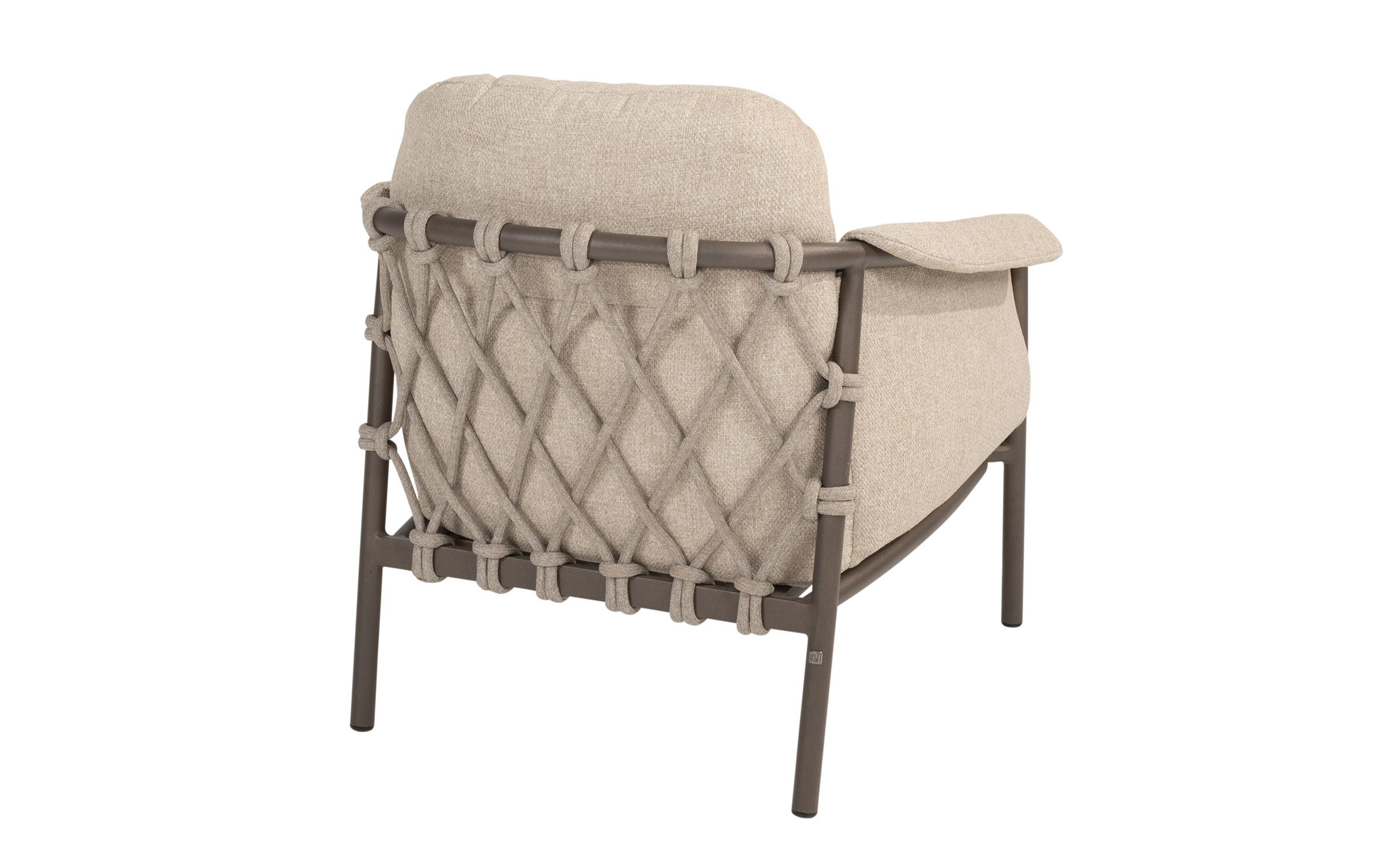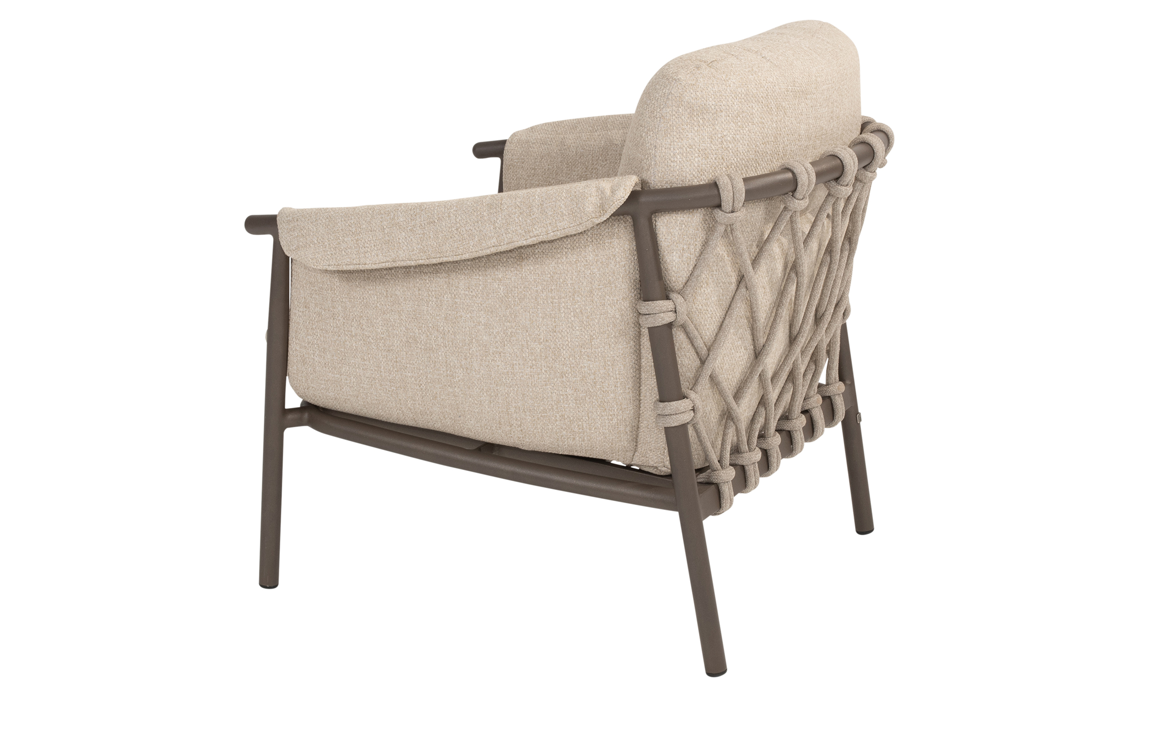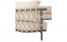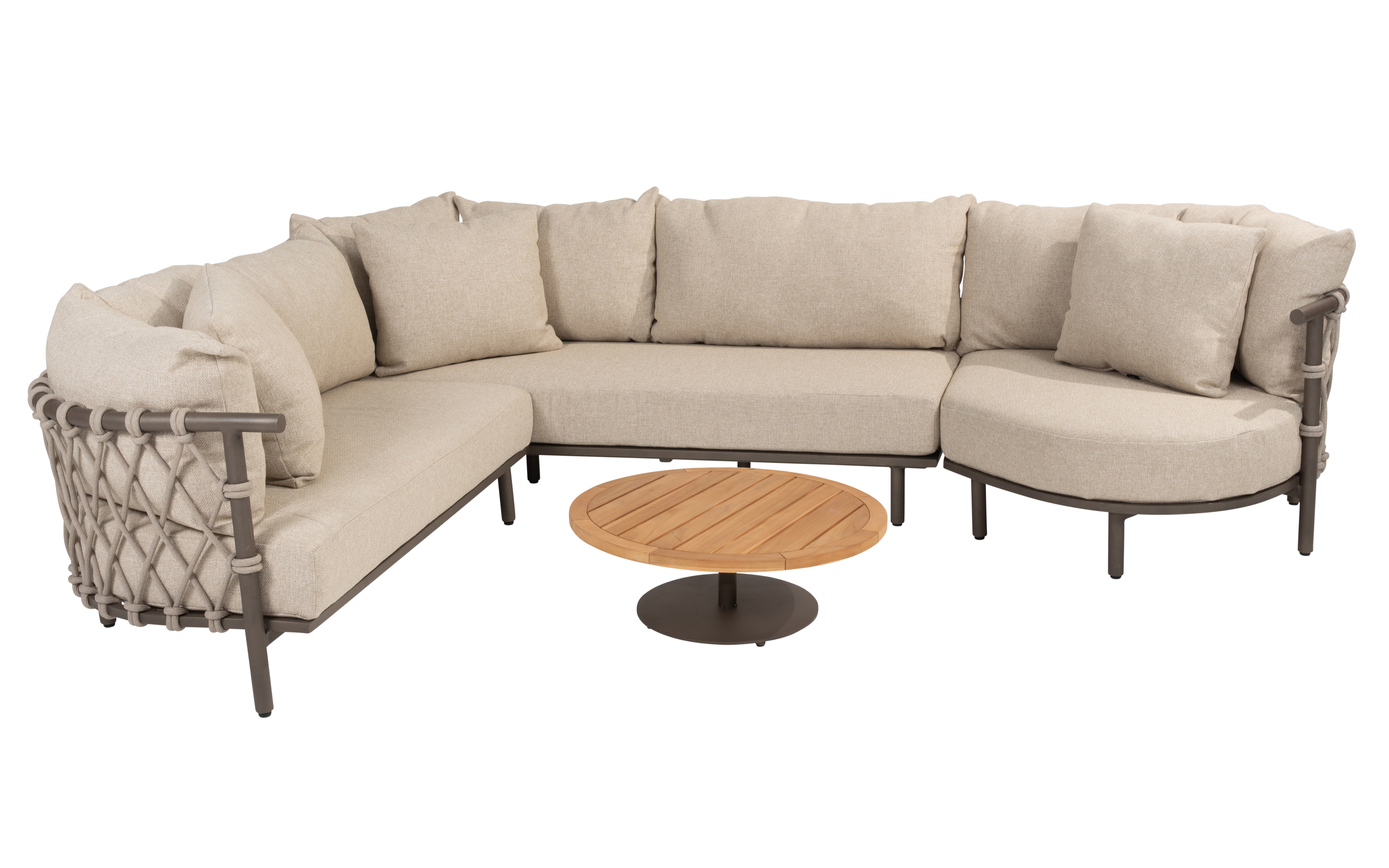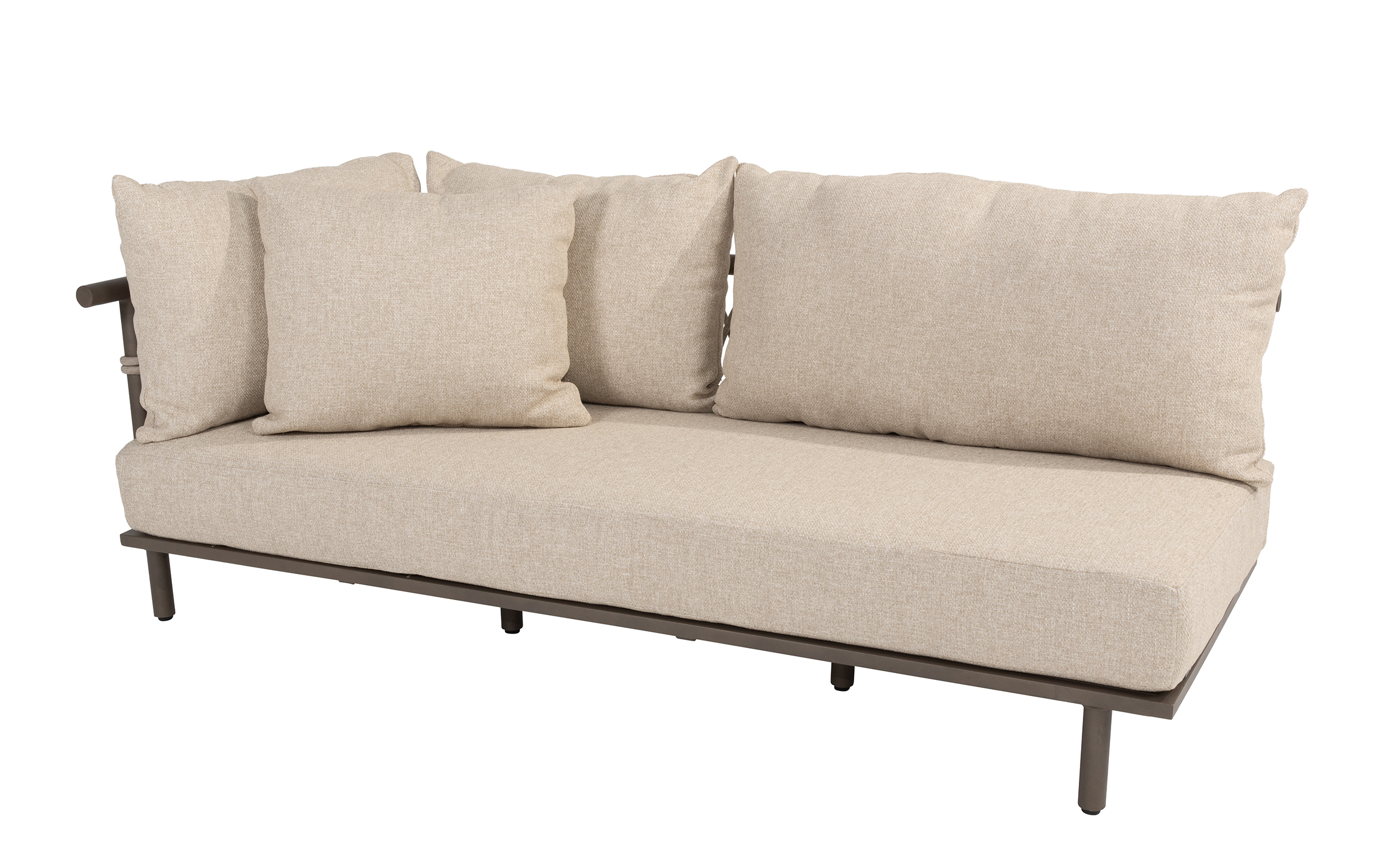 Subtelne wyplatanie ze sznurka jest w finezyjny sposób splecione z aluminiową ramą pokrytą powłoką proszkową w kolorze Terre (ciemnoszarobrazową), co nadaje tej dużej kanapie luksusowy wygląd. Bogato tapicerowane poduszki są niezwykle miękkie i oferują fantastyczny komfort siedzenia i leżenia.
