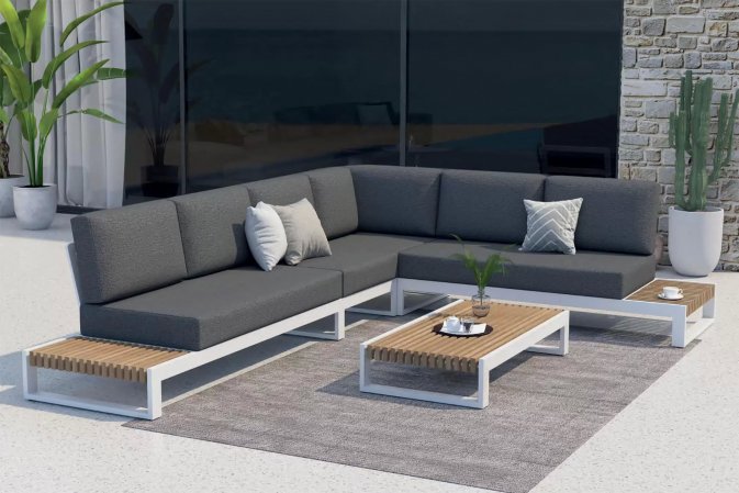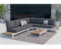Eleganckie elementy z drewna tekowego w części platformy oraz w stoliku kawowym. Narożnik Kioto wyposażony jest w wygodne poduszki na każdą pogodę - są odporne na deszcz.