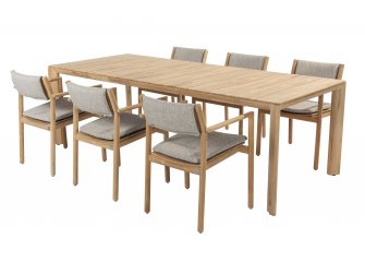 Stół ogrodowy został wyprodukowany z ekologicznego drewna tekowego pochodzącego z certyfikowanych plantacji. Drewno tekowe doskonale nadaje się do użytku na zewnątrz i jest odporne na wpływy atmosferyczne. Zalecamy jednak regularną pielęgnację drewna w celu uzyskania pięknego wyglądu. Bez konserwacji teak staje się szary i srebrzysty, a także podatny na plamy. Dzięki produktom do pielęgnacji 4 Seasons Outdoor z łatwością utrzymasz meble z drewna tekowego w doskonałym stanie!