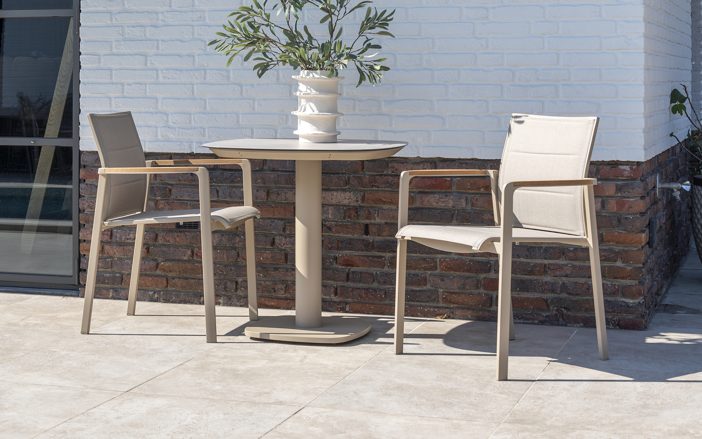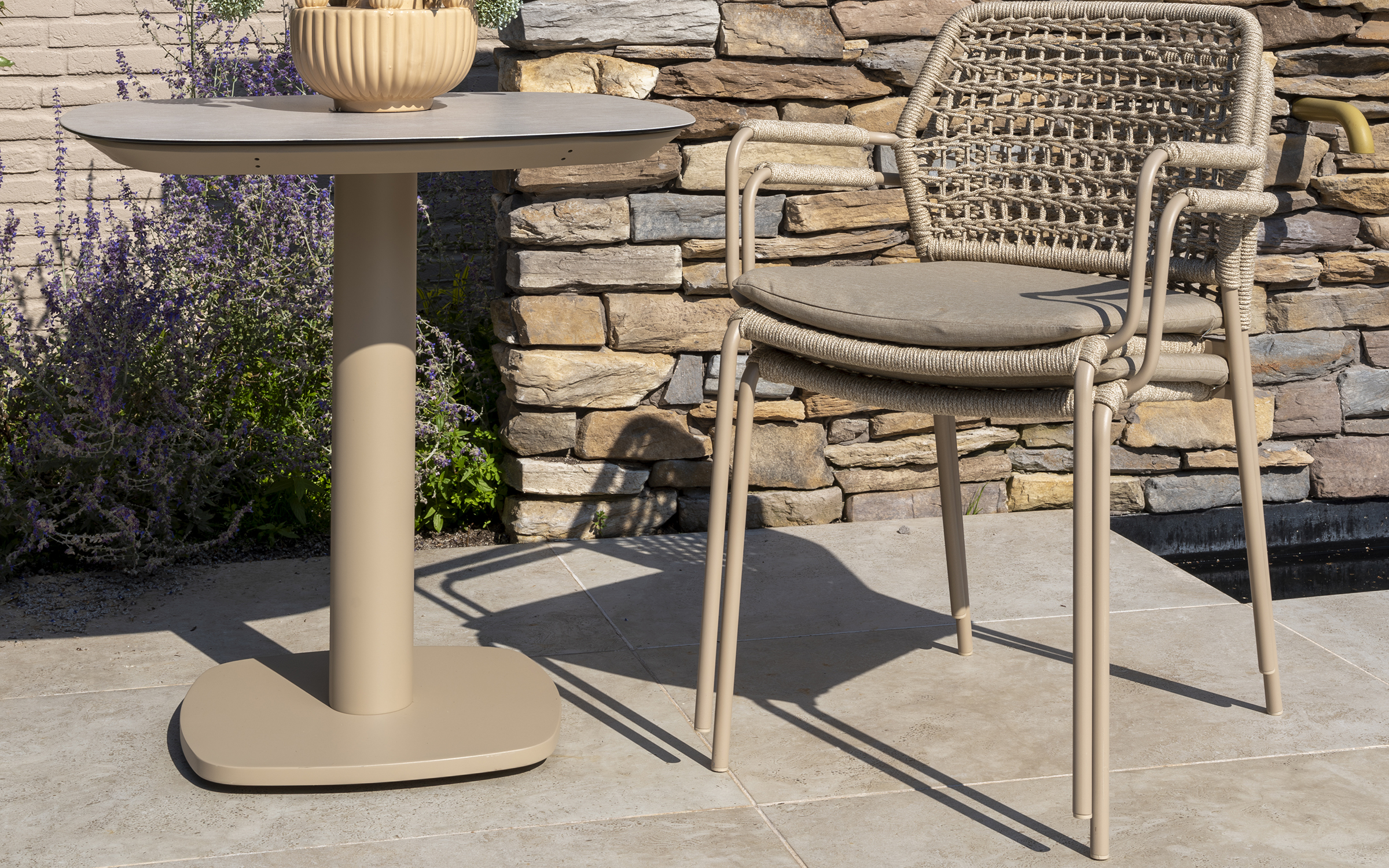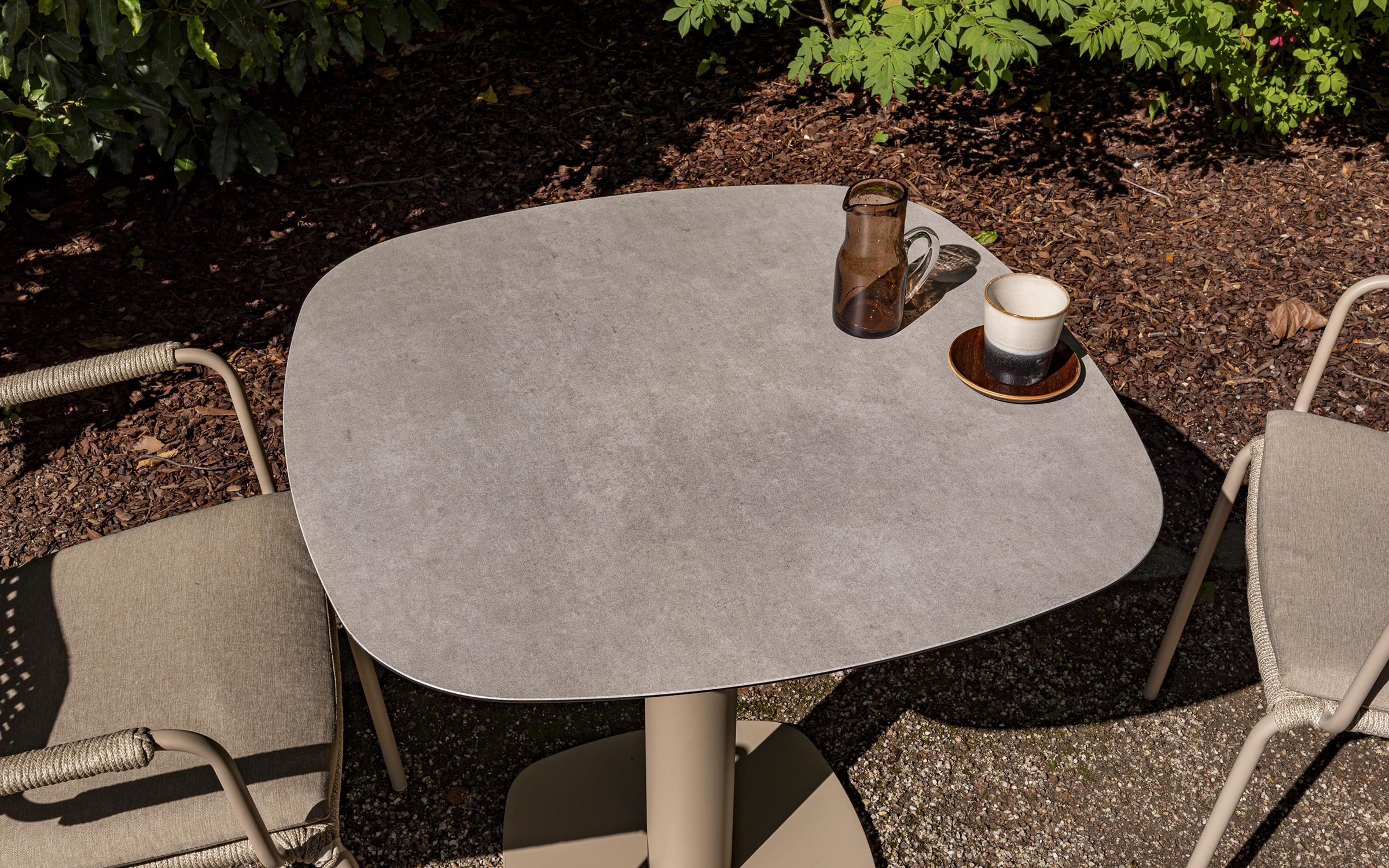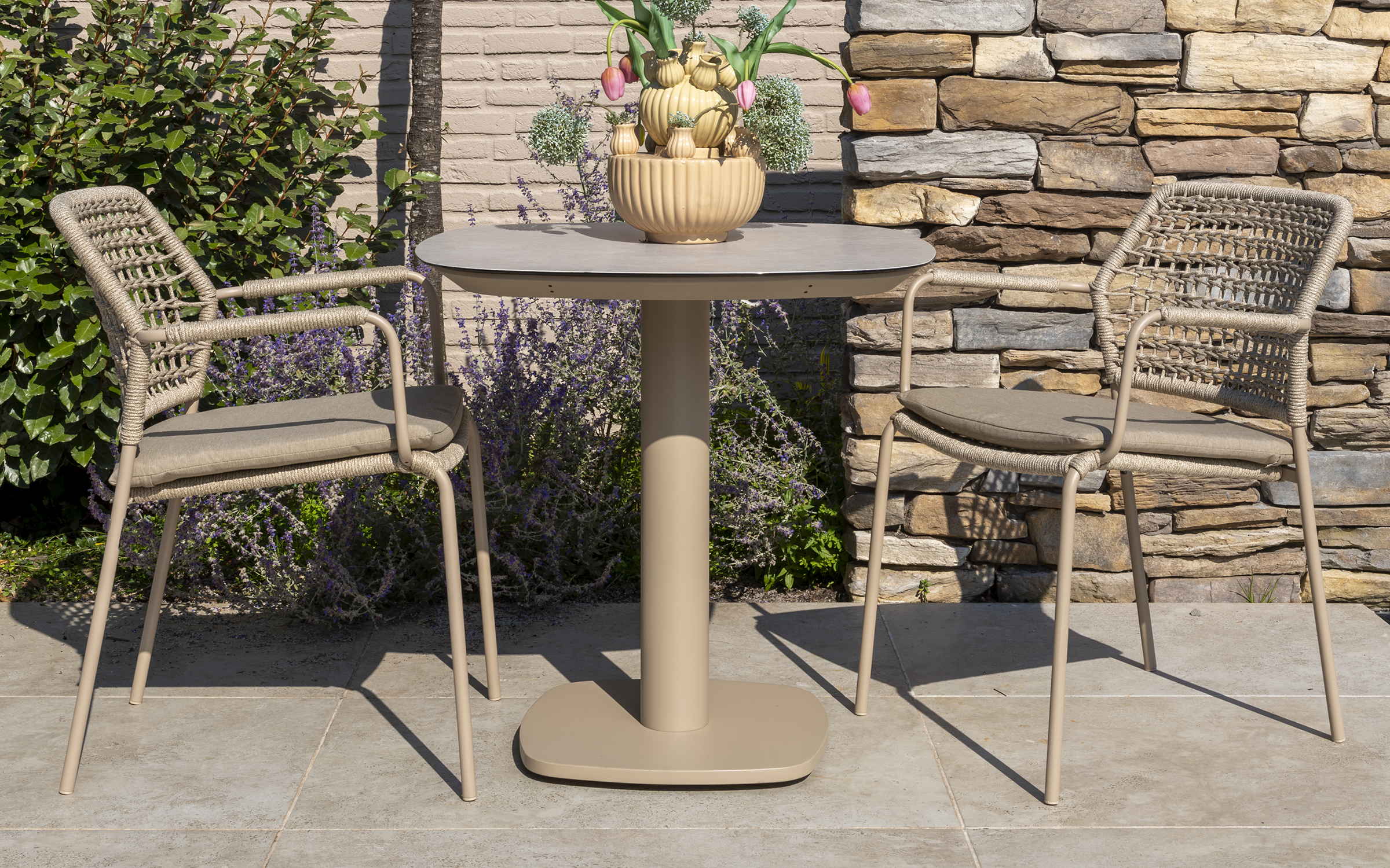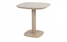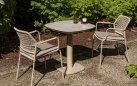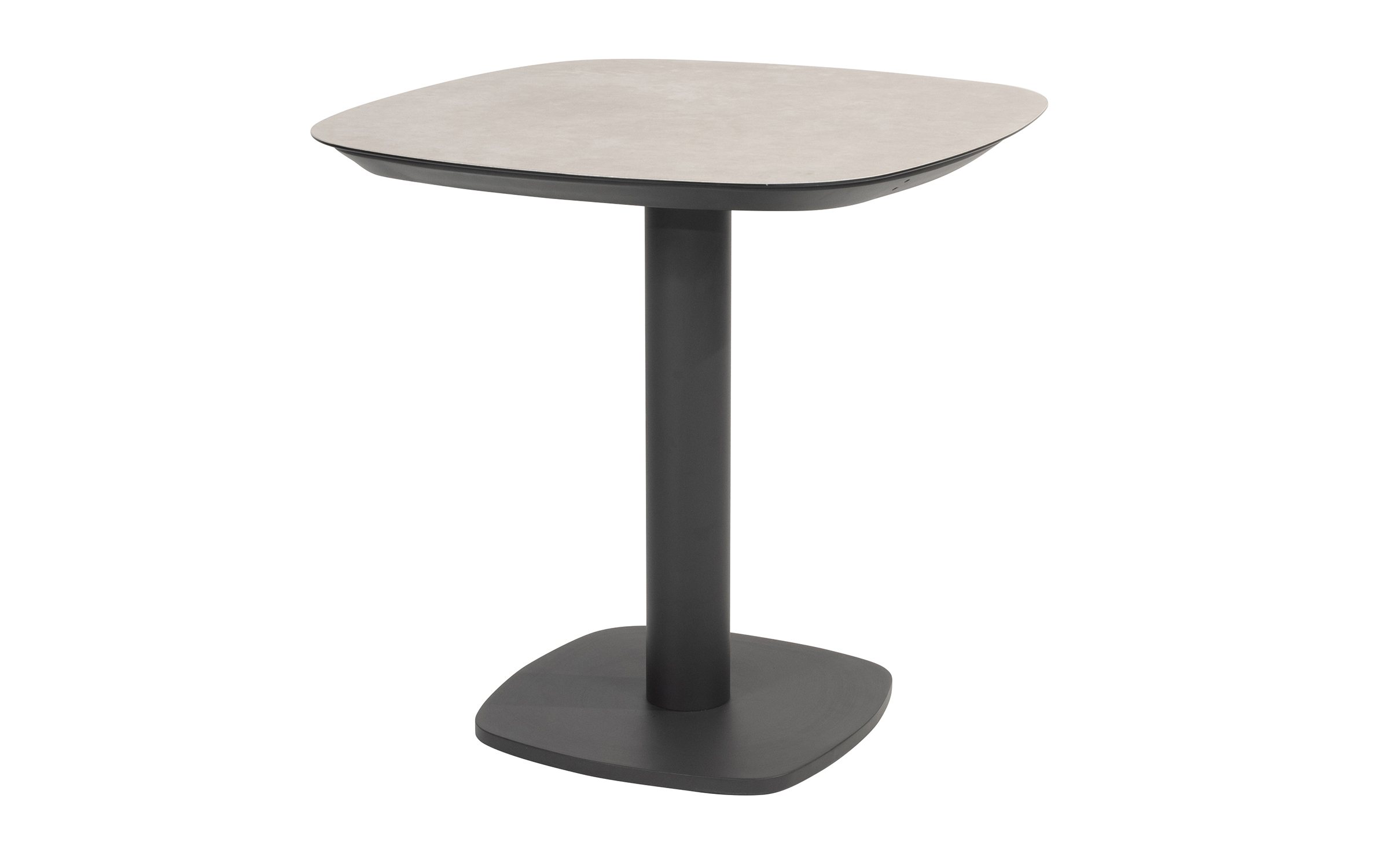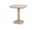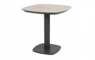 Stół ma aluminiową konstrukcję w kolorze antracytowym, jasnobeżowym z ceramicznym blatem o wymiarach 75 x 75 cm.
