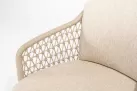 Kanapa ma konstrukcję z nierdzewnej stali malowaną proszkowo w kolorze latte. Również wyrafinowana plecionka w oryginalnym wyplocie, którymi ozdobiono ramę kanapy, wykonana jest w kolorze jasnego beżu.