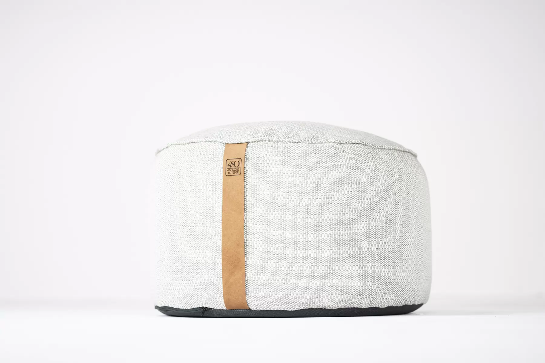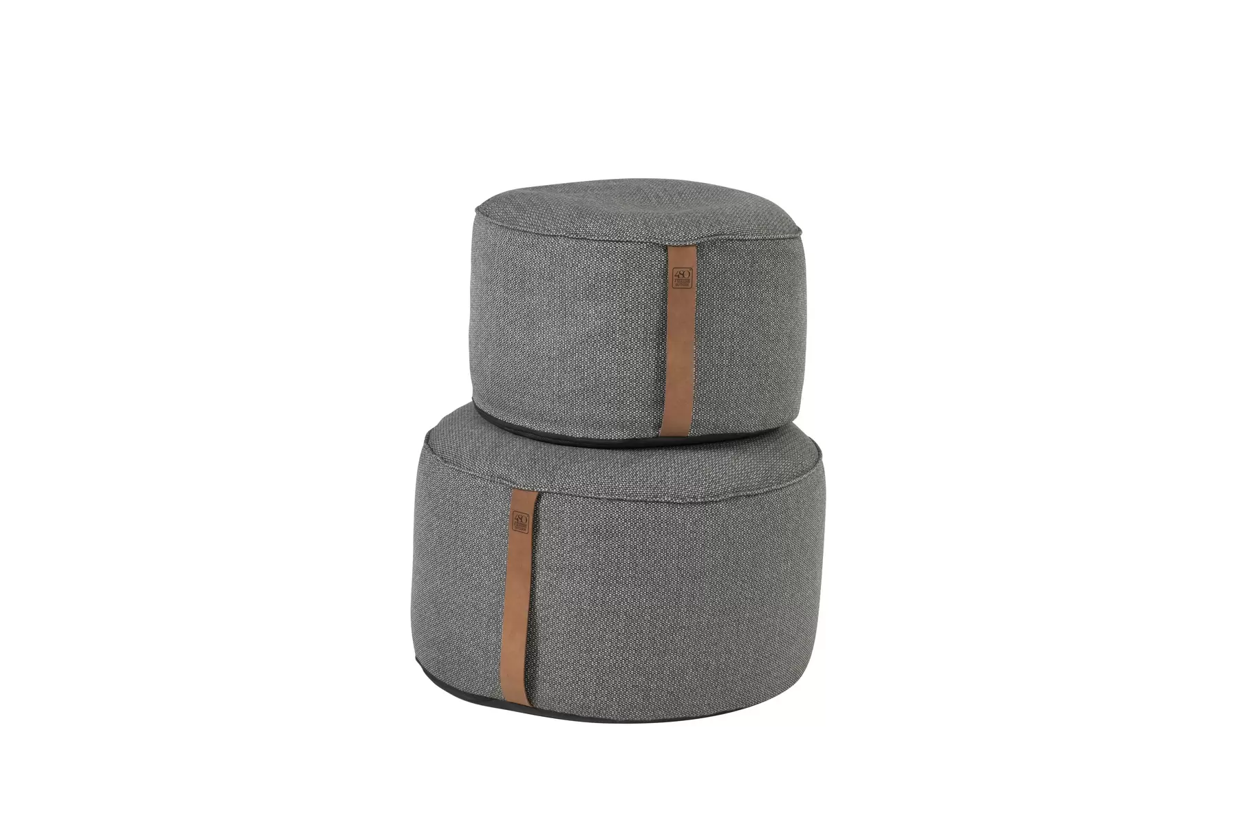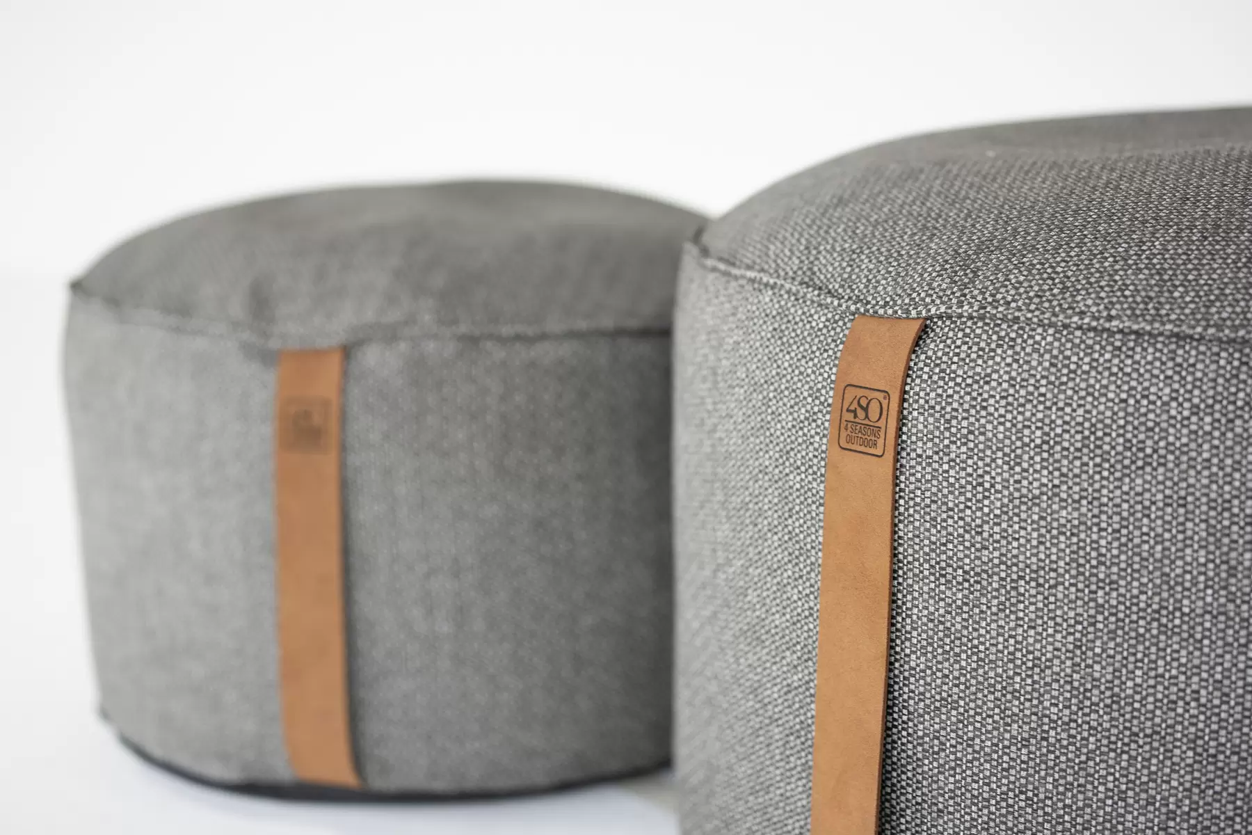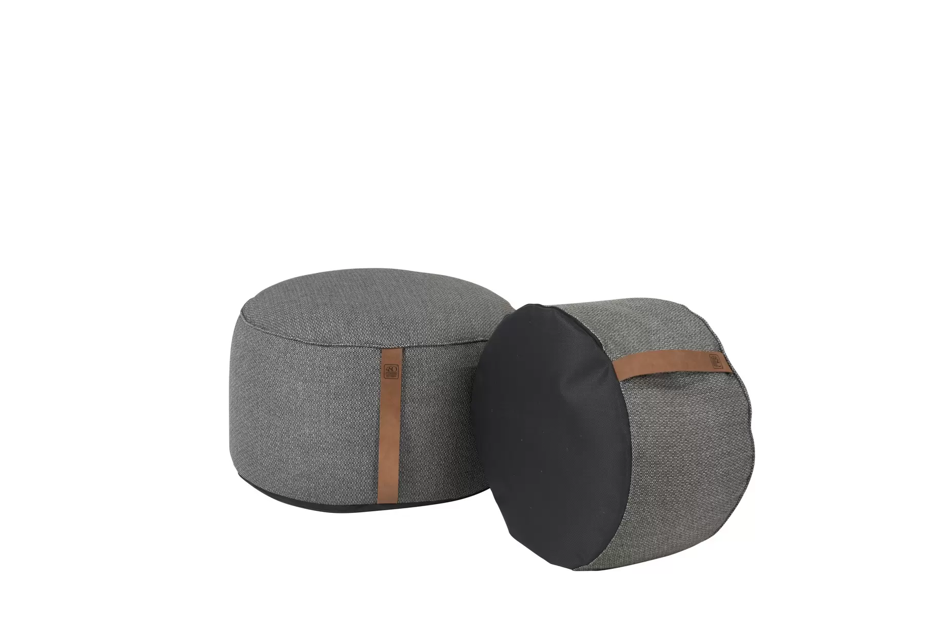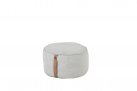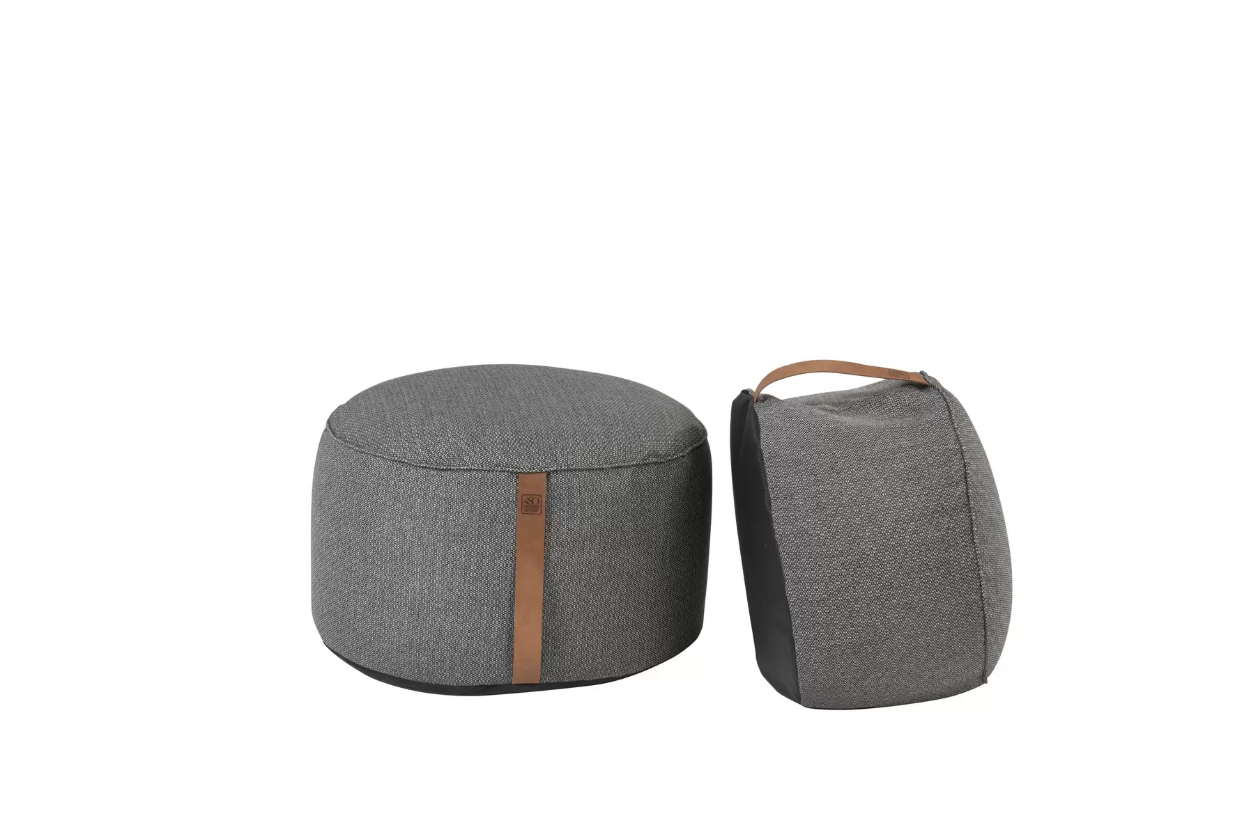 Pufa okrągła wykonana z odpornej na warunki atmosferyczne tkaniny Olefin.; Pufa ma wypełnienie, które doskonale nadaje się do użytku na zewnątrz. Skórzany pasek dopełnia luksusowy charakter tej pufy.