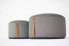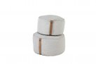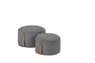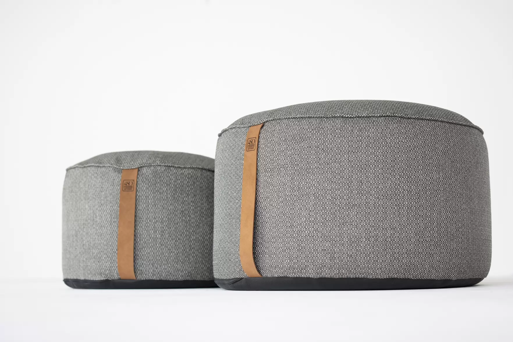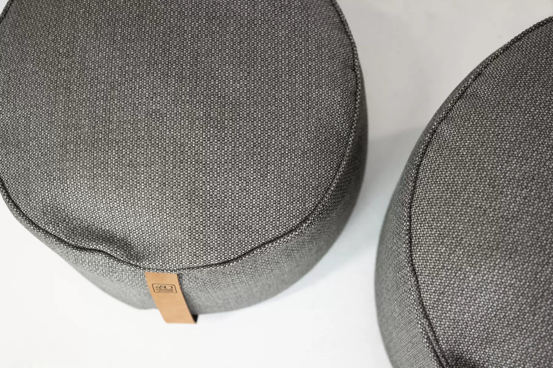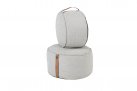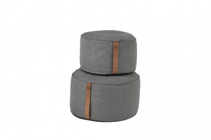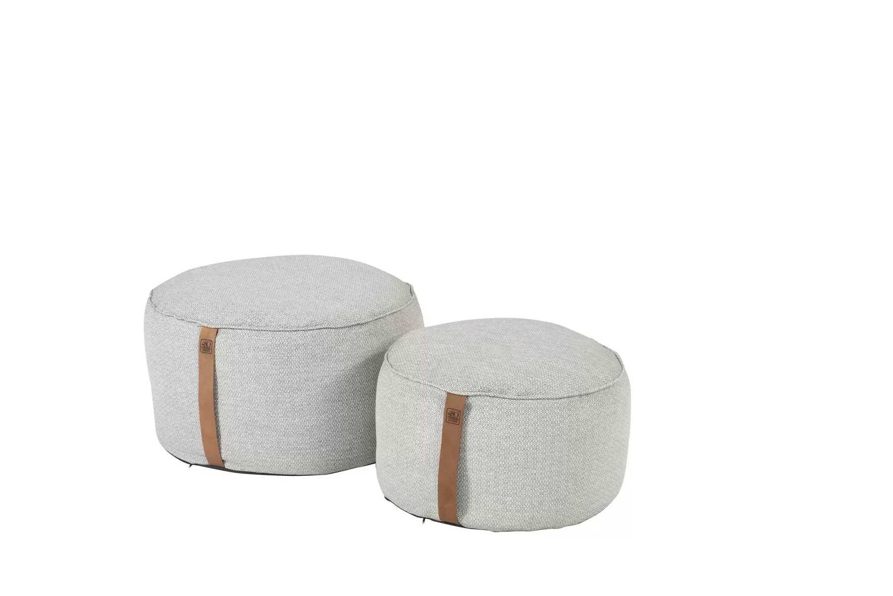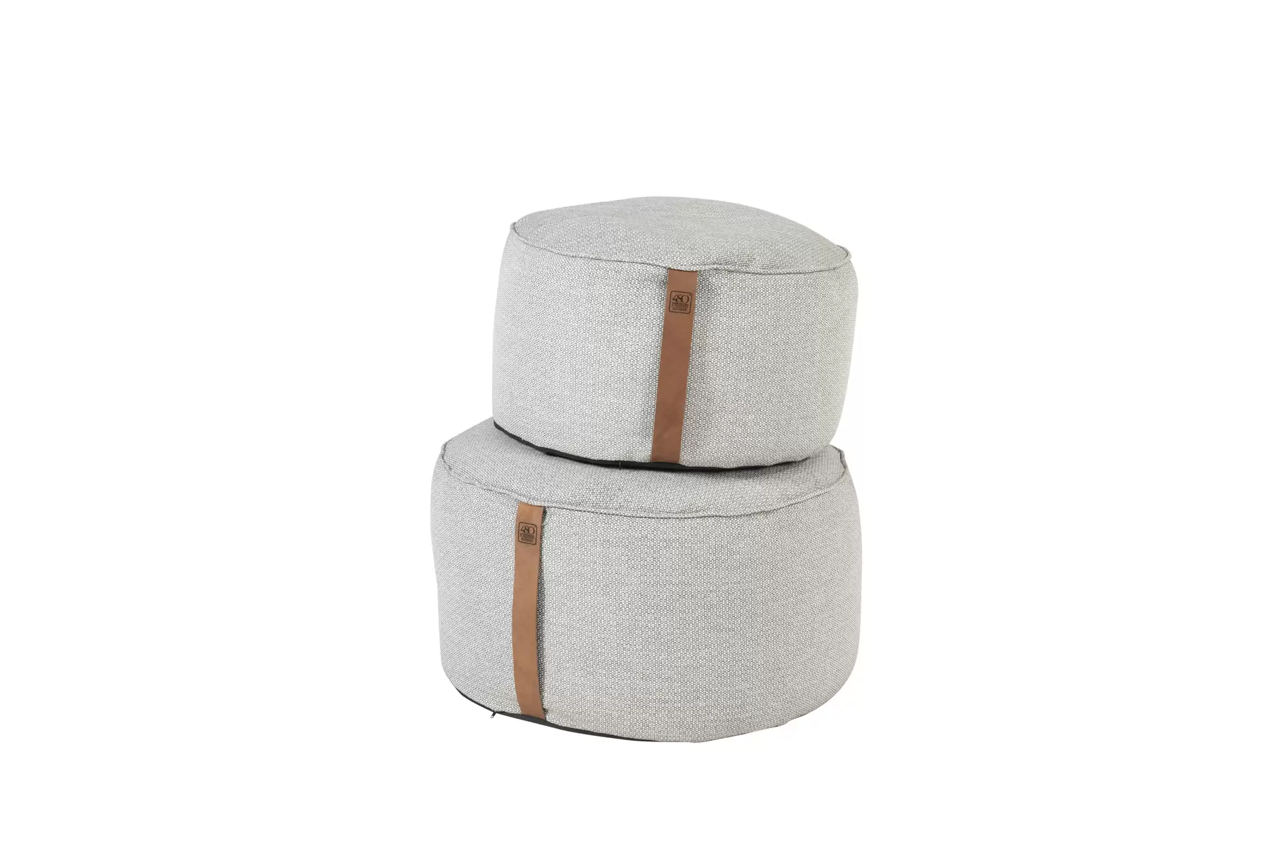 Pufa okrągła wykonana z odpornej na warunki atmosferyczne tkaniny Olefin.; Pufa ma wypełnienie, które doskonale nadaje się do użytku na zewnątrz. Skórzany pasek dopełnia luksusowy charakter tej pufy.