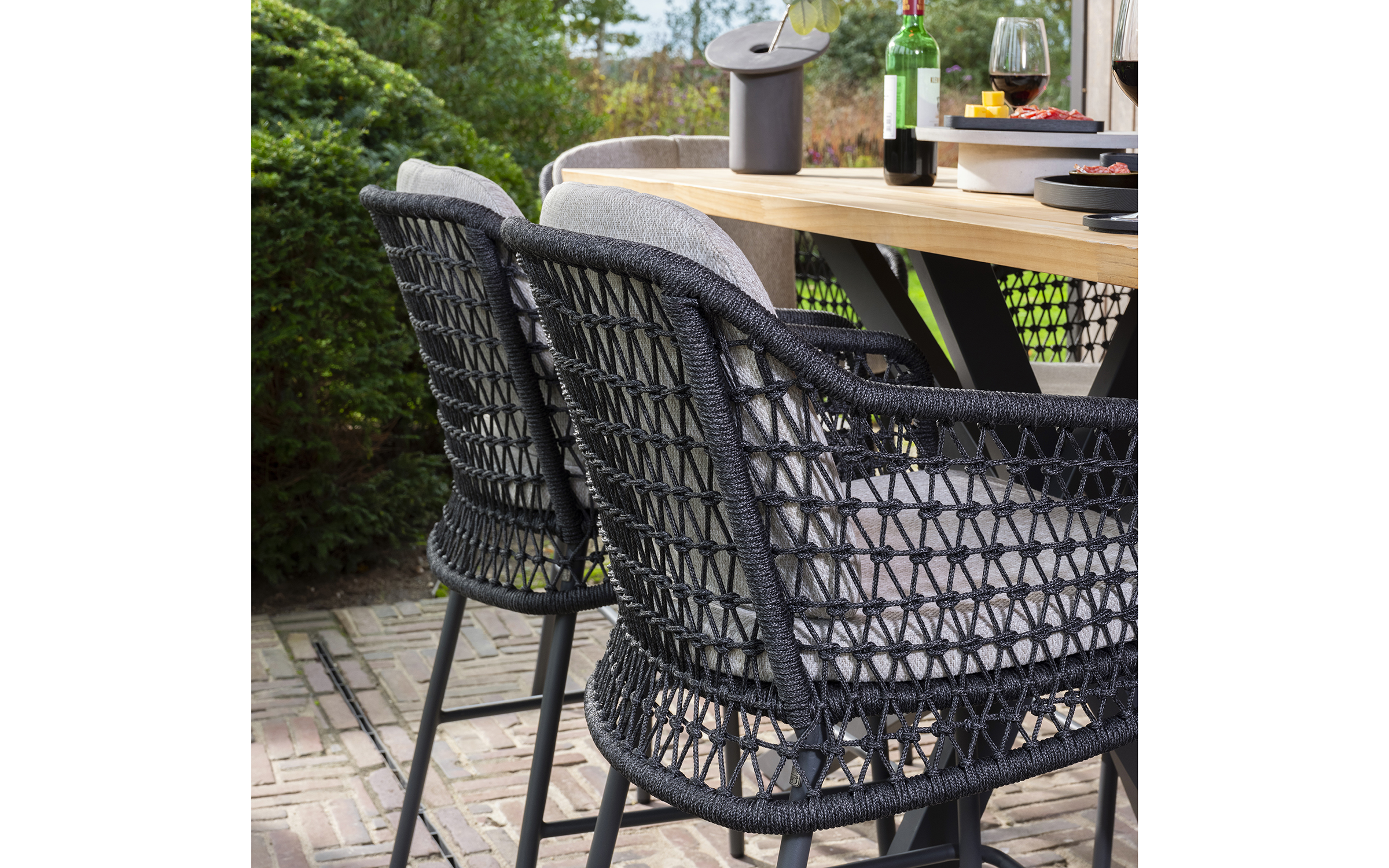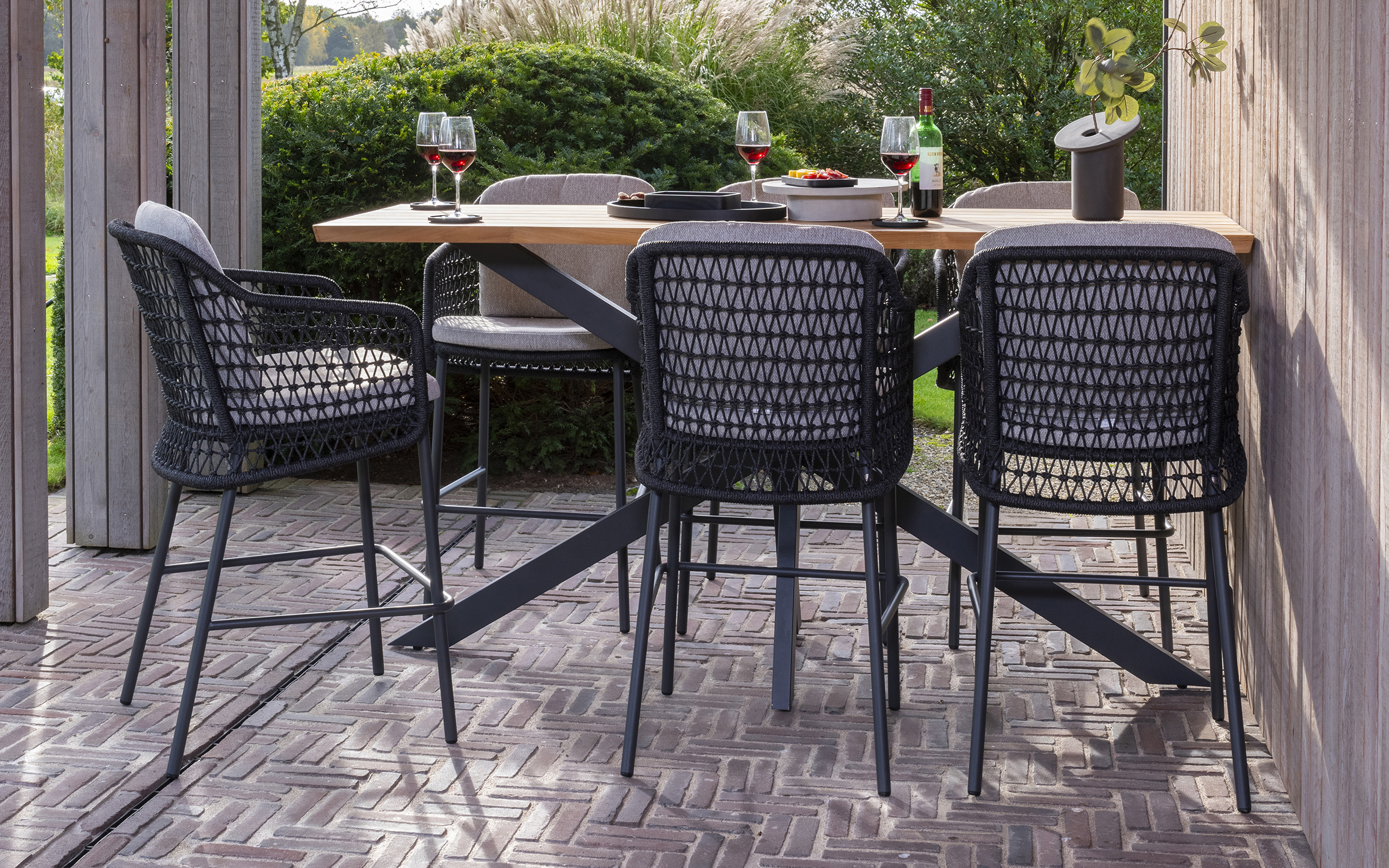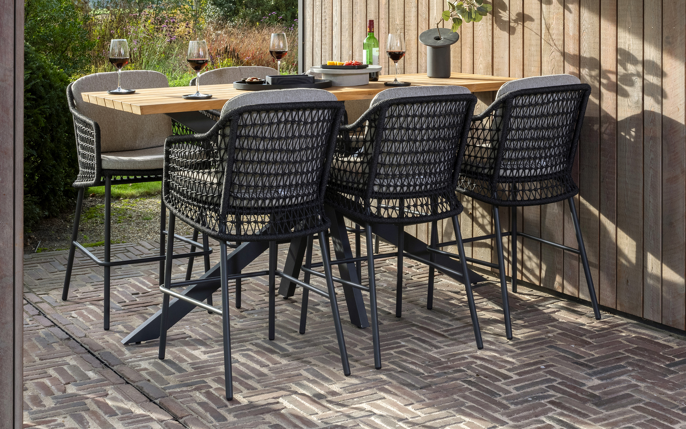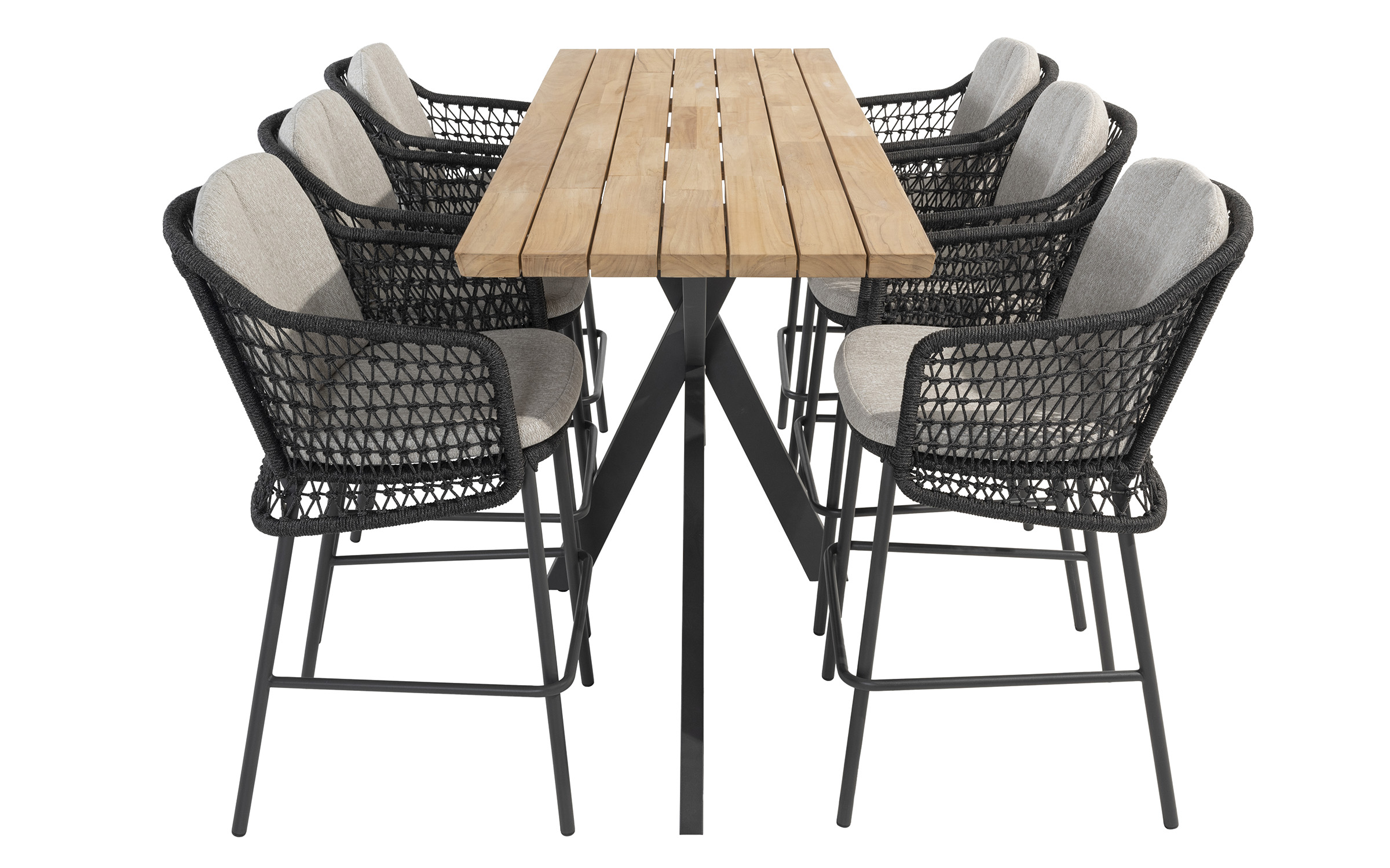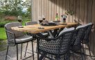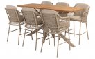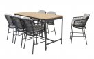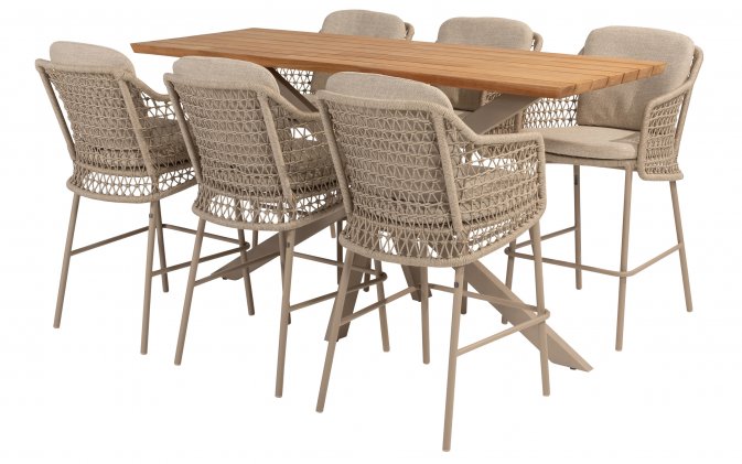 Zestaw barowy dla 6 osób uzupełnia stół barowy z blatem z drewna tekowego Taste 4SO Prado. Ma wyrafinowany design z efektowną ramą ze stali nierdzewnej malowanej proszkowo.