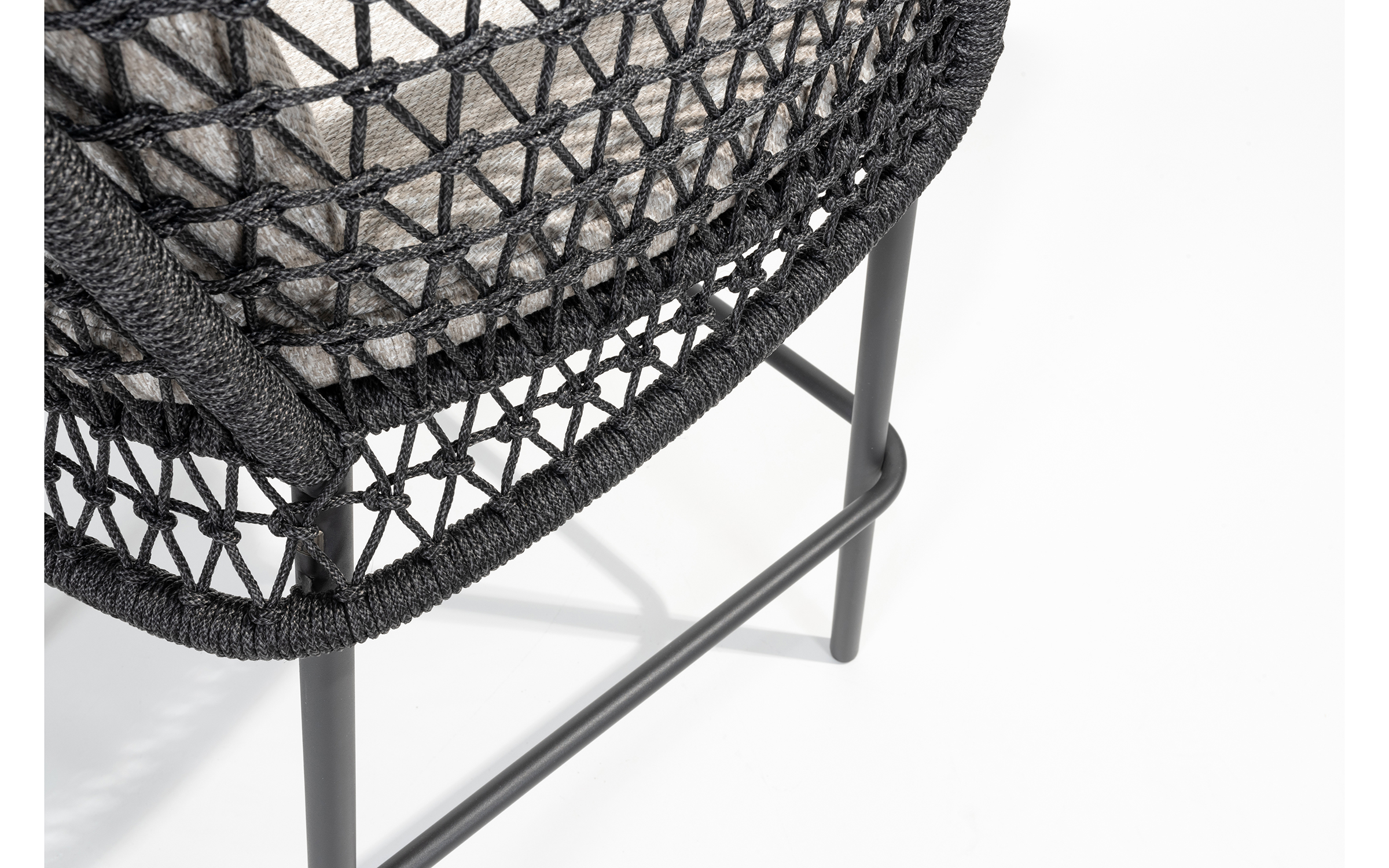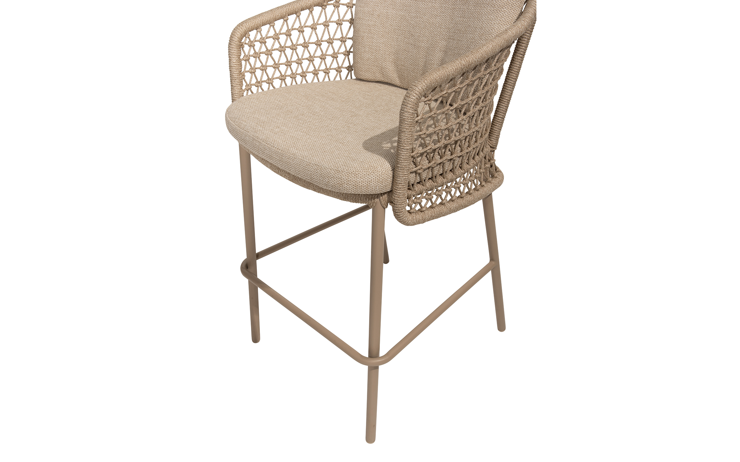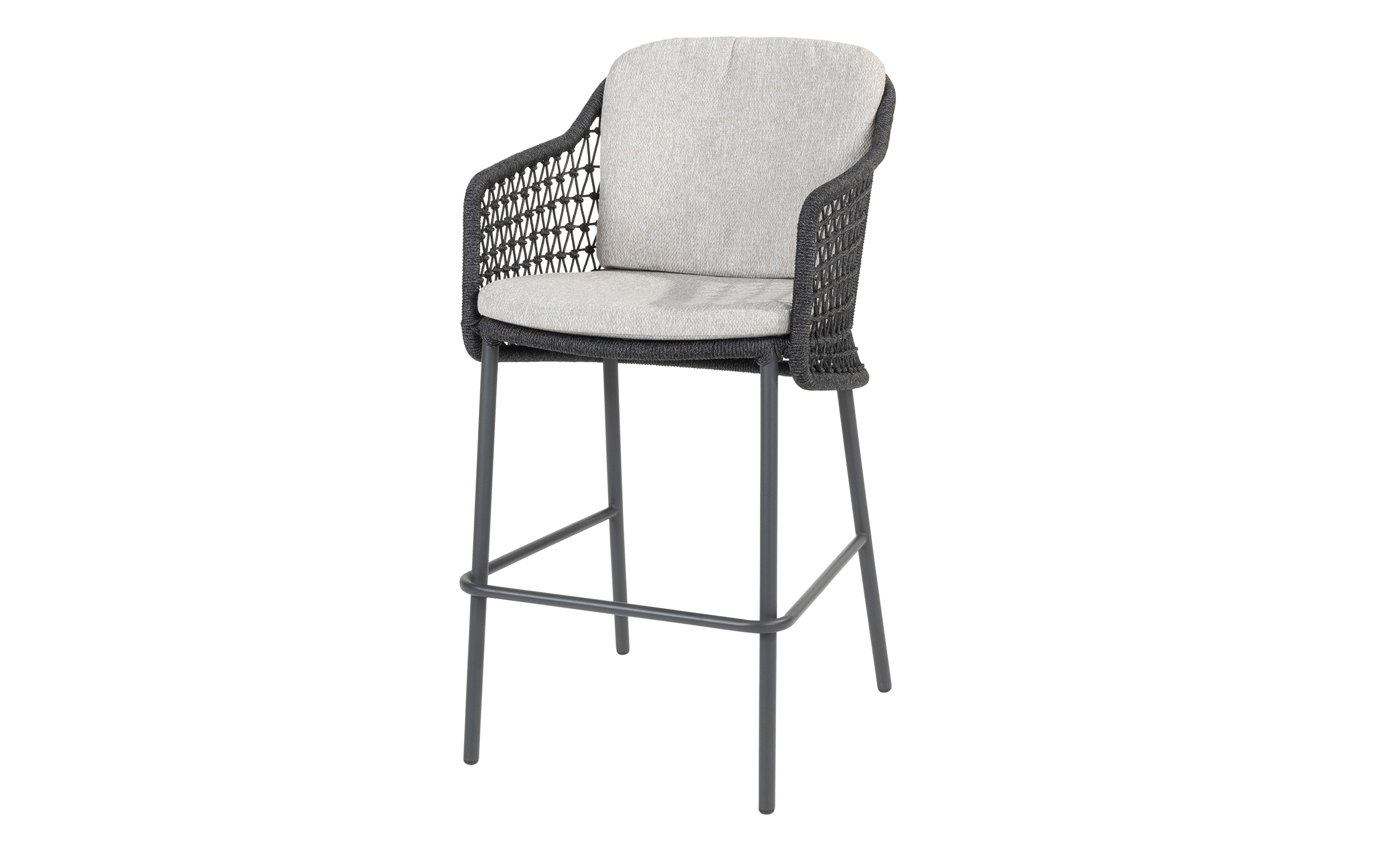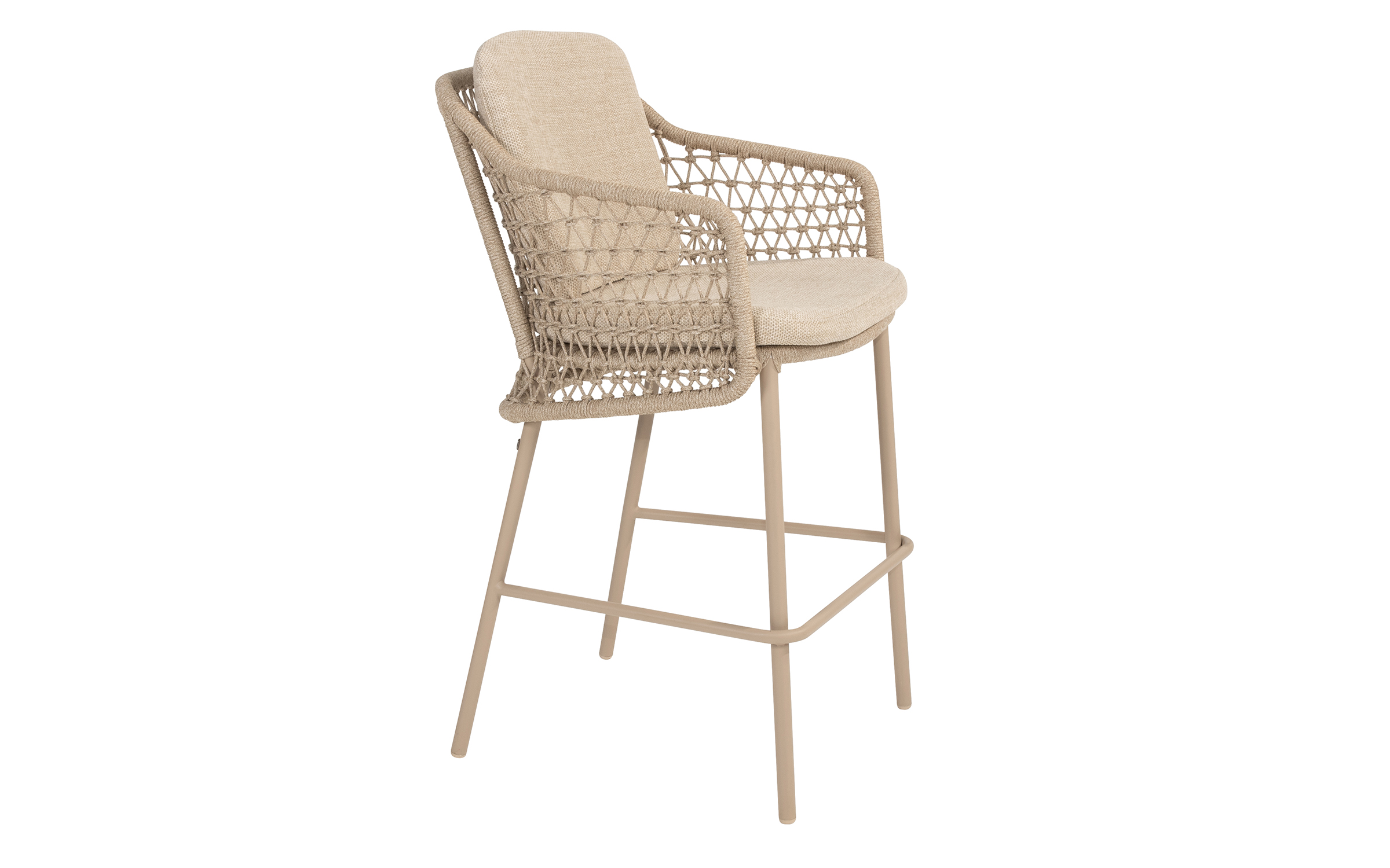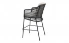 Stołek barowy jest wyposażony w poduszki i ma nowoczesną ramę ze stali nierdzewnej z oplotem ze sznurka. Szczególną cechą tego krzesła barowego Tramonti jest to, że jest to w rzeczywistości pełnoprawne krzesło do jadalni. Zwykle widzisz, że krzesło barowe składa się tylko z małej skorupy siedziska, więc komfort siedzenia nie jest idealny.