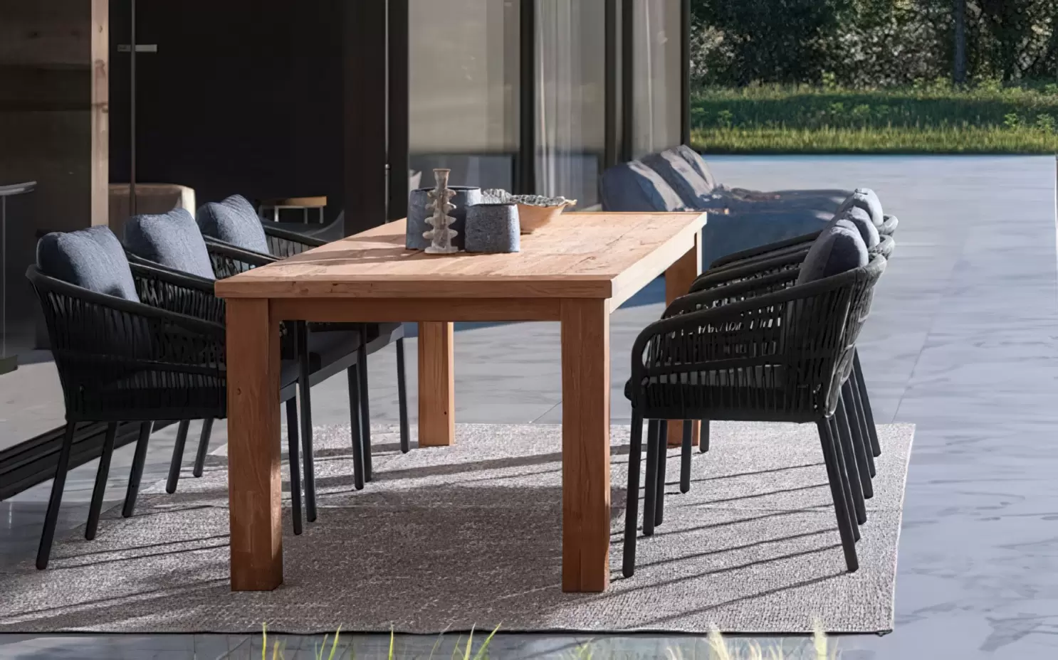 Wygodę spożywania posiłków na tarasie zapewniają poduszki z materiału poliestrowego.