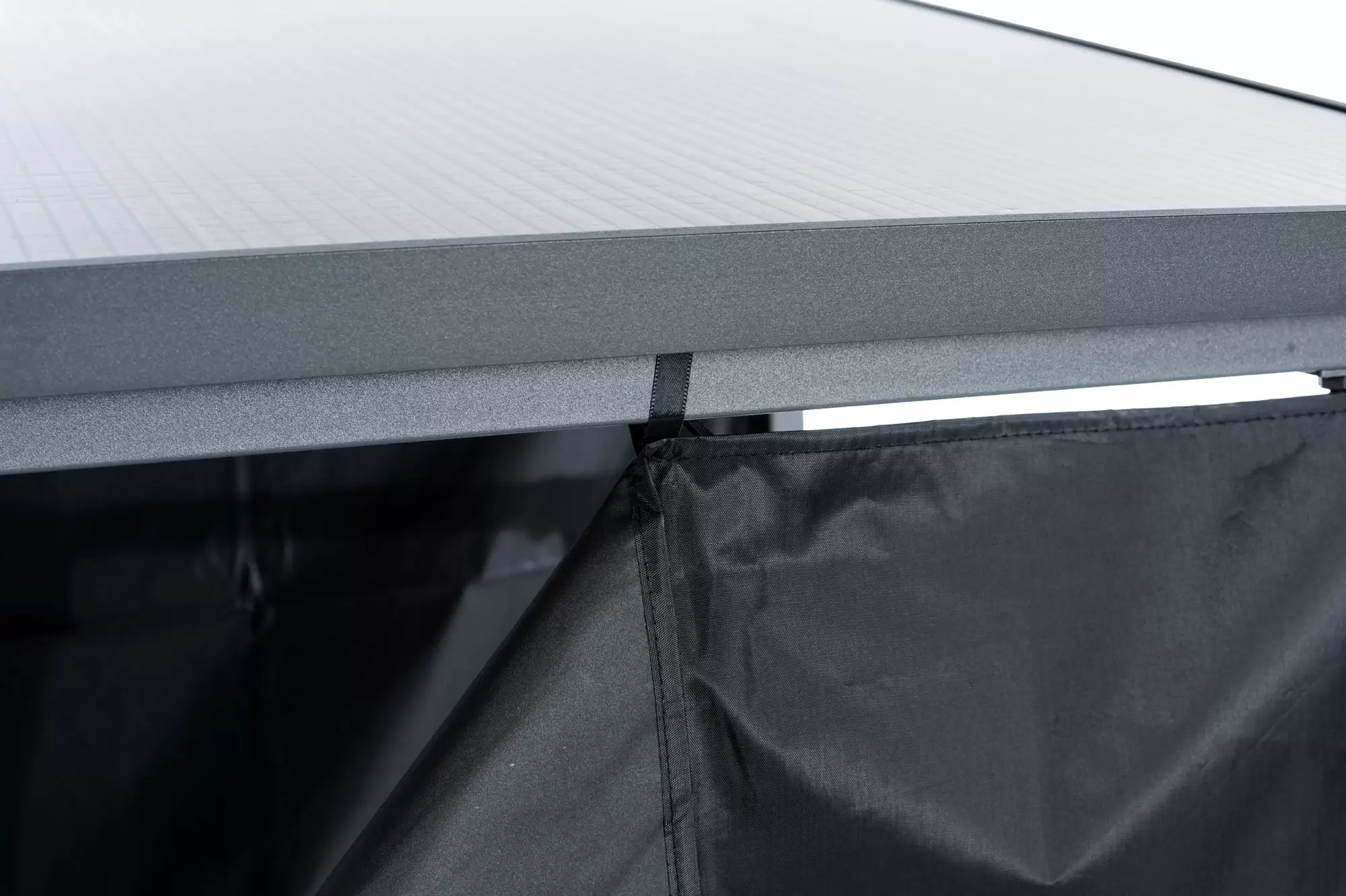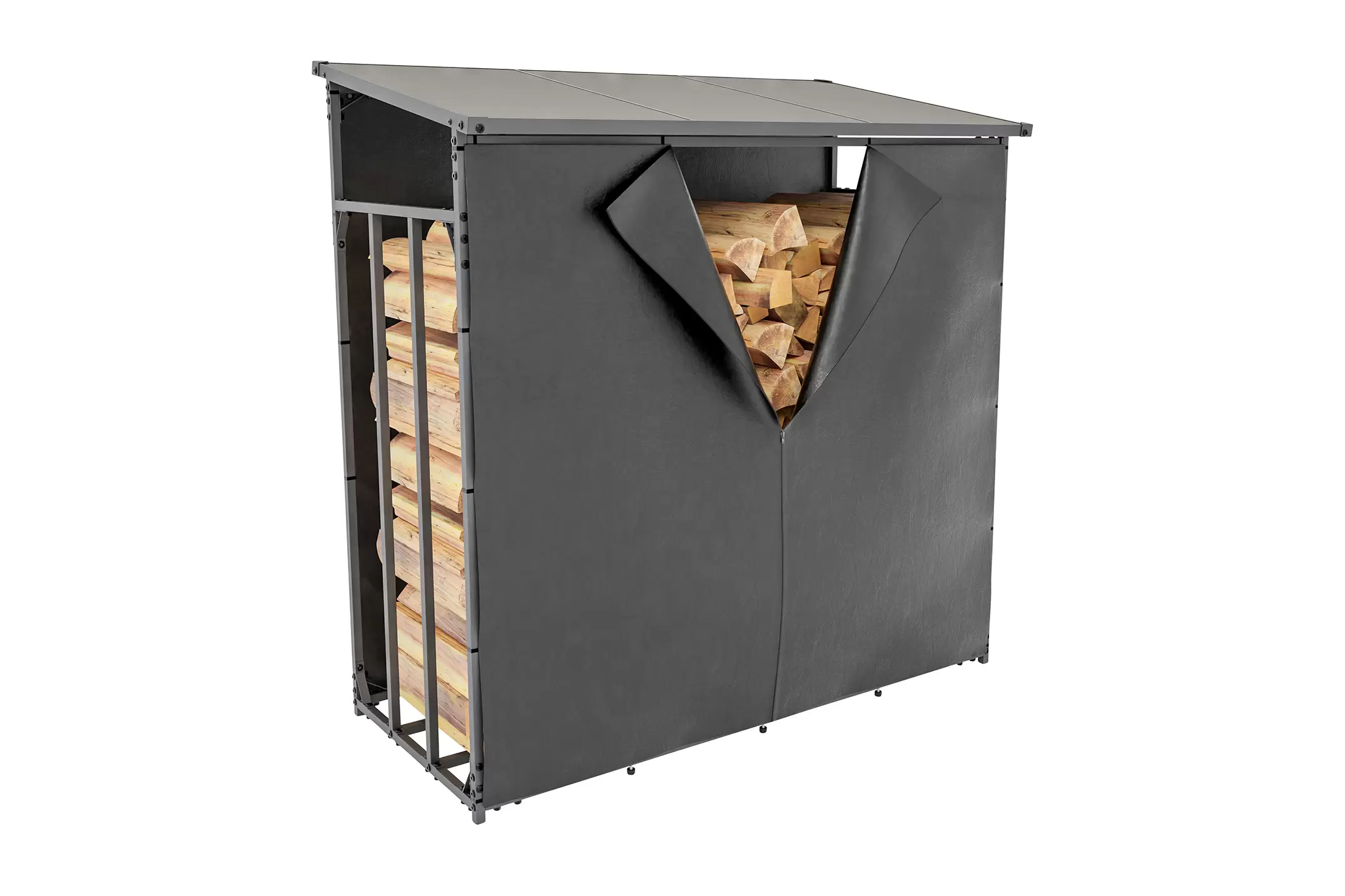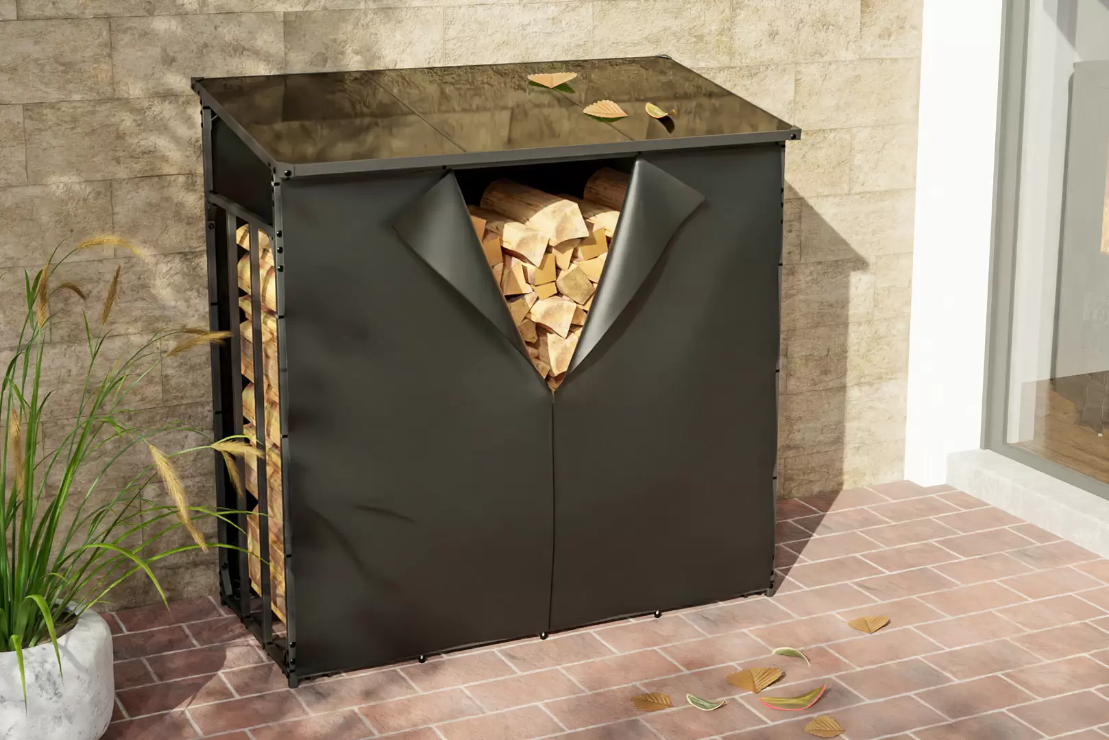 Opcjonalna plandeka do zadaszenia na drewno opałowe składa się z 2 części : przodu i tyłu. Mocowana jest bezpośrednio do ramy wiaty za pomocą zintegrowanych wsporników. Plandeka z przodu wyposażona jest w praktyczny zamek błyskawiczny, dzięki czemu umożliwia dostęp do składowanego drewna w dowolnym momencie. Plandeka jest wykonana z czarnego wodoodpornego poliestru i jest łatwa do czyszczenia.