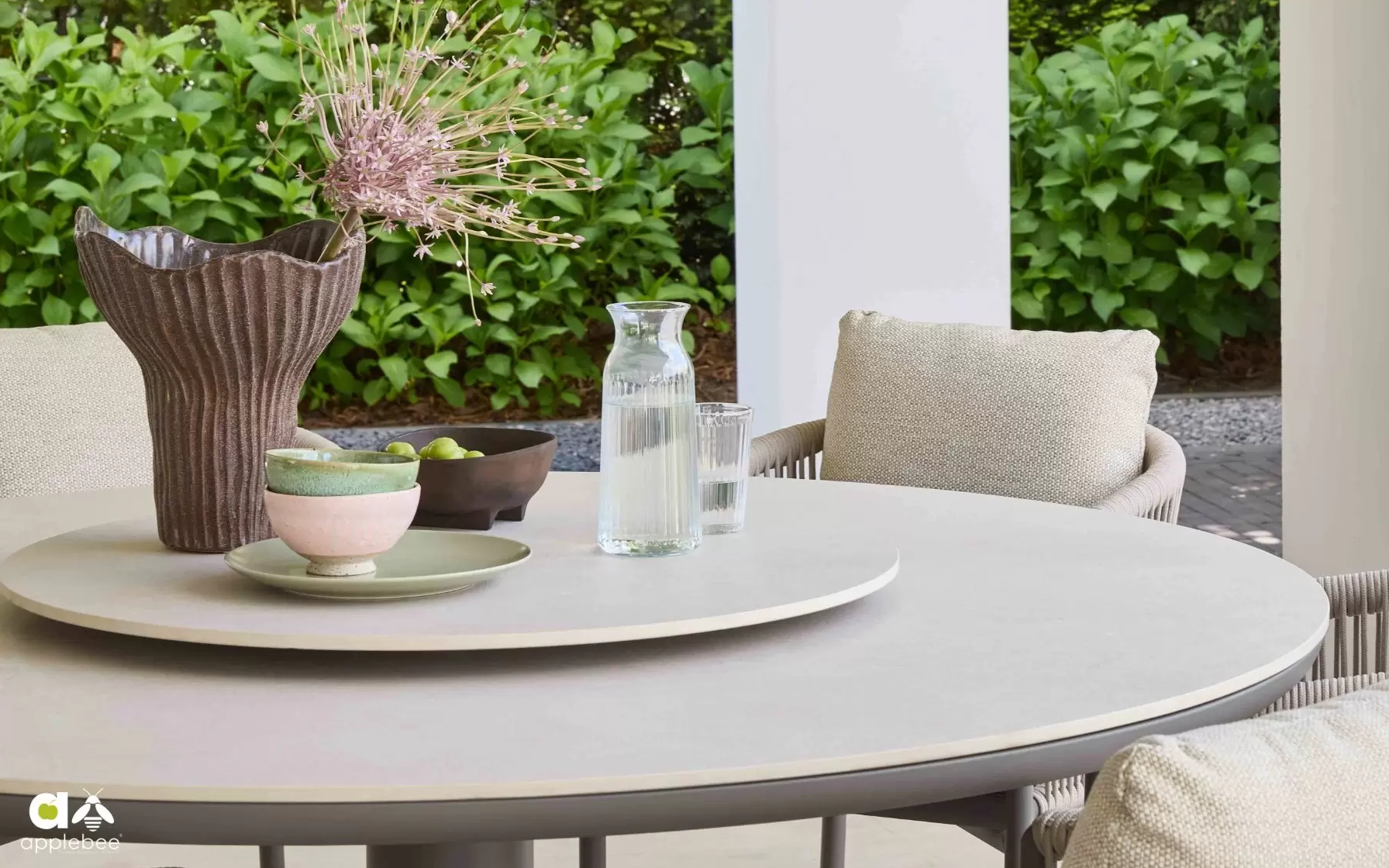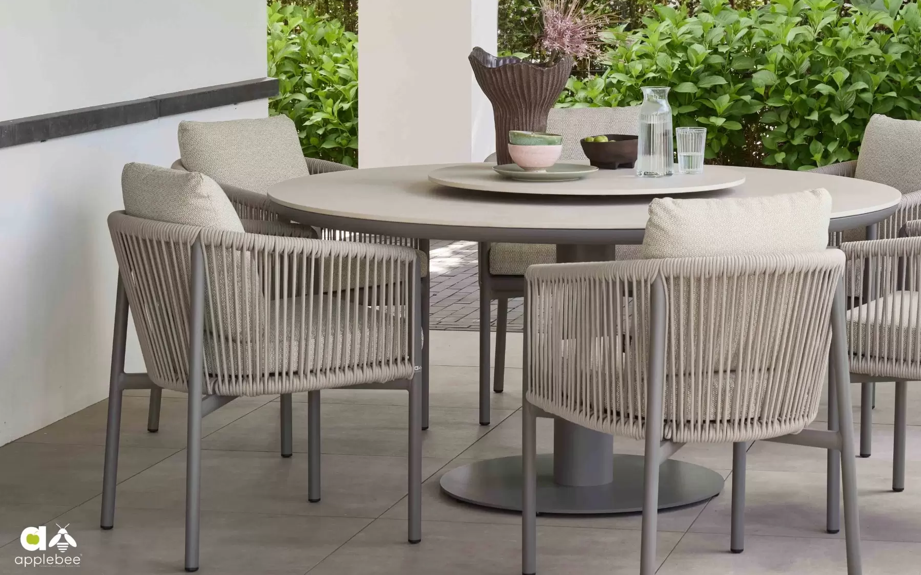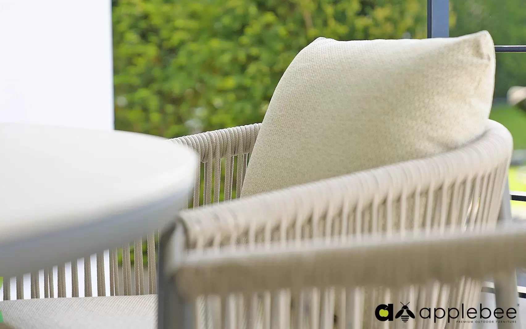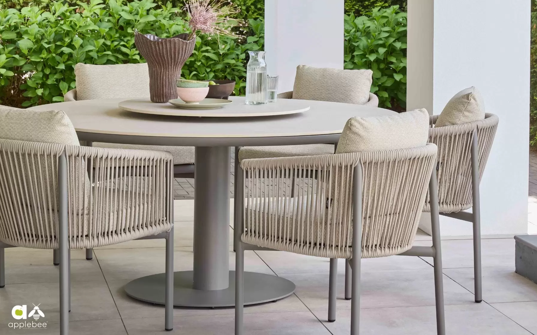 Zestaw stołowy BORA BORA to elegancka propozycja marki AppleBee do ogrodu, na taras lub patio. Składa się z okrągłego stołu o średnicy 140 cm oraz wygodnych krzeseł z aluminiową konstrukcją i poduszkami All Weather Bee Wett. Dostępny w dwóch wersjach kolorystycznych: jasny beż oraz taupe. Blat stołu wykonany z kamienia spiekanego, odporny na warunki atmosferyczne i łatwy w pielęgnacji.
