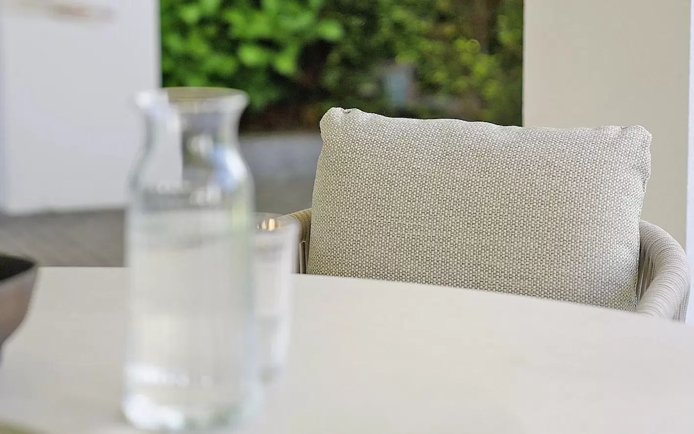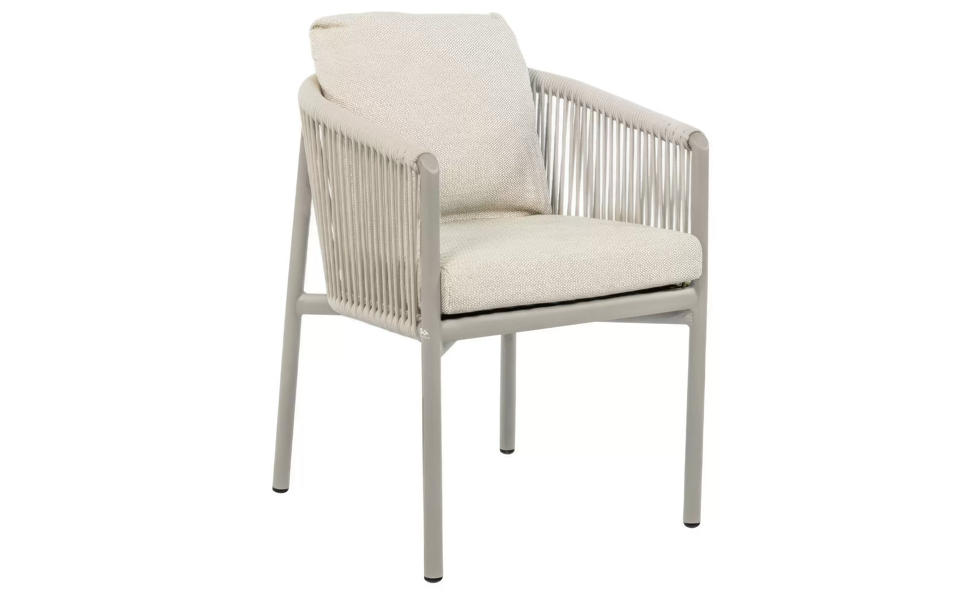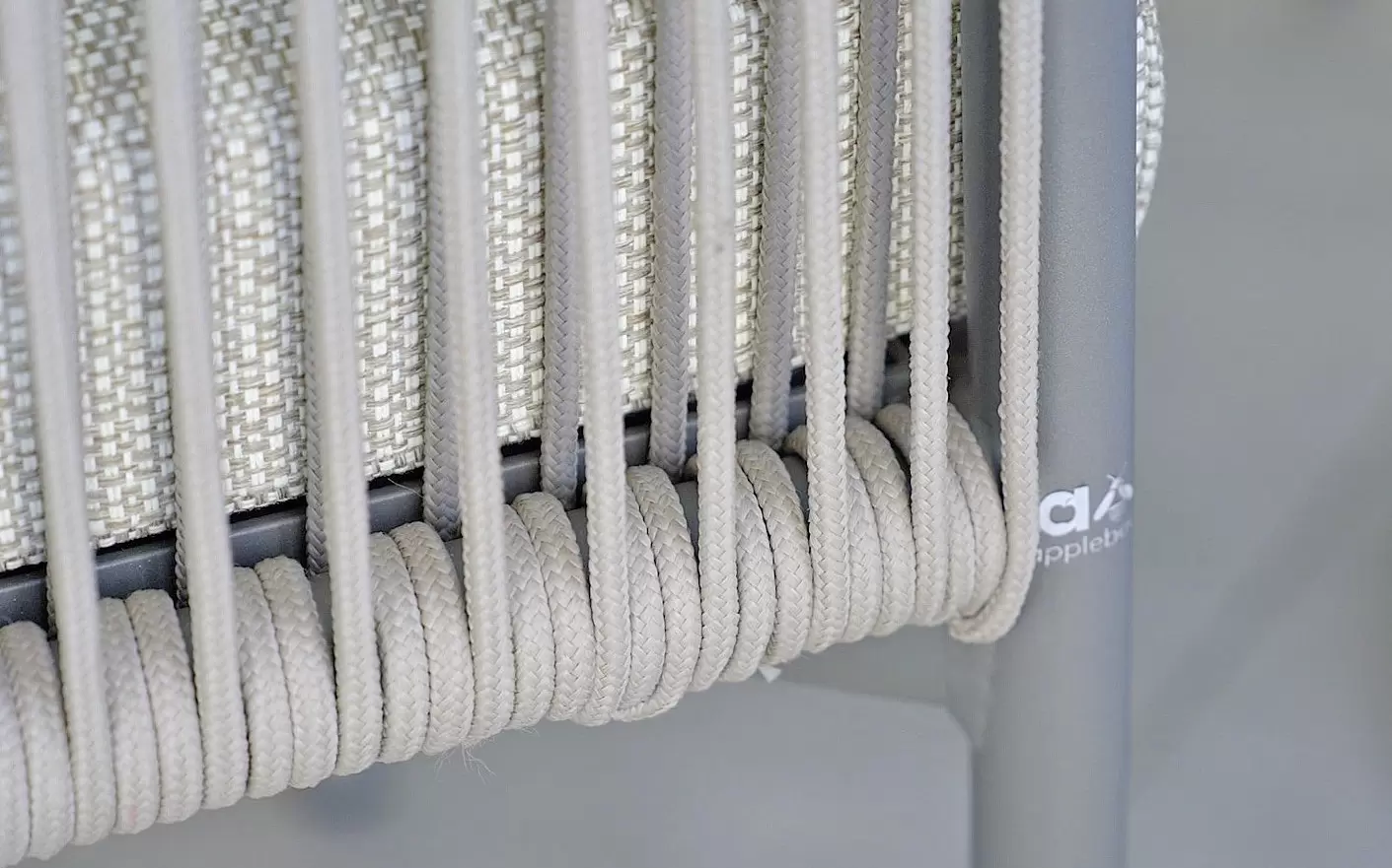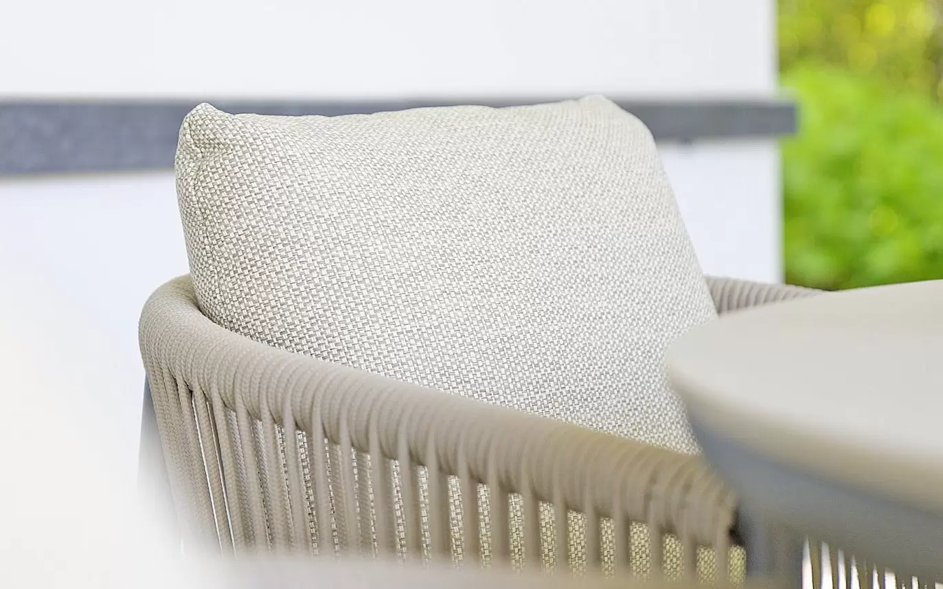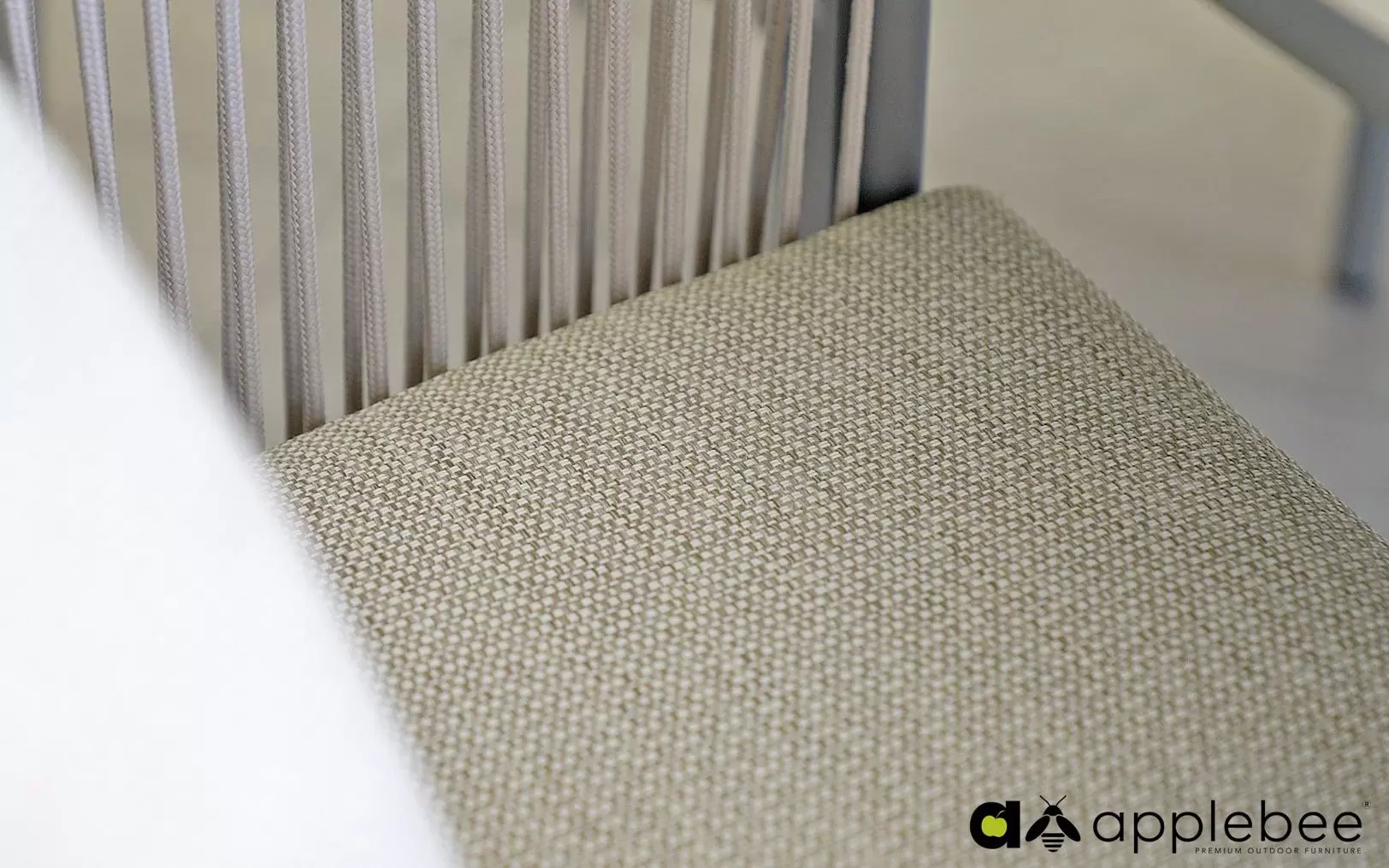 Krzesła: aluminiowa rama z wykończeniem Oyster lub Zwart, poduszki z wypełnieniem Bee Wett – szybkoschnąca pianka o otwartej strukturze. Poszewki z tkaniny Olefin – odporne na zabrudzenia, pleśń i blaknięcie.