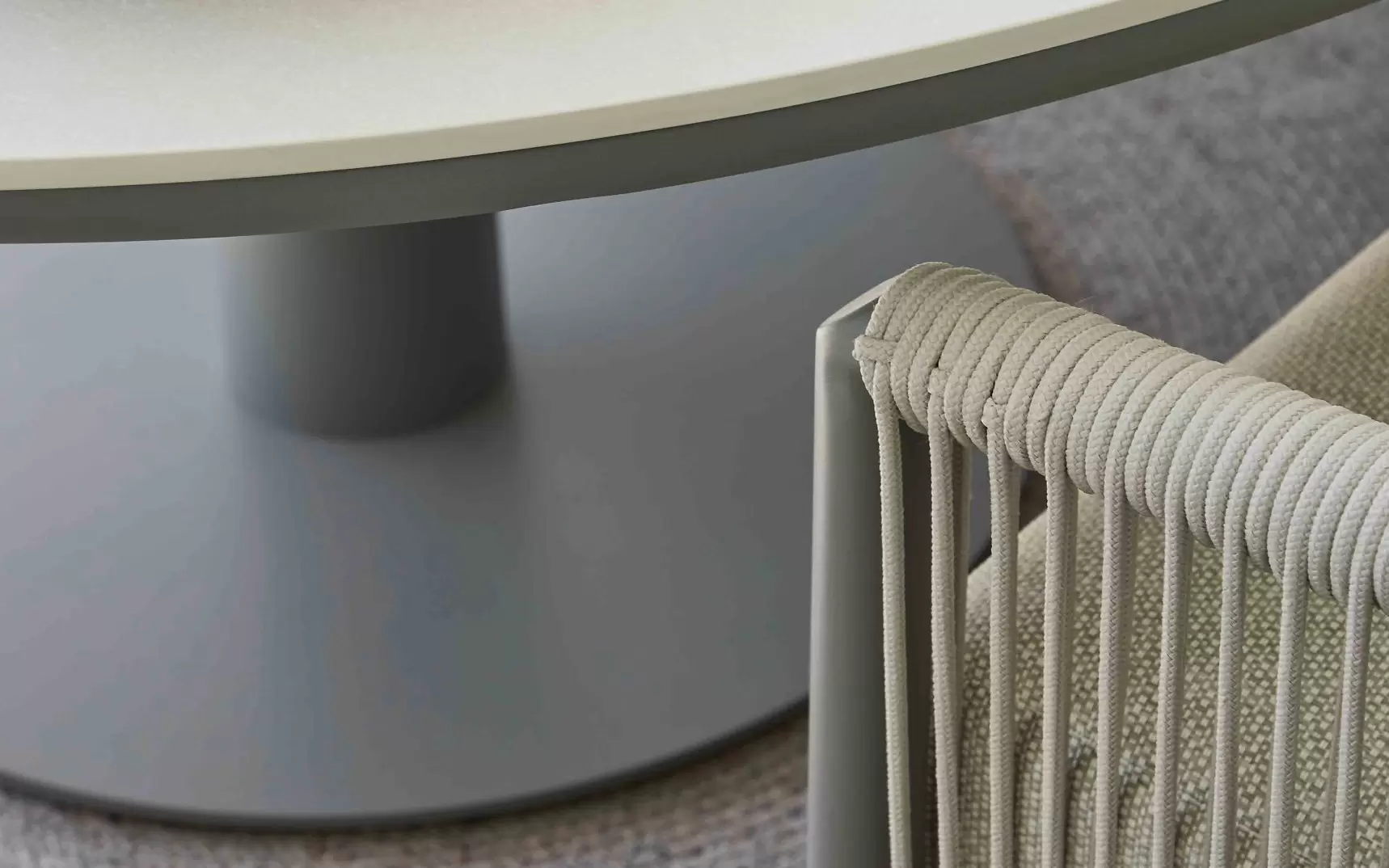Stół: blat z kamienia spiekanego (sintered stone) – trwały, odporny na zarysowania, promieniowanie UV i wilgoć. Konstrukcja z aluminium malowanego proszkowo – lekka, nierdzewna, łatwa w pielęgnacji.