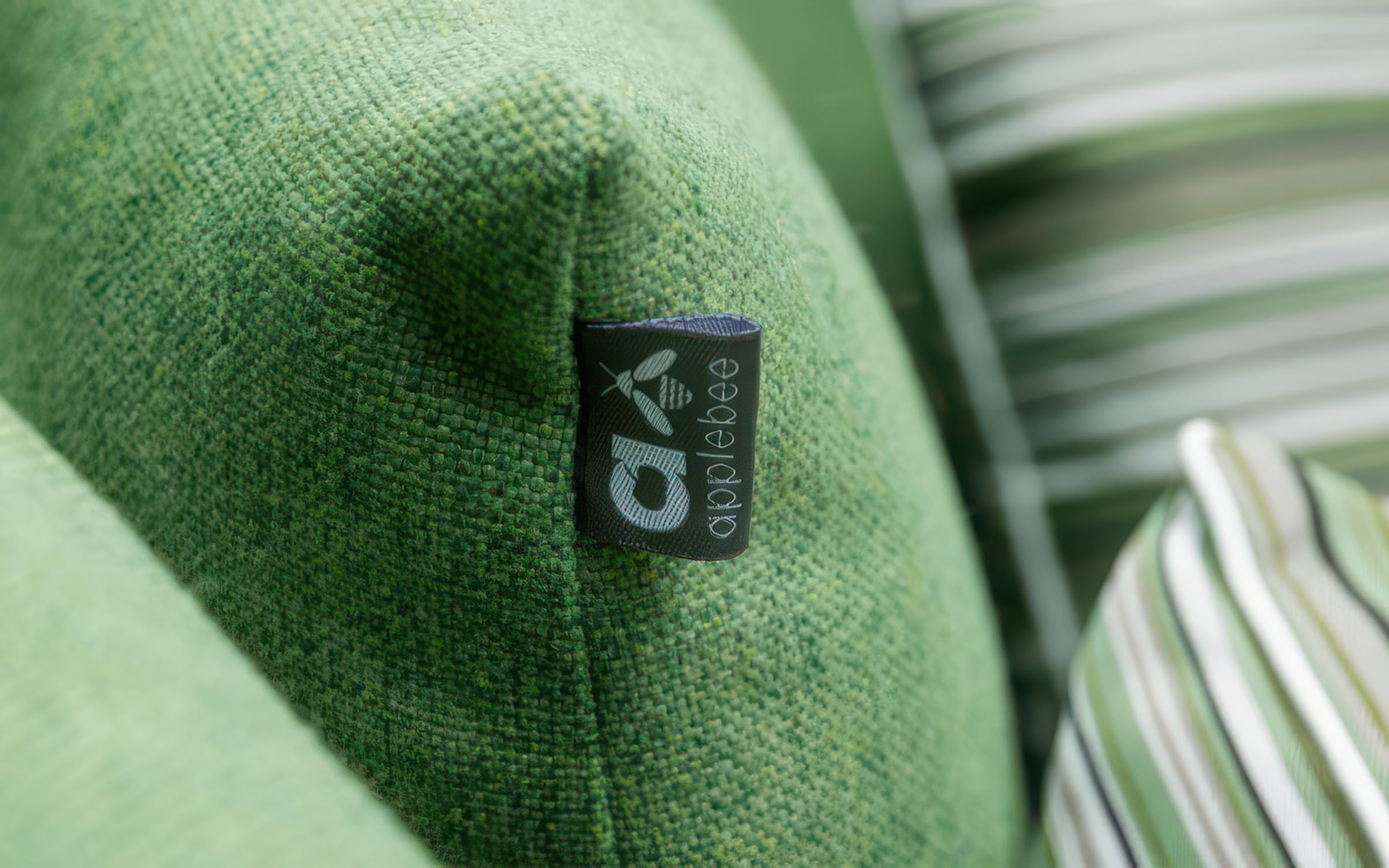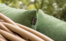 Poduszki dostępne są w dwóch wariantach: Olefin Green — gładka, odporna tkanina outdoorowa o wysokiej odporności na promieniowanie UV i wilgoć, oraz Boucle Cream — miękka, pętelkowa tkanina o tekstylnym charakterze, również odporna na warunki atmosferyczne dzięki technologii BEE WETT®.