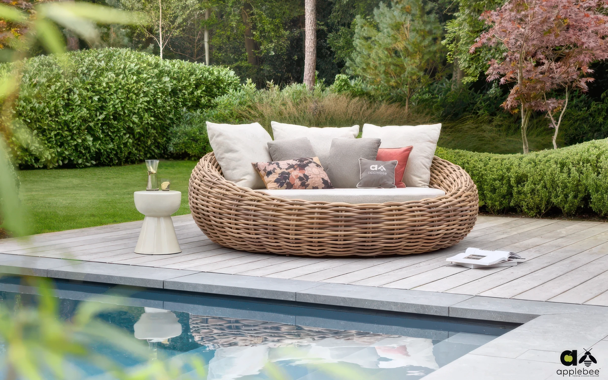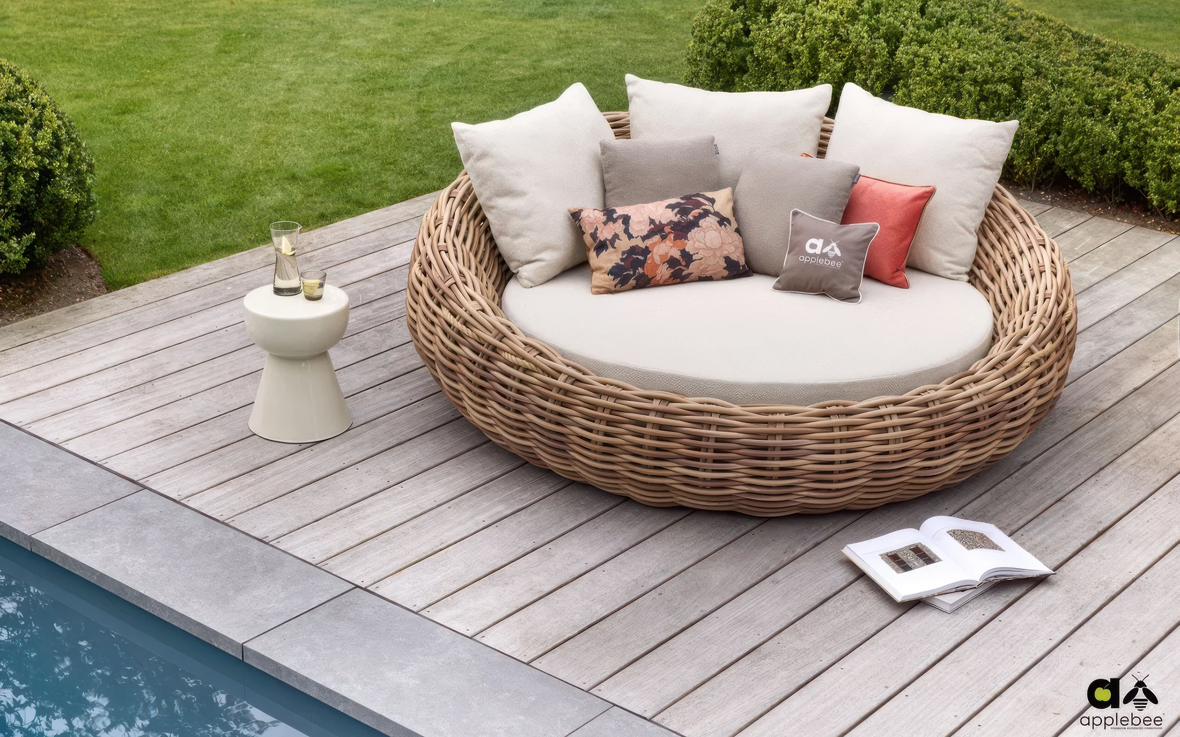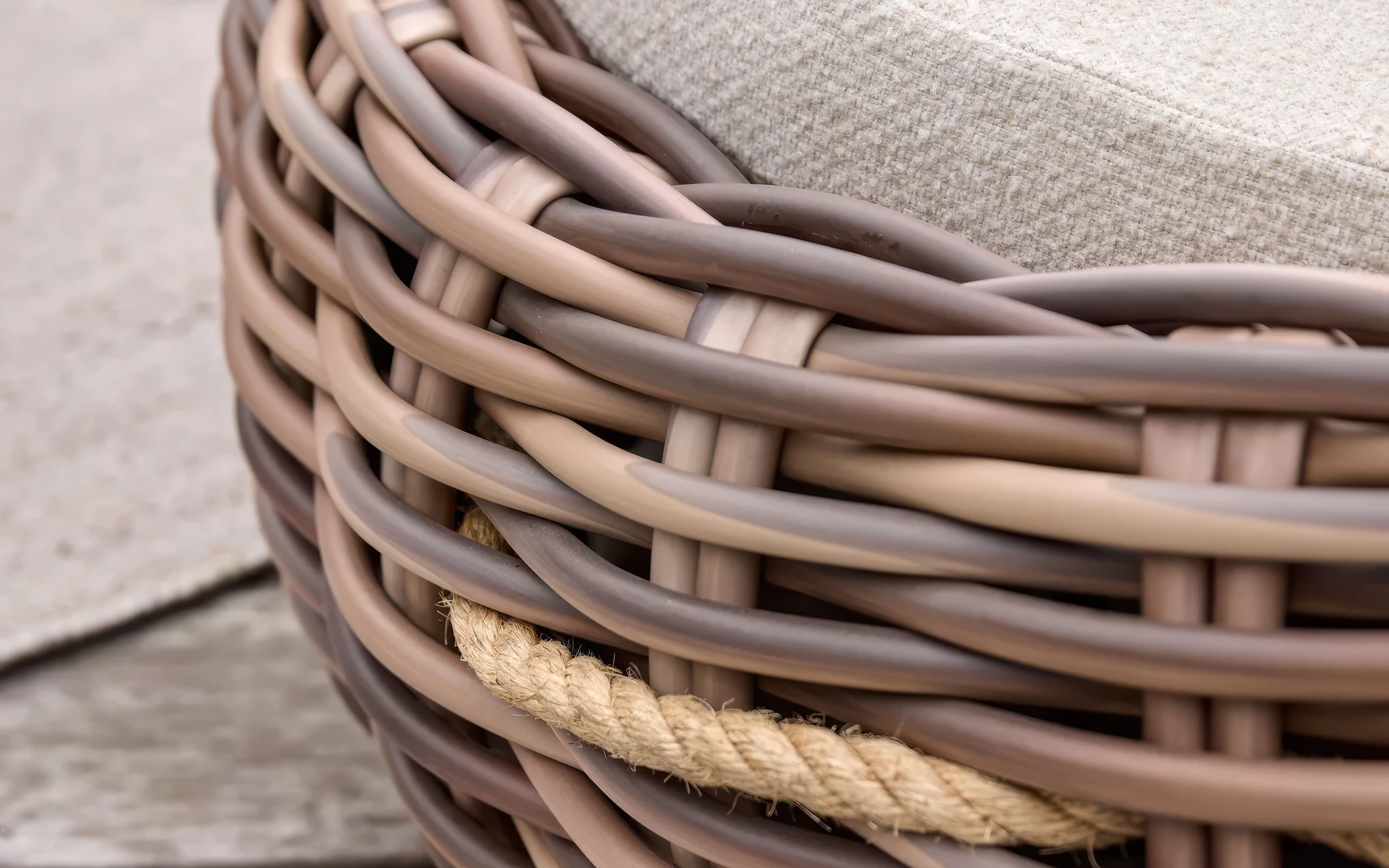 Model COCOON DAYBED to przestronne łóżko ogrodowe o imponującej średnicy, stworzone z myślą o relaksie w ogrodzie lub na tarasie. Jego zaokrąglona forma i ręcznie pleciony technorattan w naturalnym odcieniu tworzą harmonijną całość, która przyciąga wzrok i zapewnia wyjątkowy komfort. Do wyboru dwie wersje kolorystyczne poduszek: zielony Olefin lub beżowy Boucle.