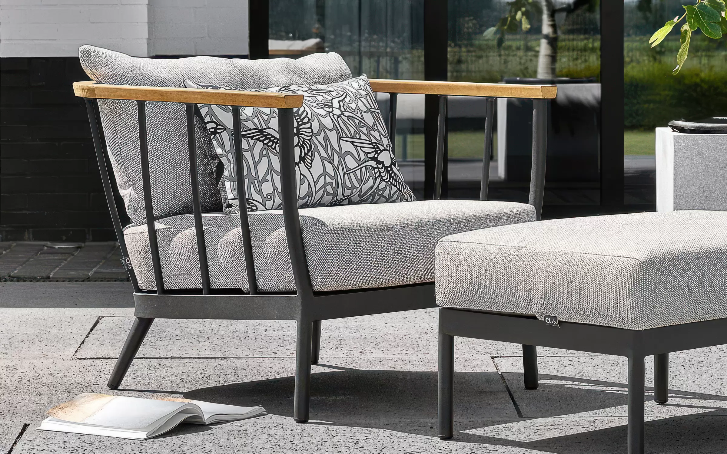 Fotel i podnóżek CONDOR to elementy kolekcji AppleBee zaprojektowane z myślą o komfortowym wypoczynku na zewnątrz. Lekka rama aluminiowa, teakowe detale i poduszki w technologii BEE WETT® tworzą zestaw, który łączy nowoczesny design z trwałością. Dostępne w dwóch wersjach kolorystycznych: jasnobeżowy oraz grafitowy.