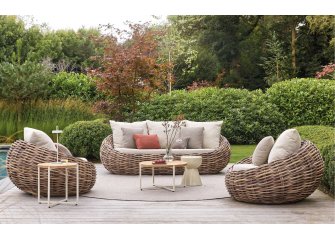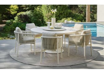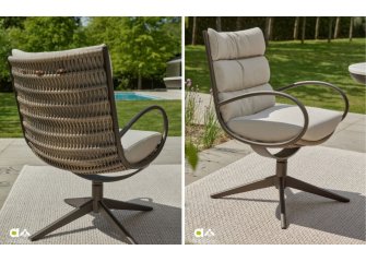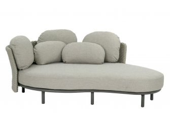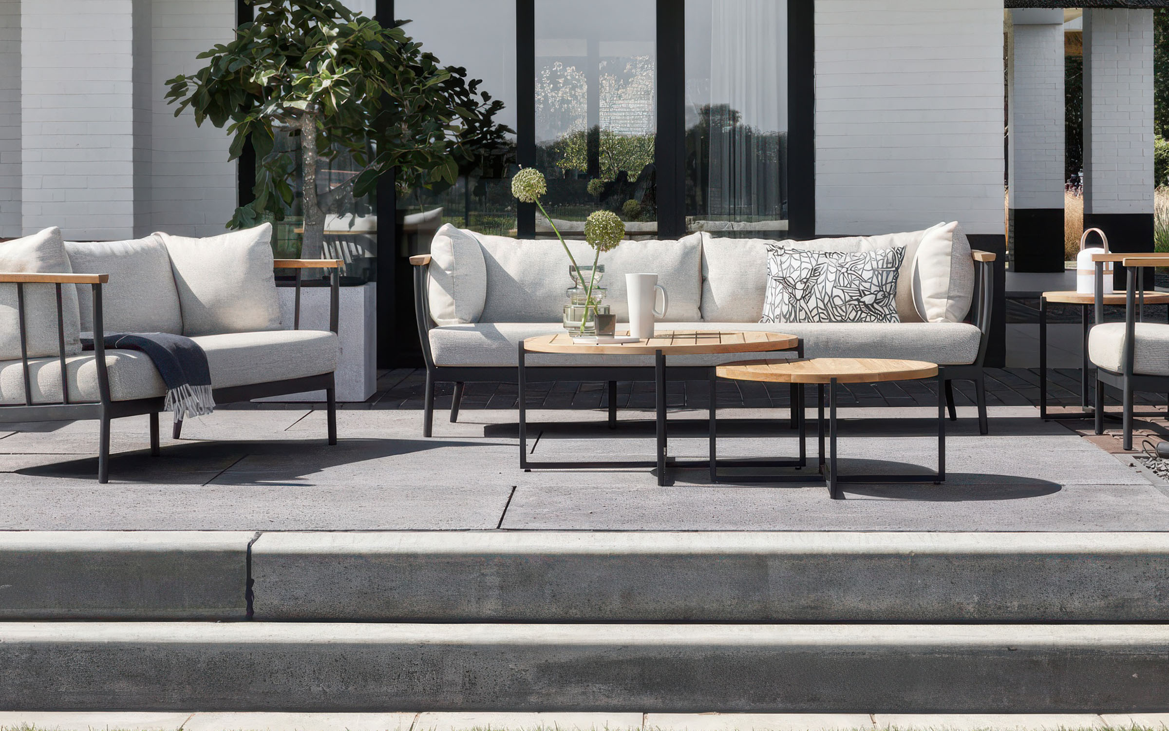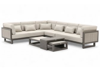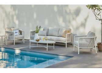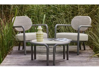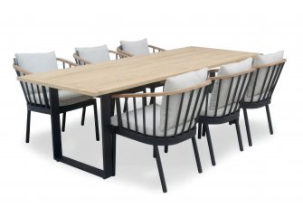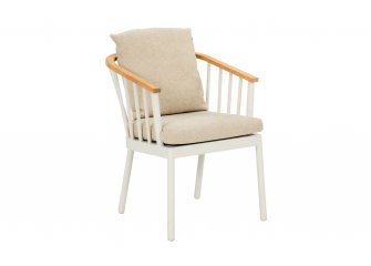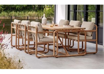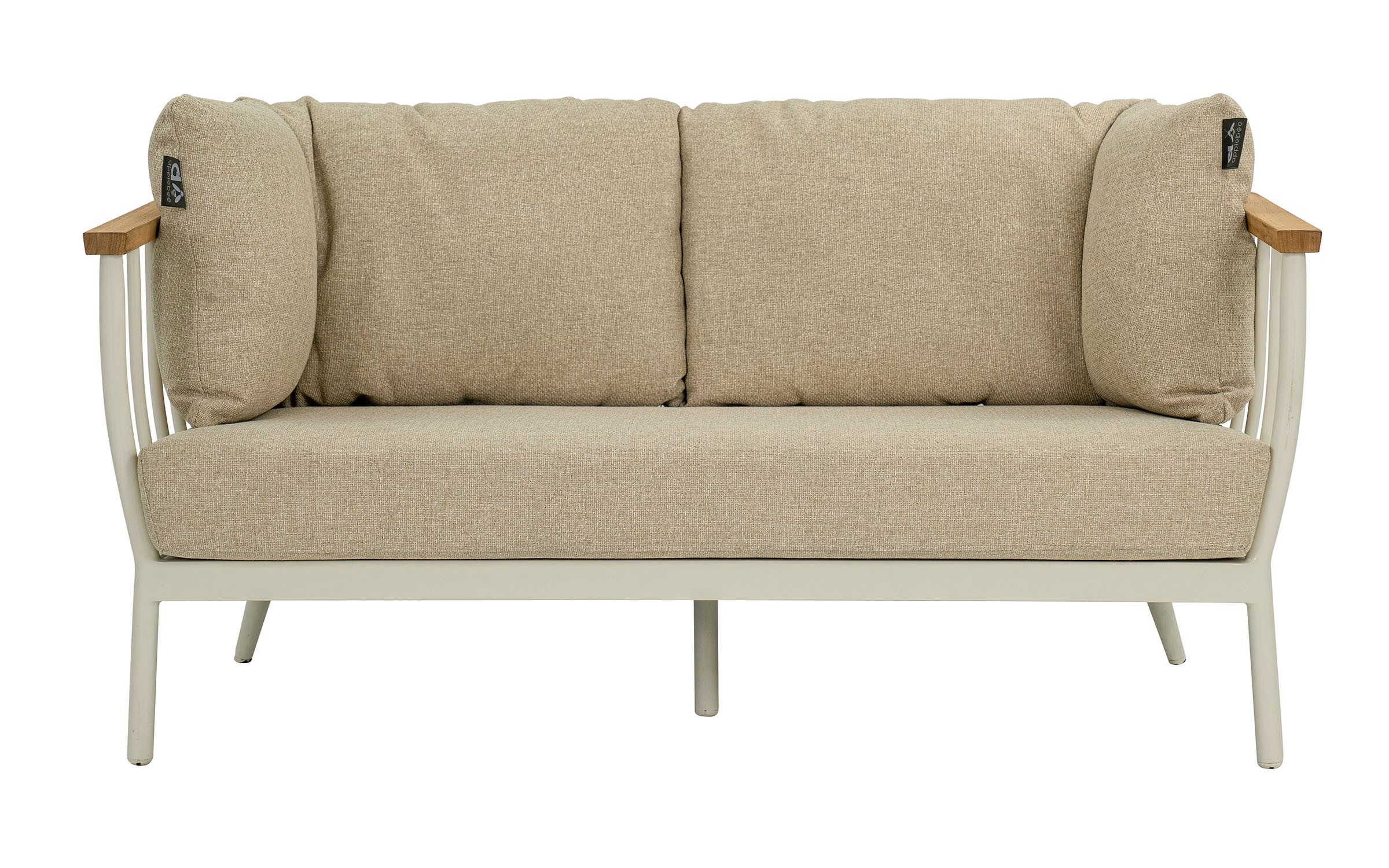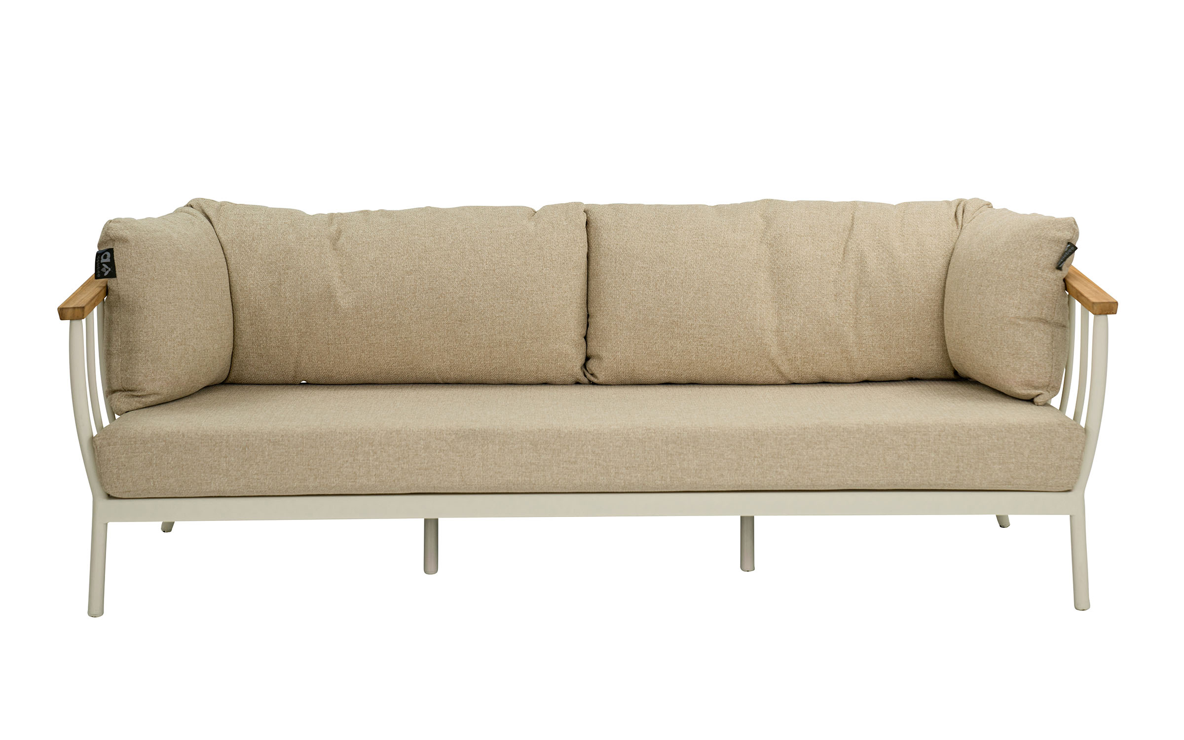 Rama wykonana jest z aluminium malowanego proszkowo — lekkiego, trwałego i odpornego na korozję. Podłokietniki z drewna teakowego SVLK dodają naturalnego akcentu i są odporne na wilgoć oraz promieniowanie UV. Poduszki posiadają wypełnienie w technologii BEE WETT®, a poszewki wykonano z tkaniny Olefin, która jest szybkoschnąca, odporna na pleśń i blaknięcie. Poszewki są zdejmowane i zapinane na zamek błyskawiczny.