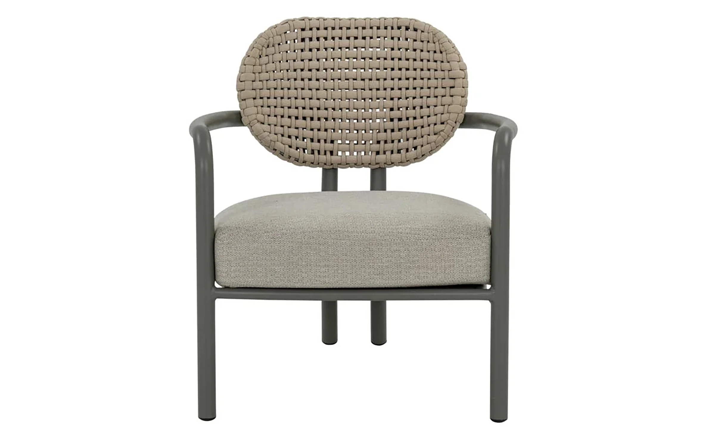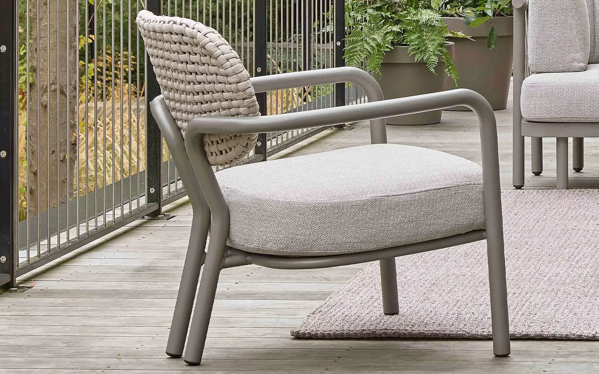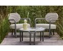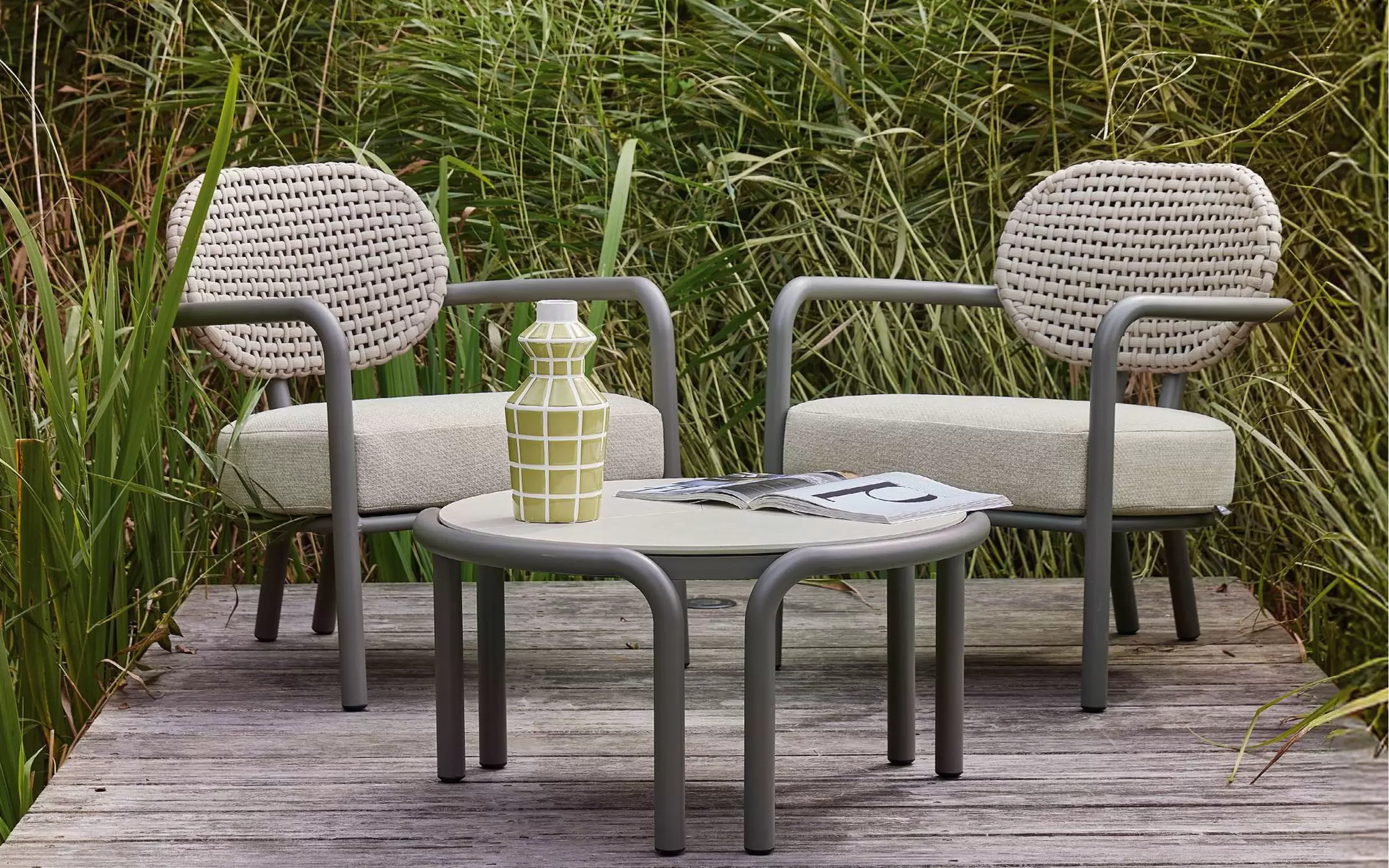 Konstrukcja foteli z malowanego proszkowo aluminium – lekka, nierdzewna i odporna na warunki atmosferyczne. Oparcie z plecionki syntetycznej rope – elastycznej, odpornej na promieniowanie UV i wilgoć. Poduszki z wypełnieniem Bee Wett – szybkoschnąca pianka o otwartej strukturze. Poszewki z tkaniny Olefin – odporne na blaknięcie, zabrudzenia i pleśń. Blat stolika wykonany z Sintered Stone – trwały, odporny na zarysowania, promieniowanie UV i wilgoć.