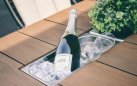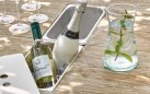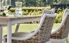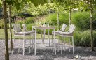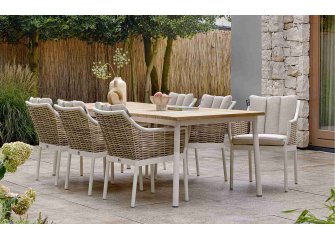Blat z drewna teak – naturalny, odporny na warunki zewnętrzne, z czasem nabiera szlachetnej patyny. Poduszki z wypełnieniem Bee Wett – szybkoschnąca pianka o otwartej strukturze. Poszewki z tkaniny Olefin – odporne na zabrudzenia, pleśń i blaknięcie.