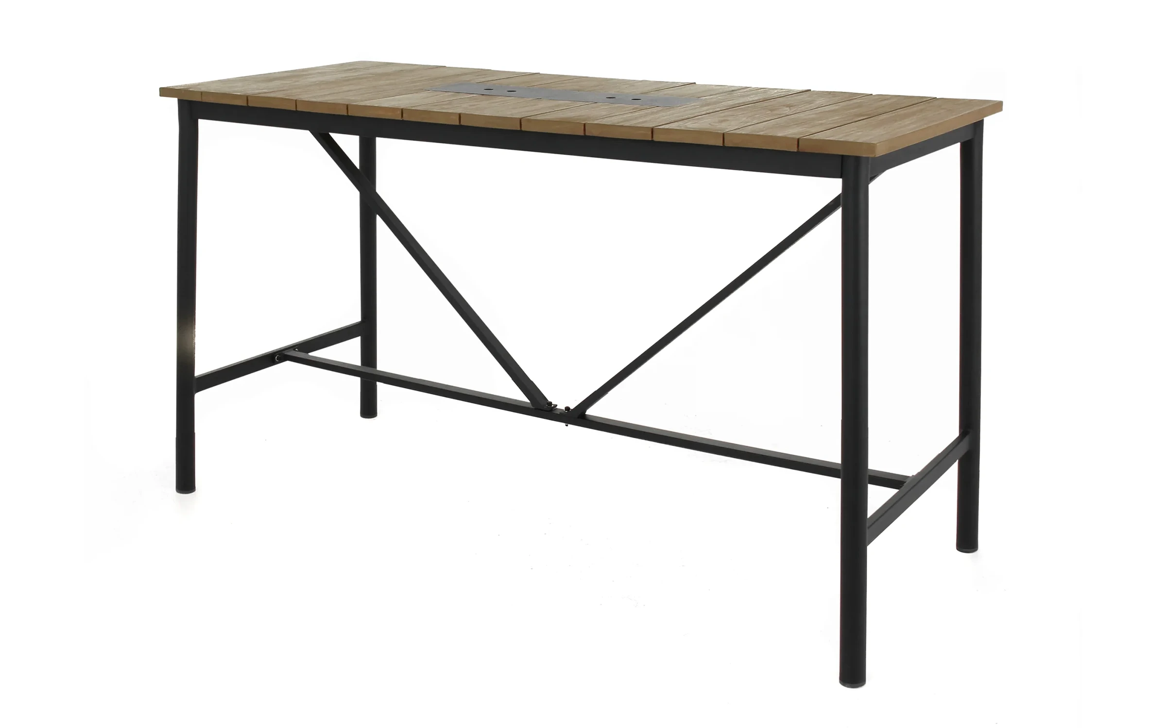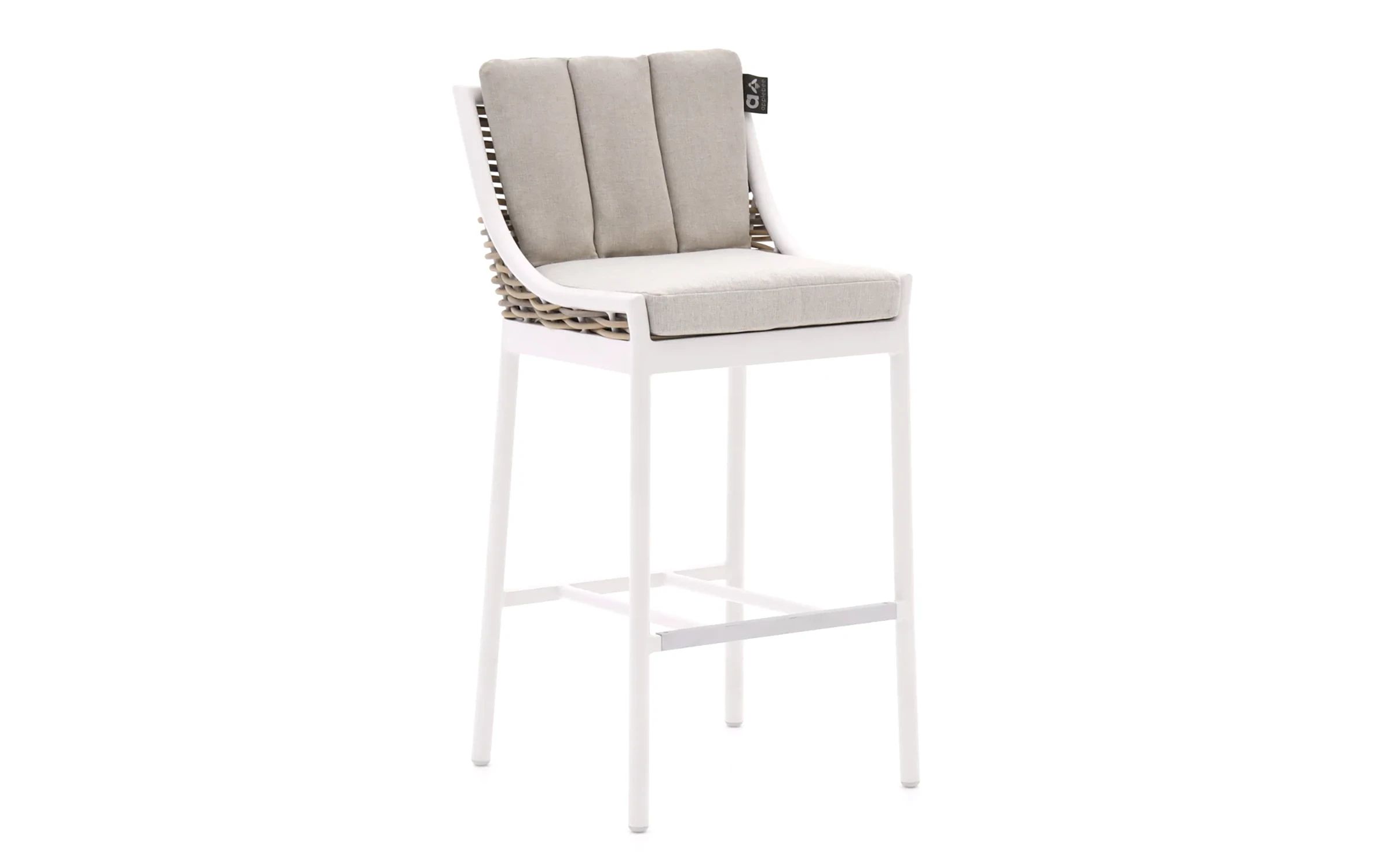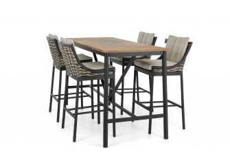 Zestaw barowy MILOU to elegancka propozycja do ogrodu lub na taras, łącząca naturalny teak z technorattanem i aluminium. W skład zestawu wchodzą cztery hokery MILOU z poduszkami All Weather oraz stół barowy wysoki z blatem teakowym o wymiarach 150×78×105 cm. Konstrukcja aluminiowa malowana proszkowo, odporna na warunki atmosferyczne.