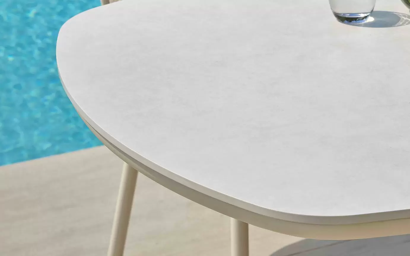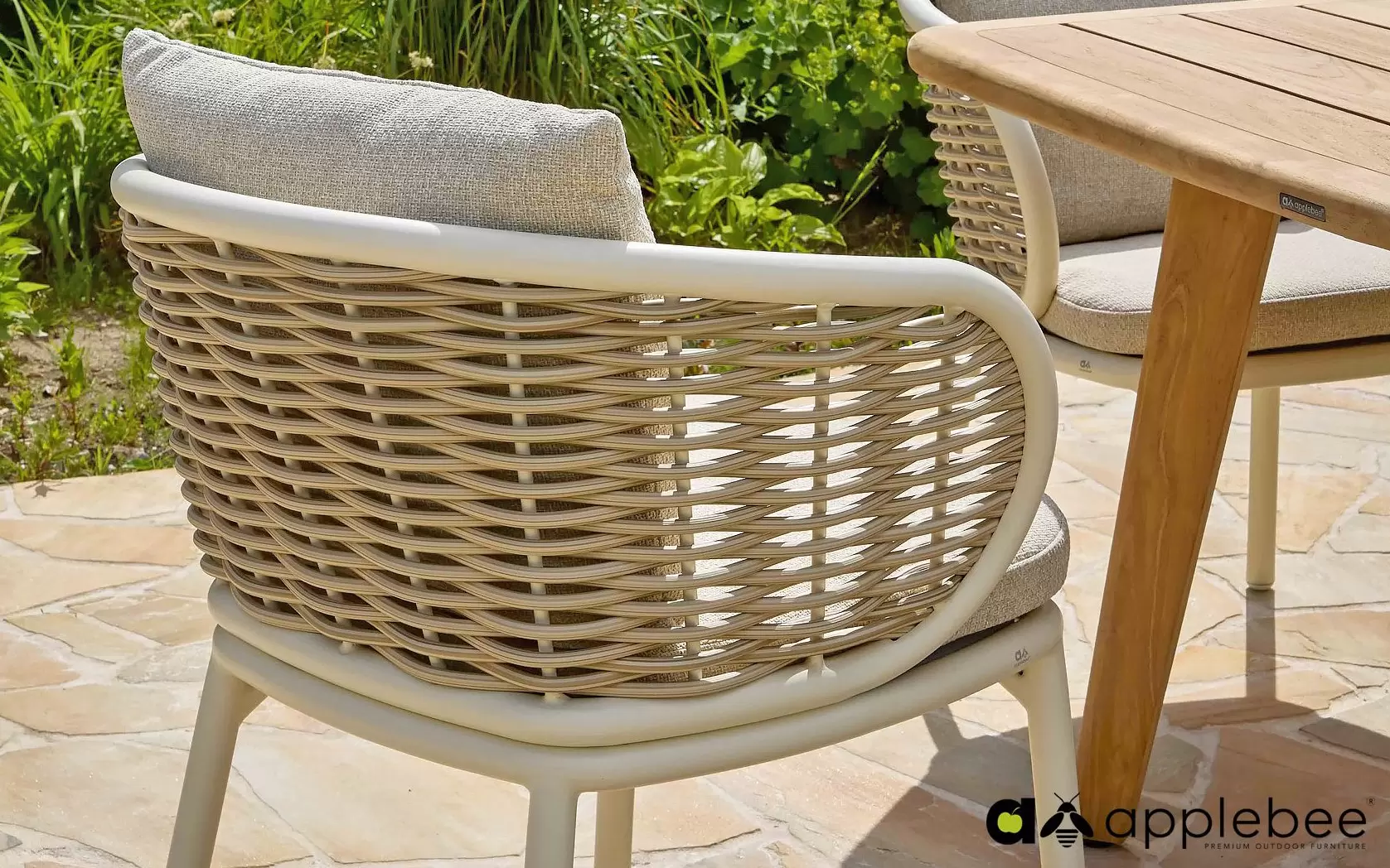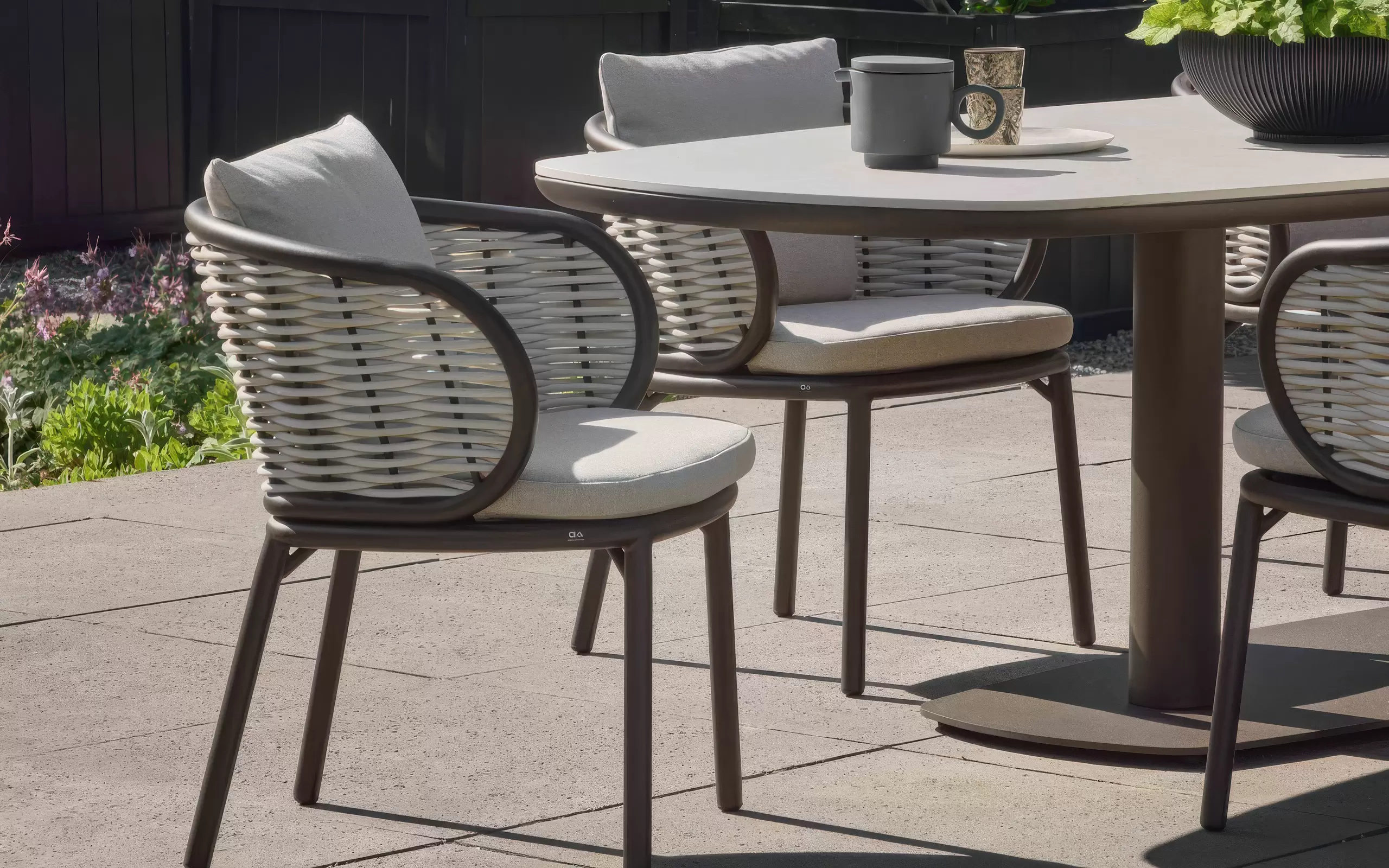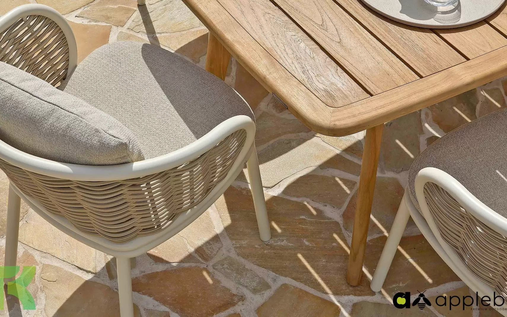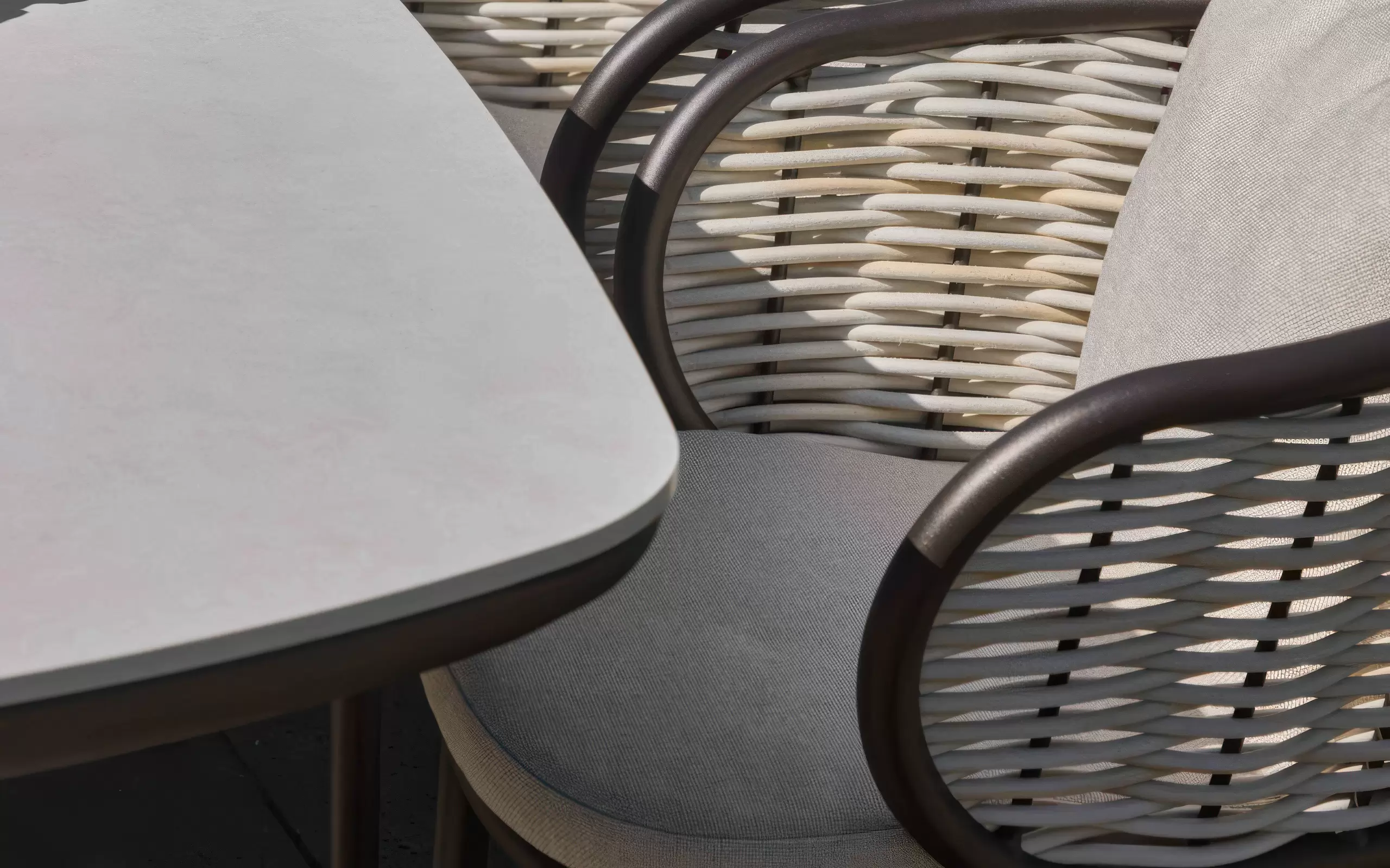 Komplet został zaprojektowany z myślą o bezobsługowej ekspozycji ogrodowej. Fuzja grubościennego aluminium, spieku kamiennego oraz szybkoschnących wypełnień poduszek sprawia, że zestaw nie wymaga zadaszenia ani sezonowej impregnacji. To techniczny wybór dla użytkowników, którzy oczekują mebli tarasowych o trwałości zbliżonej do stałych elementów architektury ogrodowej.