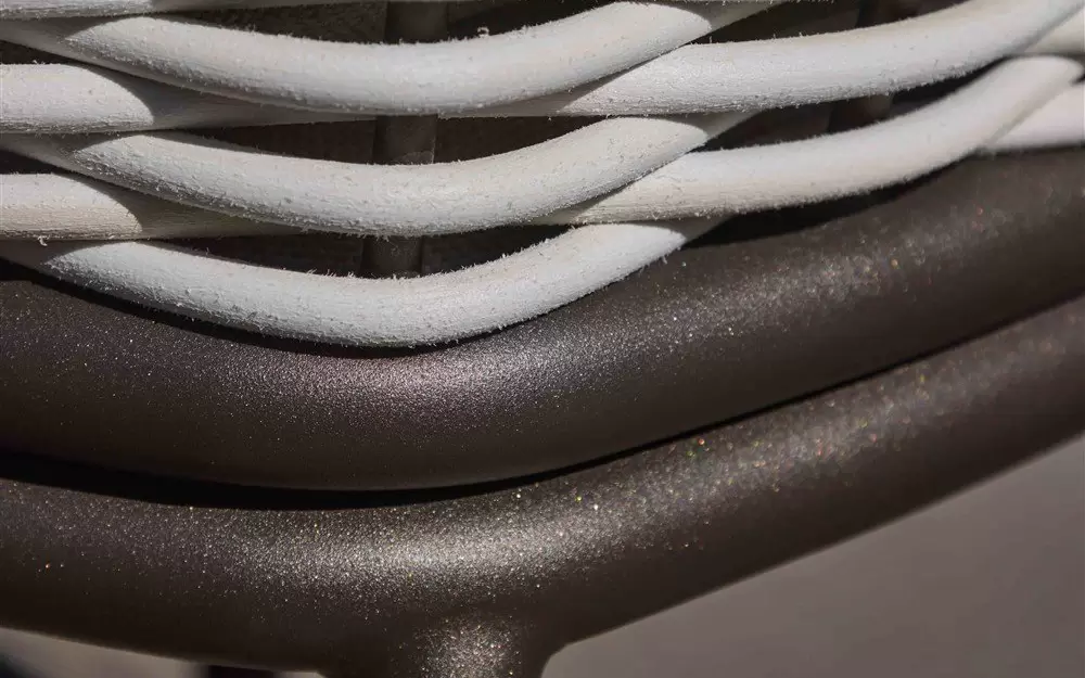 Aluminium malowane proszkowo – konstrukcyjny szkielet mebli wykonany z lekkiego, a zarazem sztywnego stopu o wysokiej gęstości. Malowanie proszkowe w technologii termicznego utwardzania tworzy powłokę całkowicie obojętną na korozję, promieniowanie UV oraz skrajne wahania temperatur, co wyklucza ryzyko łuszczenia się farby.