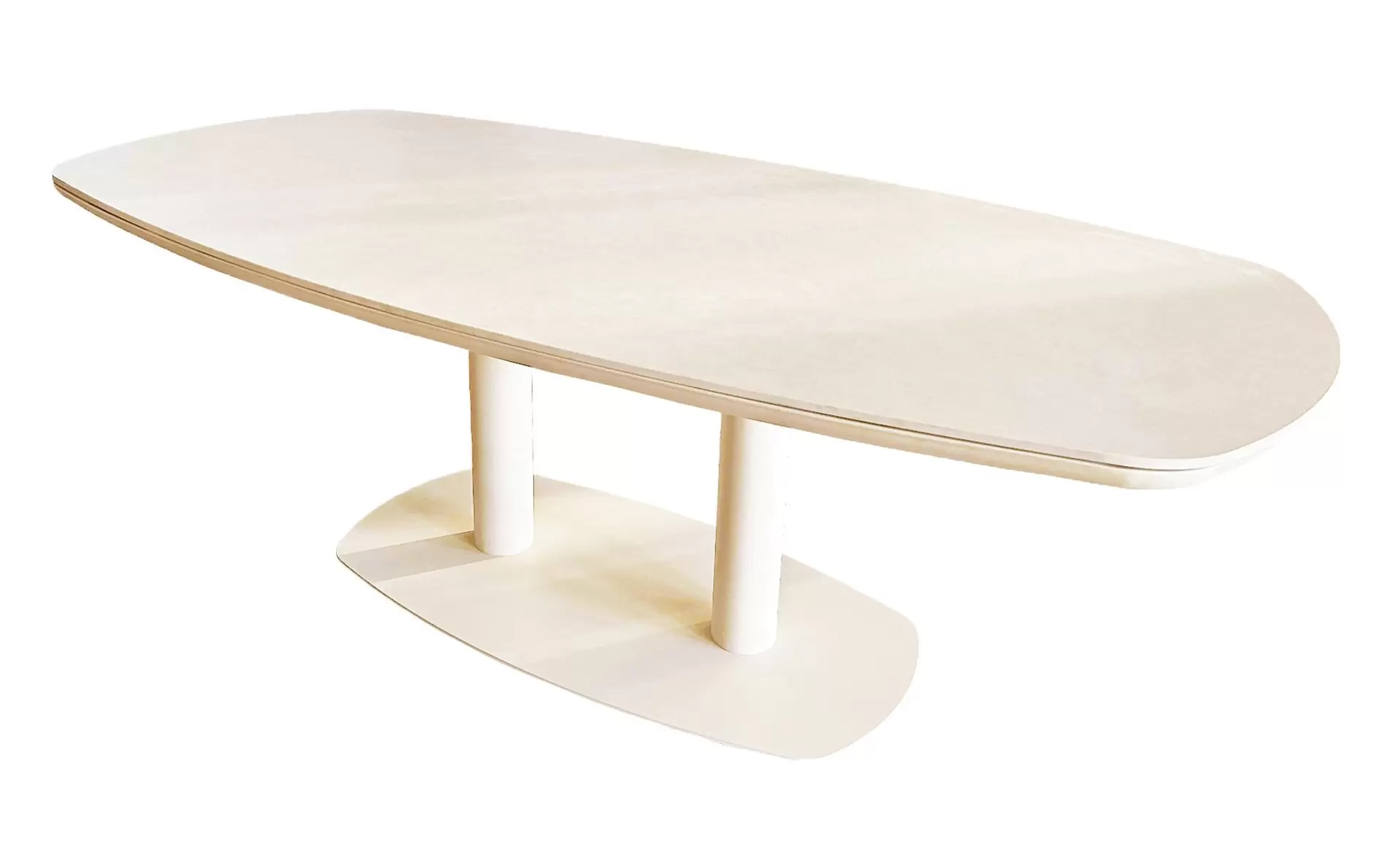 Spiek kamienny (Stone Sinter) – blat stołu Melville powstały w procesie prasowania minerałów pod ekstremalnym ciśnieniem. Materiał jest kategorycznie odporny na zarysowania, szok termiczny (możliwość odstawiania gorących naczyń) oraz nie wchłania substancji oleistych ani barwiących, pozostając plamoodpornym przez cały okres użytkowania.