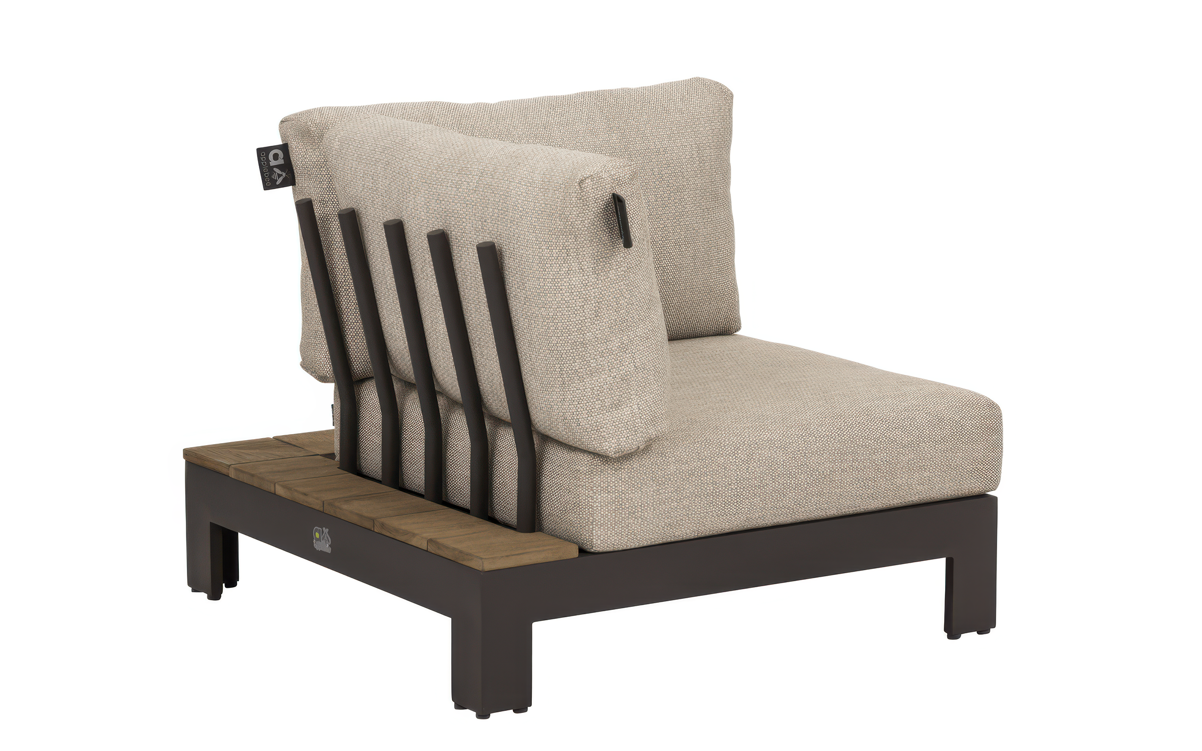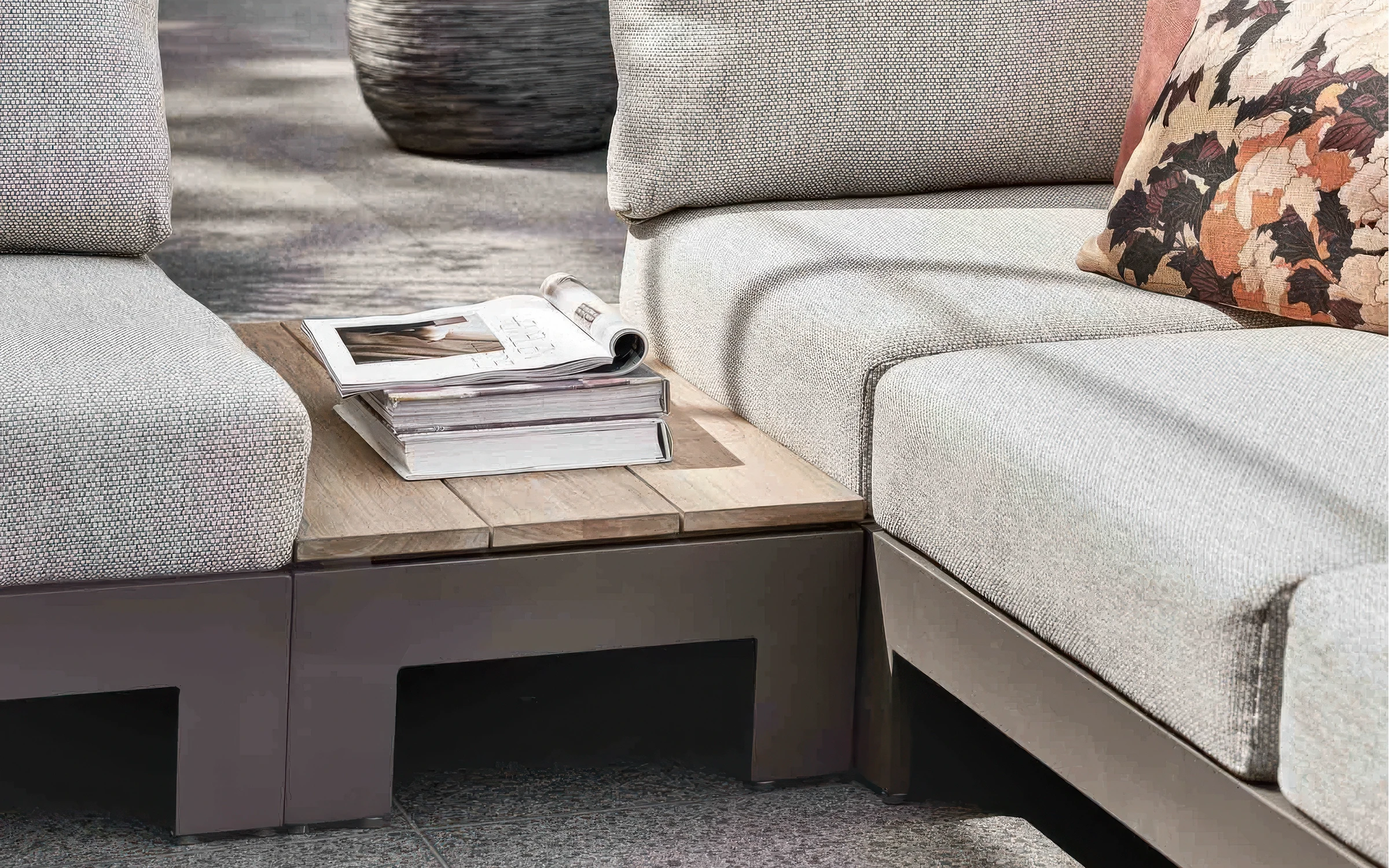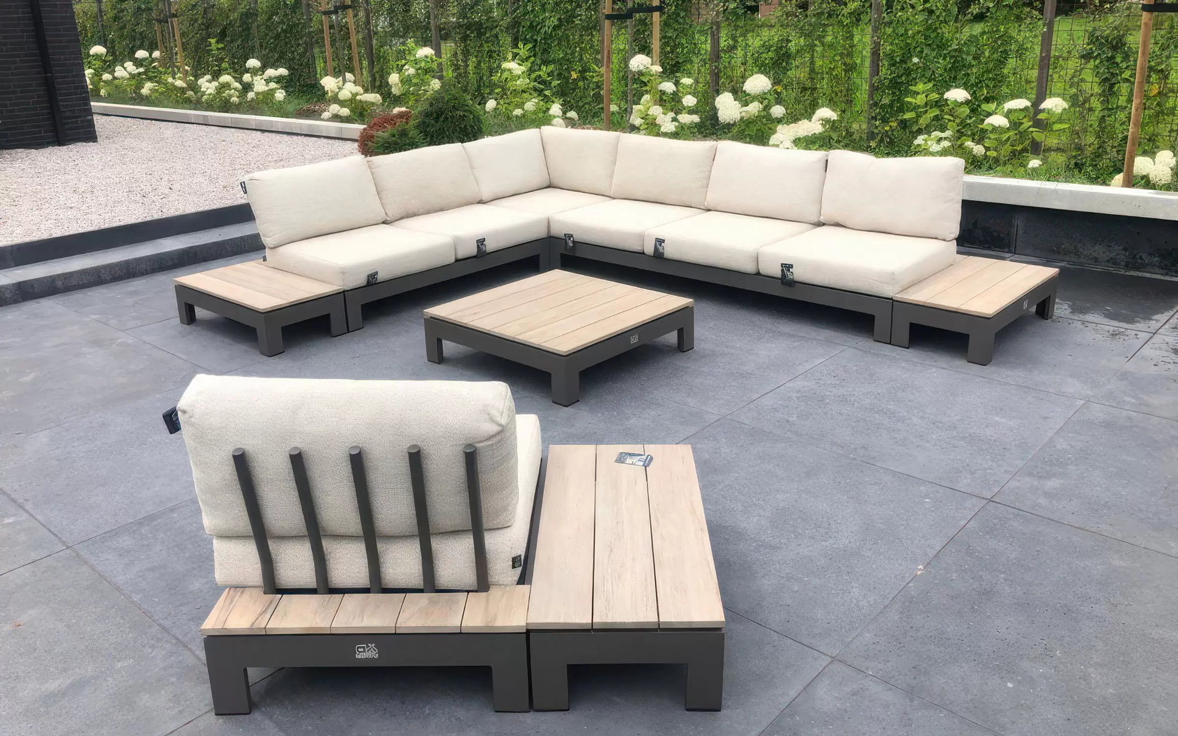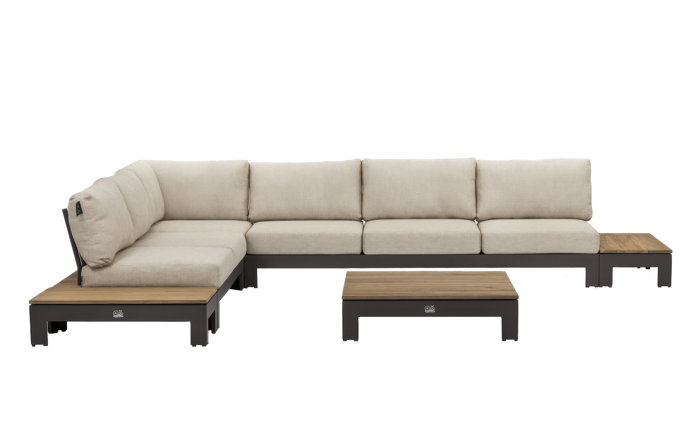 Narożnik ogrodowy STICKS AND MORE — modułowy symetryczny zestaw z aluminiową ramą w kolorze taupe, poduszkami Bee Wett all‑weather i blatami teakowymi; przeznaczony do stałego użytkowania na zewnątrz. Wersja lewa; możliwość dokupienia pojedynczych modułów i akcesoriów ochronnych. Na zdjęciach widać wersję z 1 sofą 2-osobową i 1 sofą 3-osobową - niedostępna.