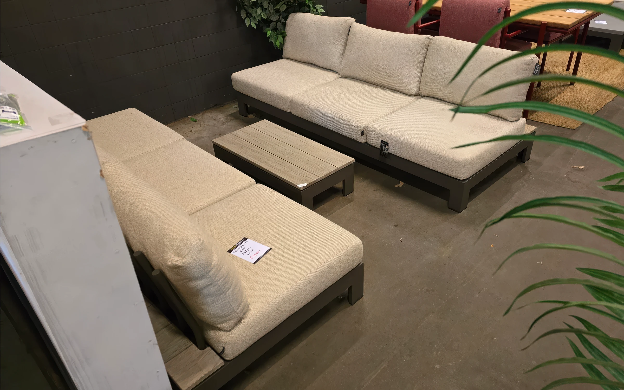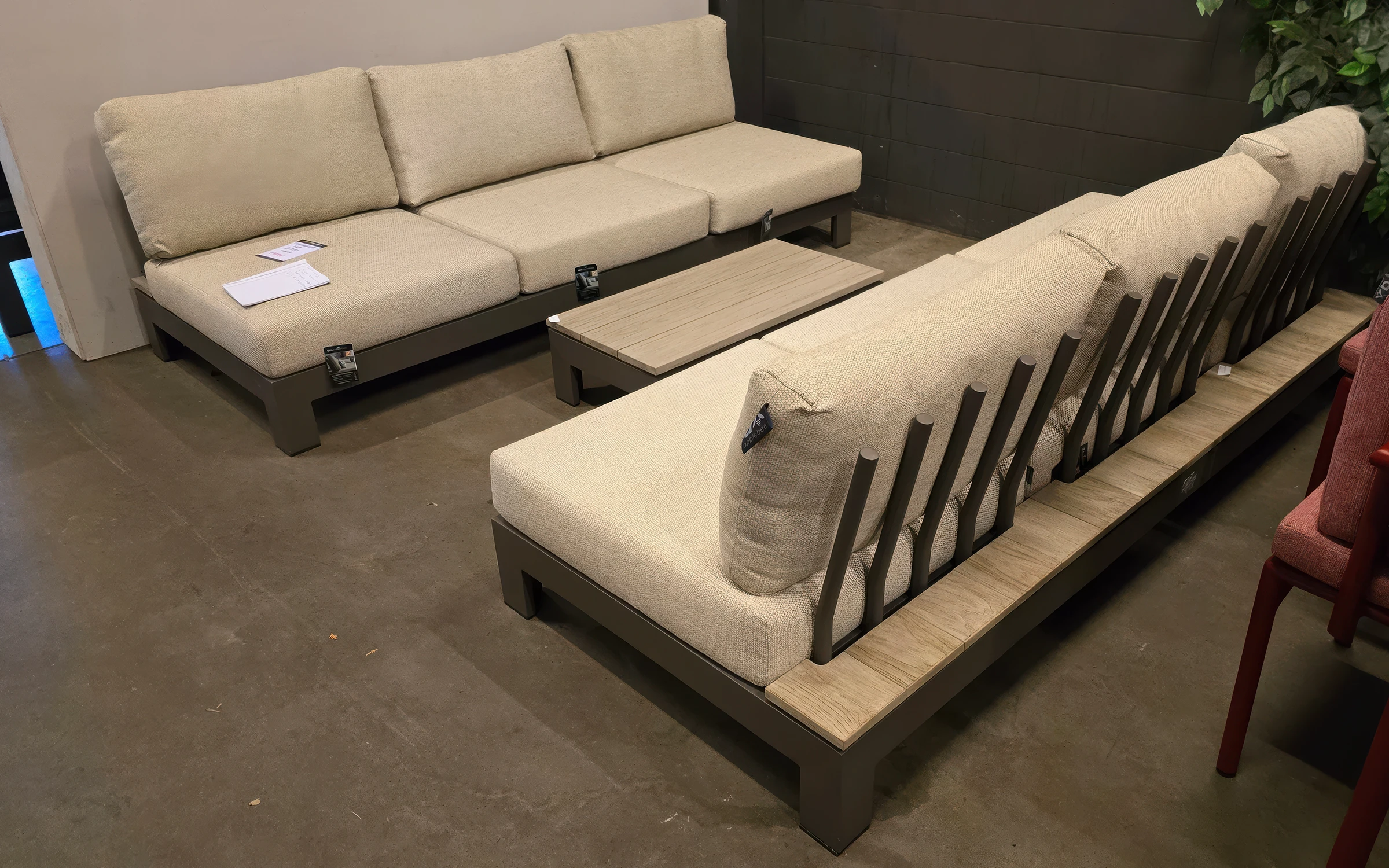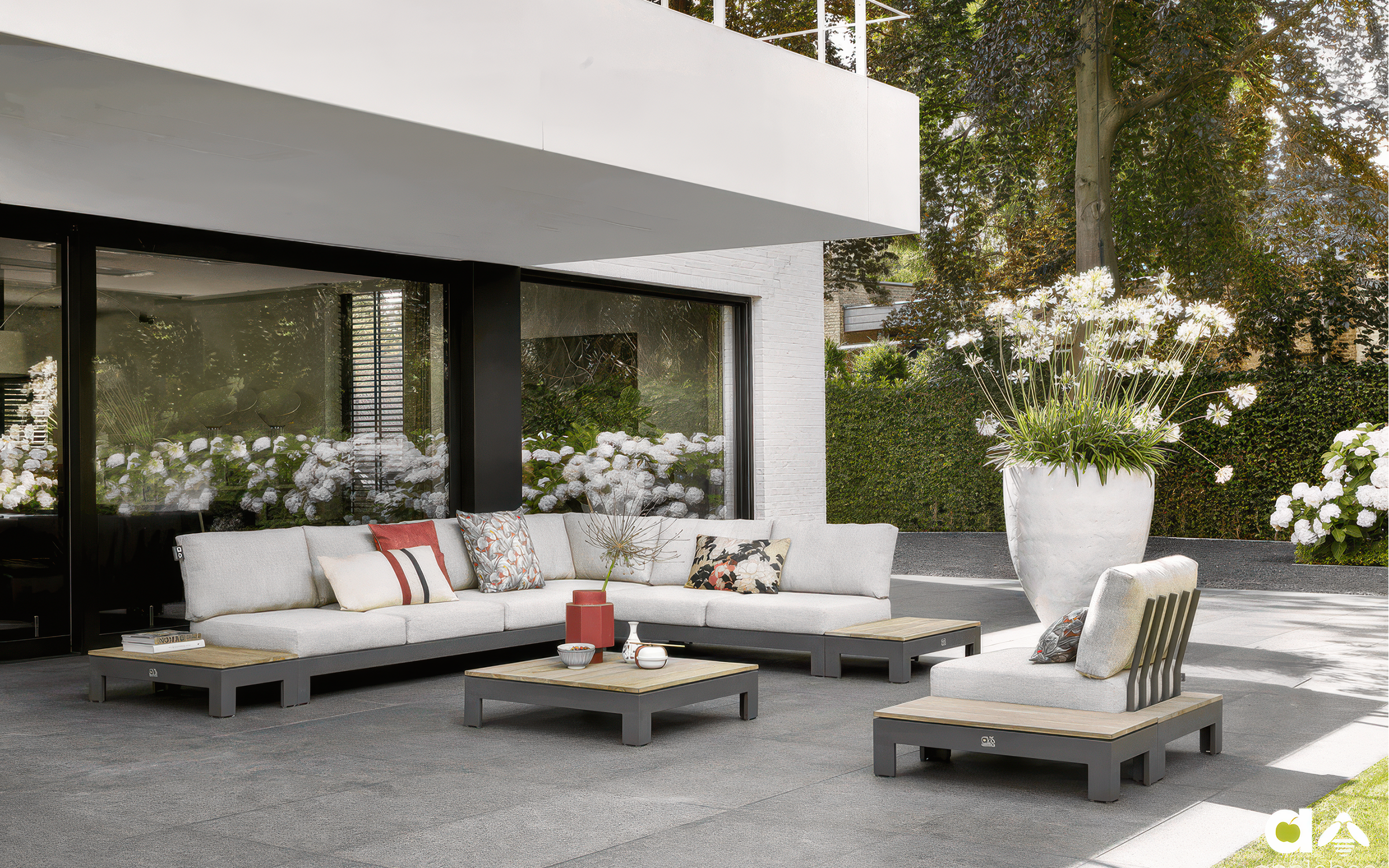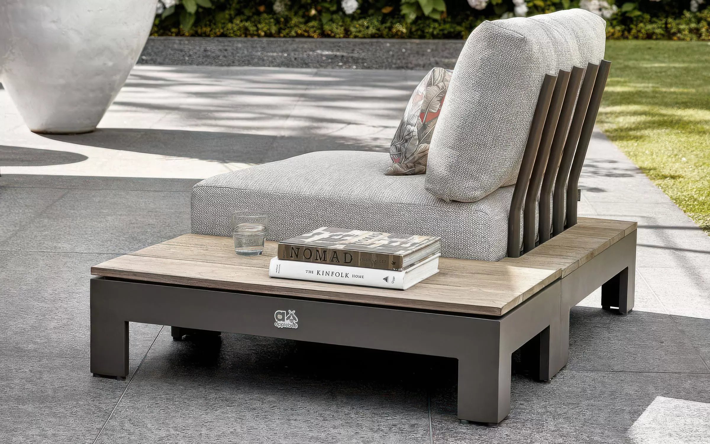 Narożnik ogrodowy STICKS AND MORE — modułowy symetryczny zestaw z aluminiową ramą w kolorze taupe, poduszkami Bee Wett all‑weather i blatami teakowymi; przeznaczony do stałego użytkowania na zewnątrz. Wersja lewa; możliwość dokupienia pojedynczych modułów i akcesoriów ochronnych. Na zdjęciach widać wersję z 1 sofą 2-osobową i 1 sofą 3-osobową - niedostępna.
