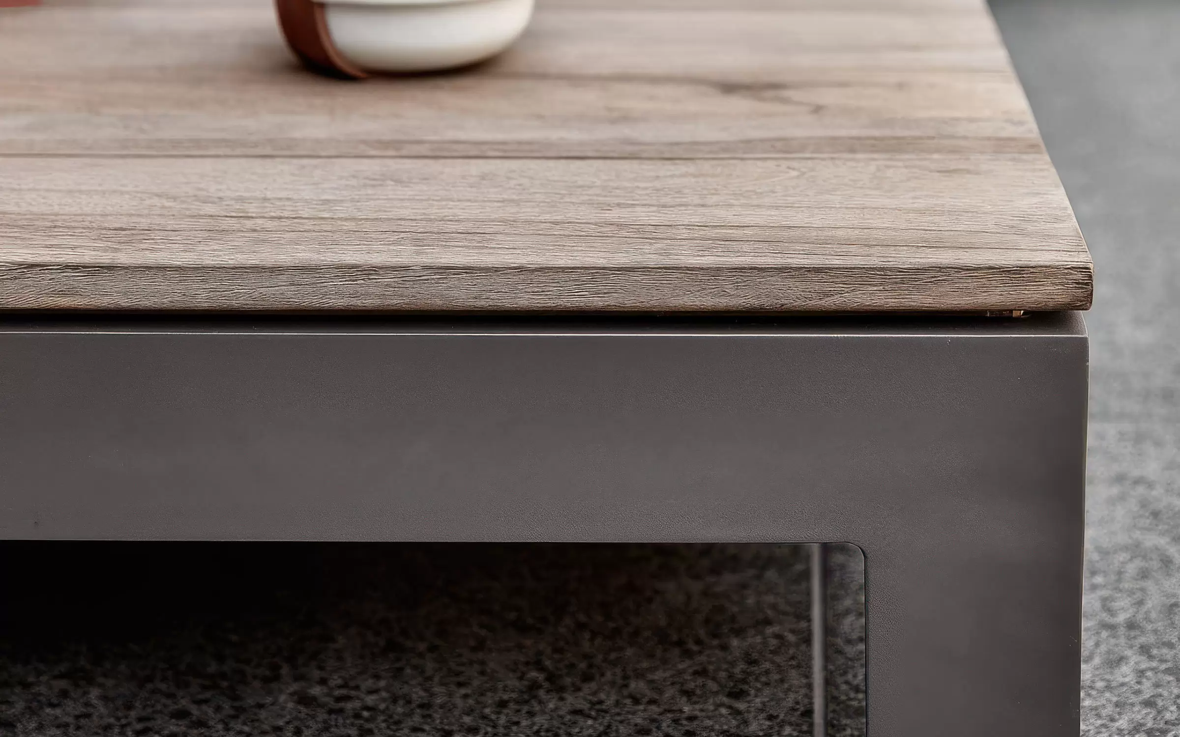 Blaty wykonano z teaku poszarzanego naturalnego posiadającego certyfikat SVLK. Teak jest trwały i odporny na wilgoć. Drewno naturalnie zszarzeje pod wpływem warunków atmosferycznych, a olejowanie przywraca pierwotny odcień.