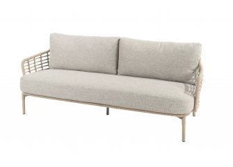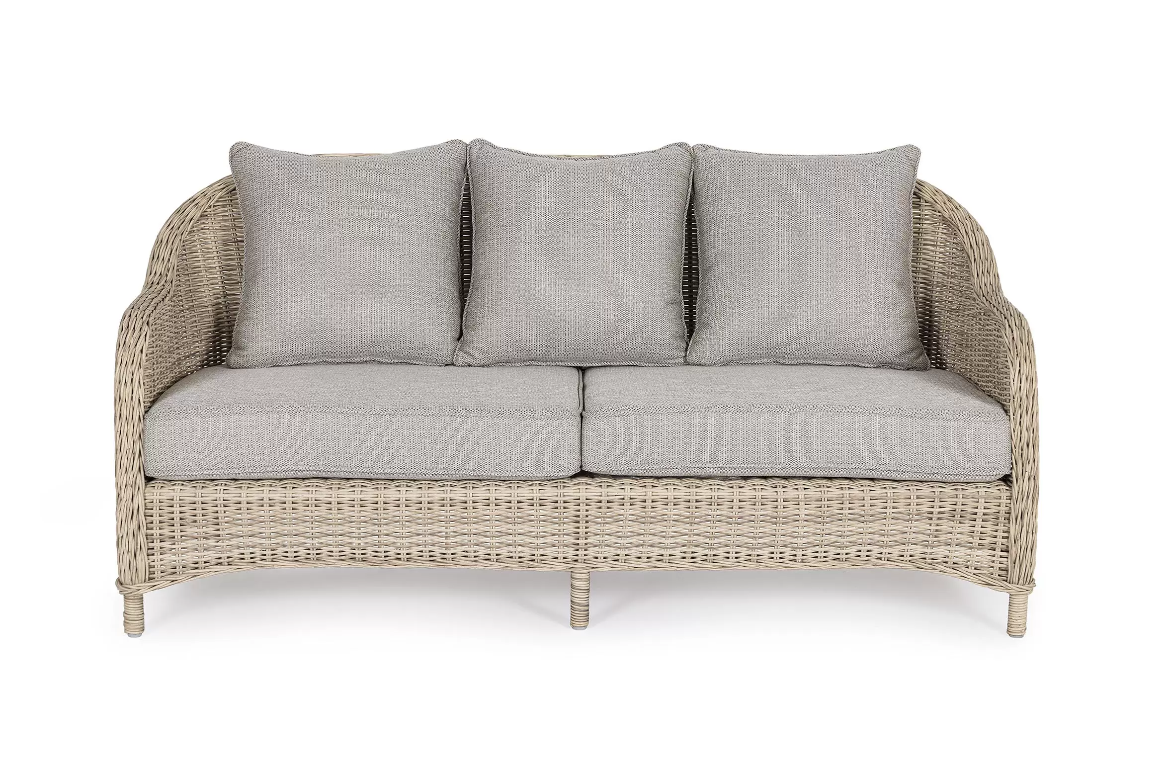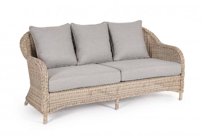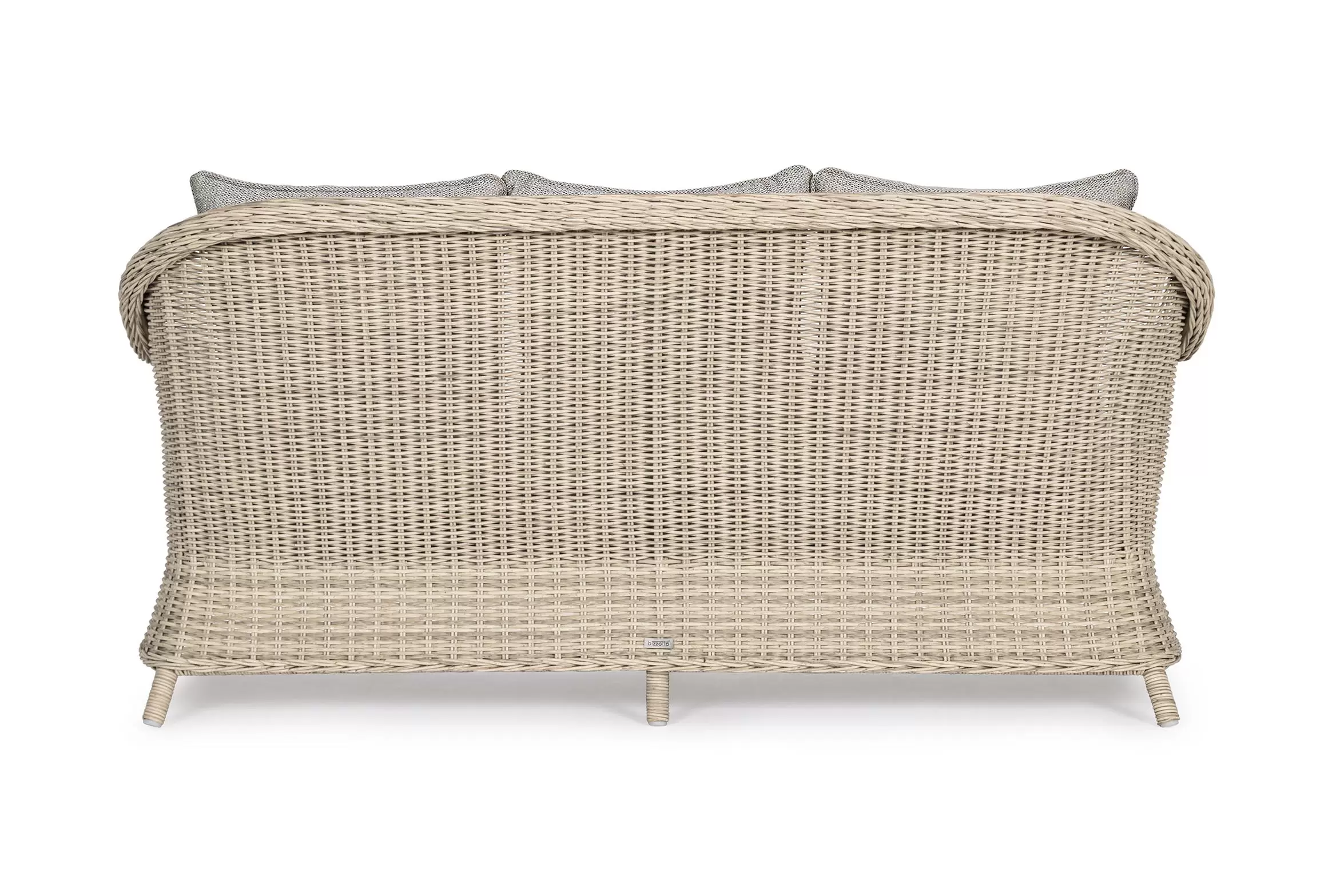 Ekskluzywna sofa ogrodowa na taras w klasycznej formie.  Kanapa wykonana z technorattanu beżowego. Poduszki wodoodporne ze zdejmowanymi poszewkami z materiału Olefin.
