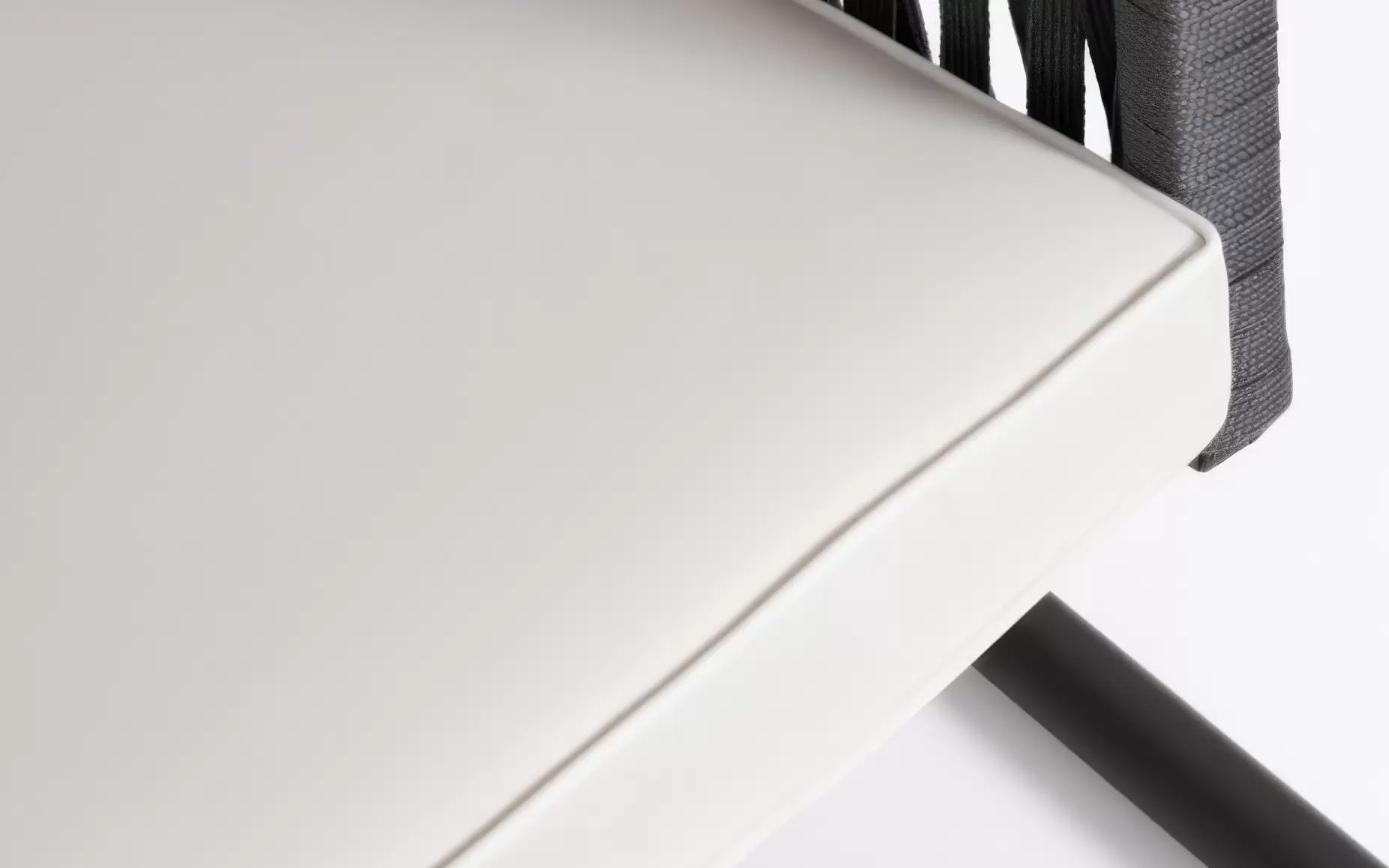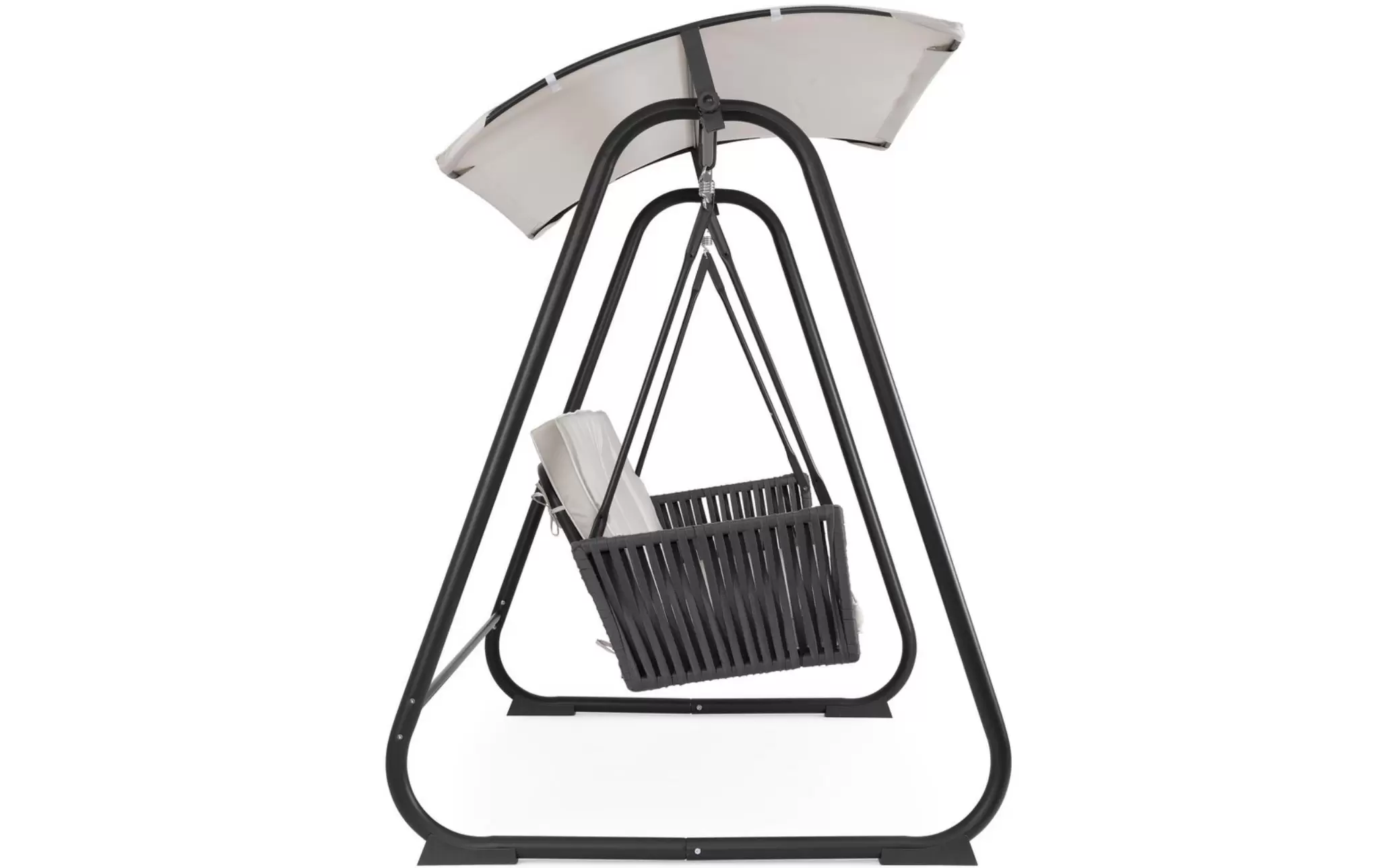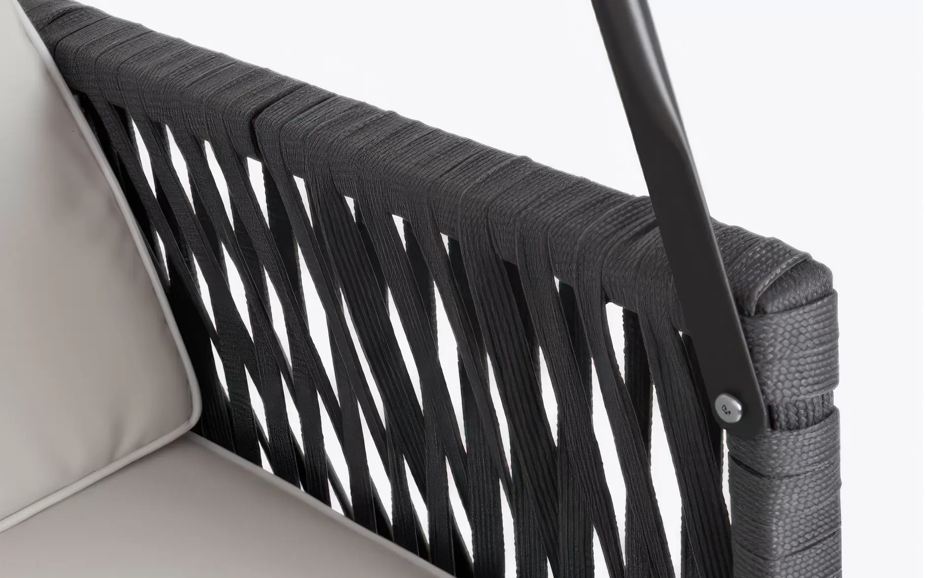 Podłokietniki wykończono plecioną liną poliestrową, a poduszki wykonano z tkaniny wodoodpornej z pikowanym oparciem i zdejmowanym pokrowcem siedziska. Daszek z poliestru umożliwia swobodną regulację kąta nachylenia.