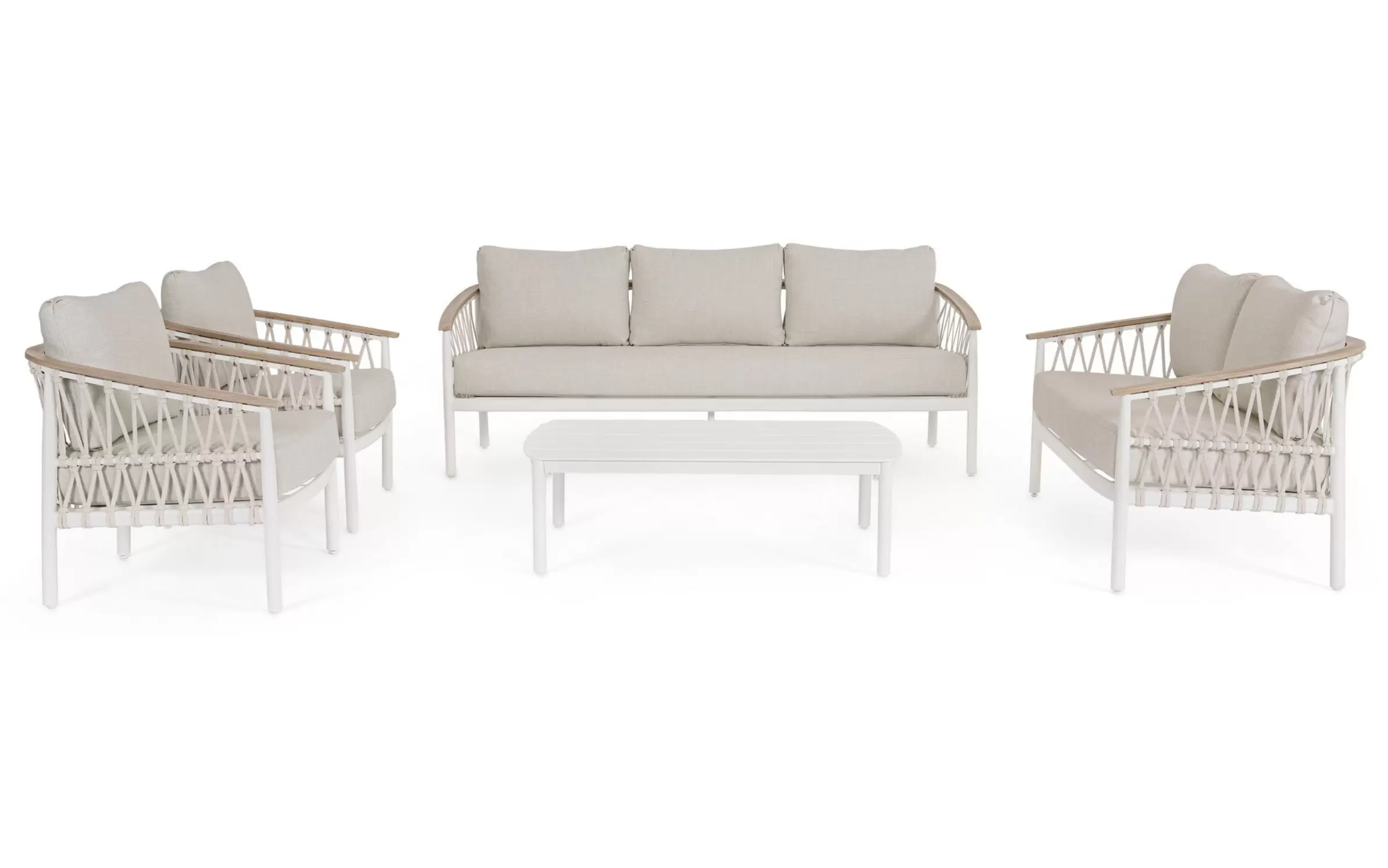 Plecionka rope – syntetyczna lina o wysokiej gęstości włókien, odporna na UV i wilgoć. Zachowuje sprężystość i kolor przez wiele sezonów, nadając fotelowi rzemieślniczy, elegancki charakter.