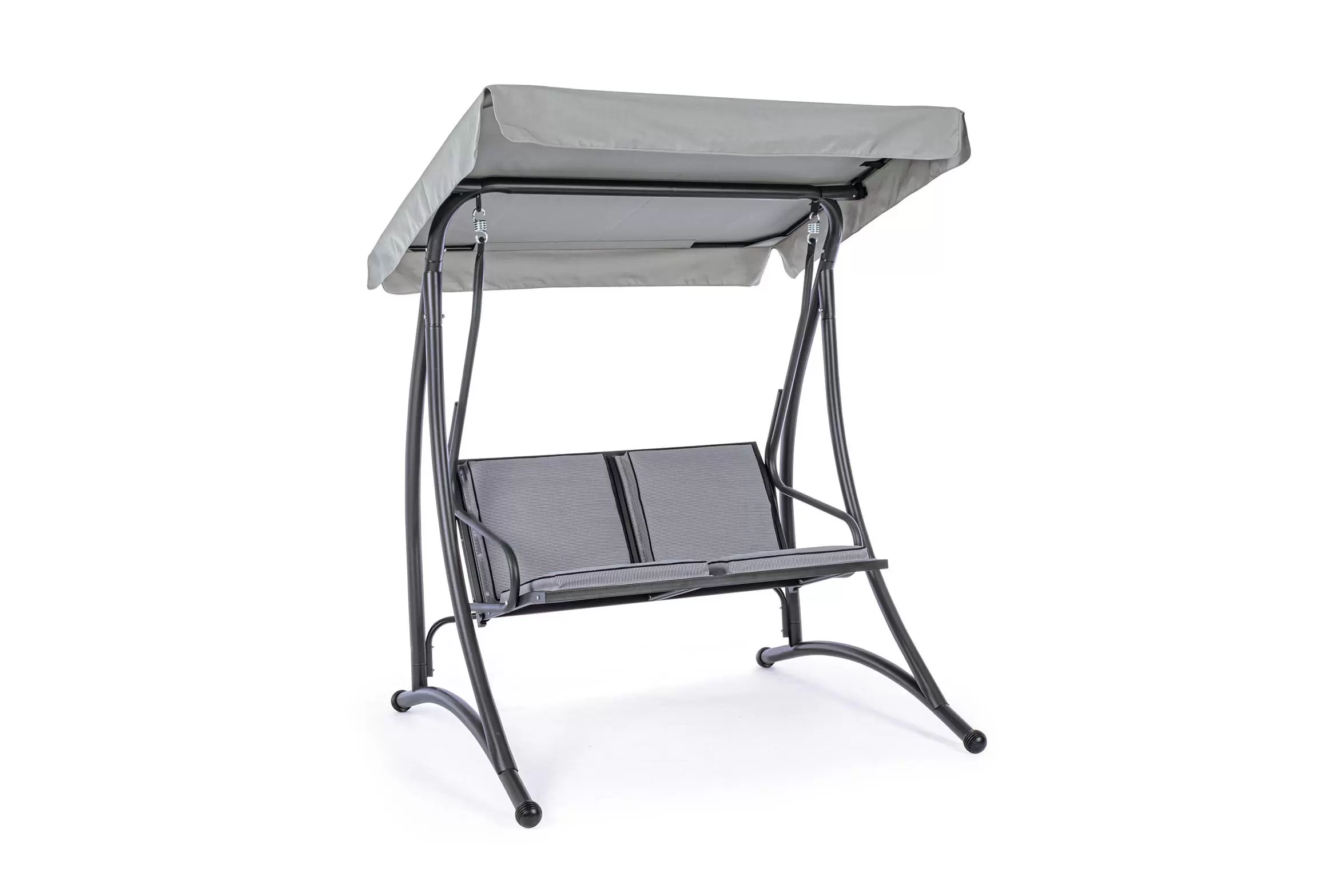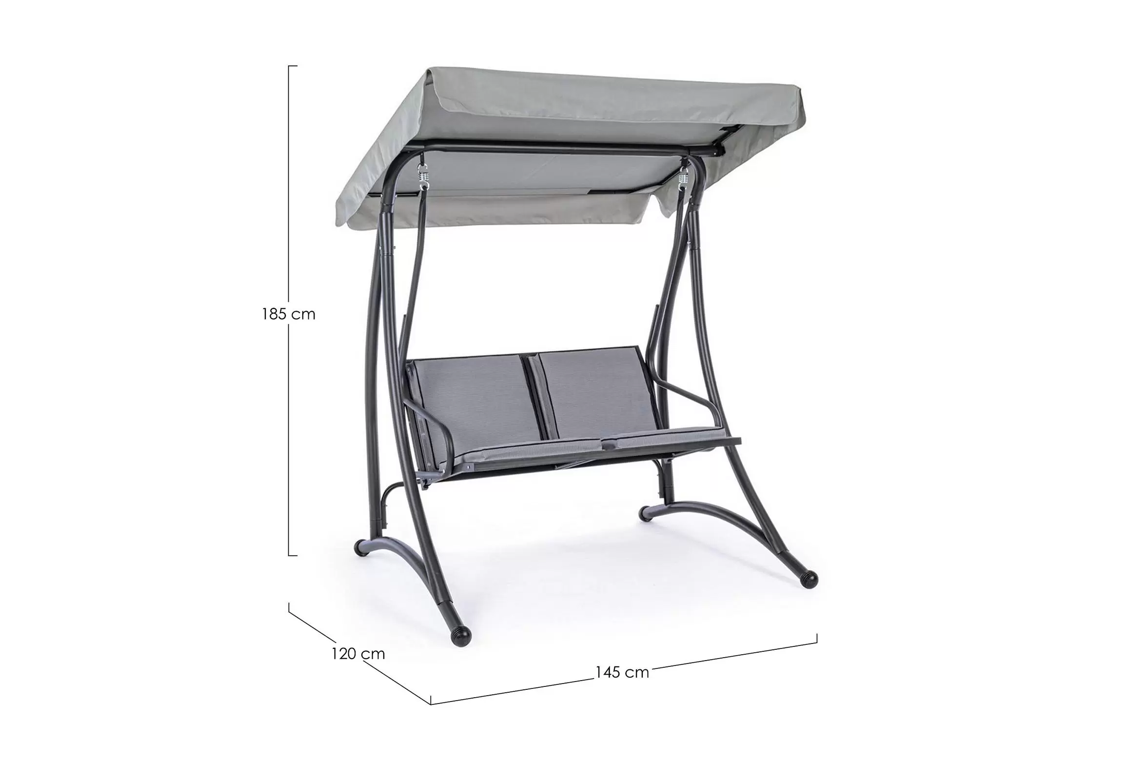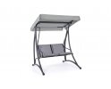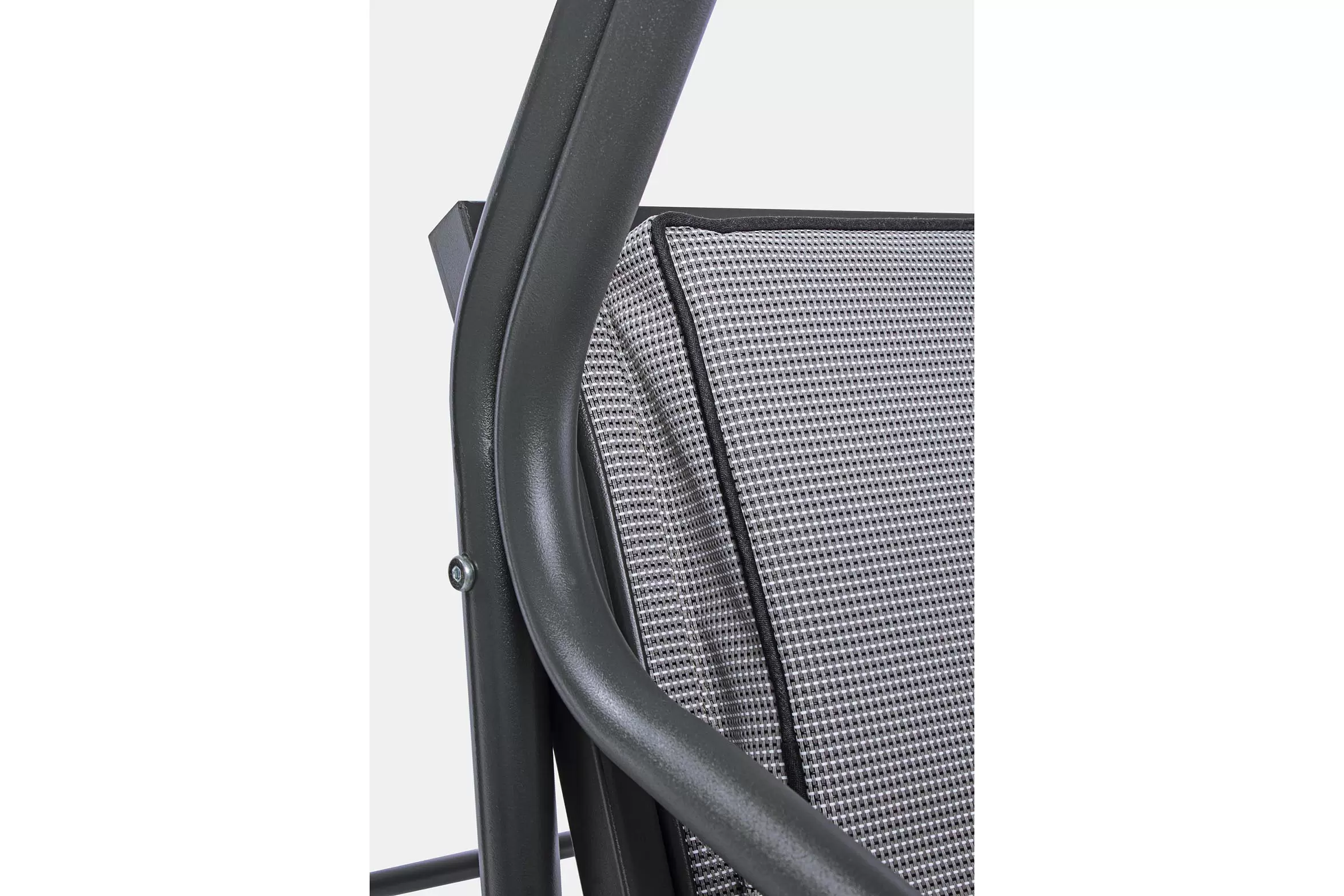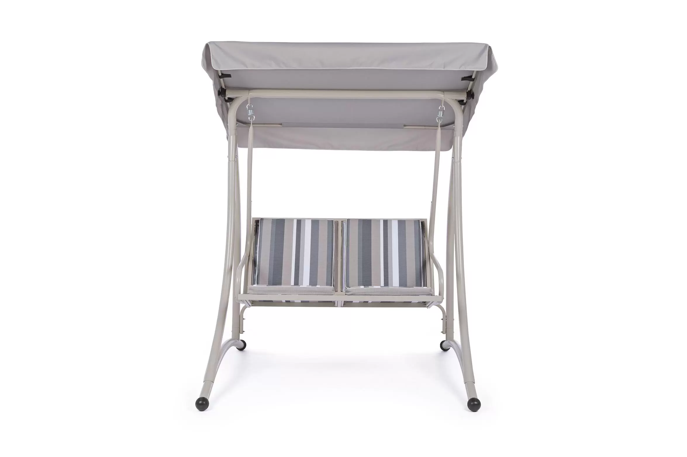 Stalowa huśtawka ogrodowa z daszkiem dla 2 osób. Dwa kolory konstrukcji oraz siedziska z miękkim wypełnieniem szybkoschnącym z tekstyliny.