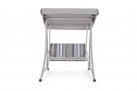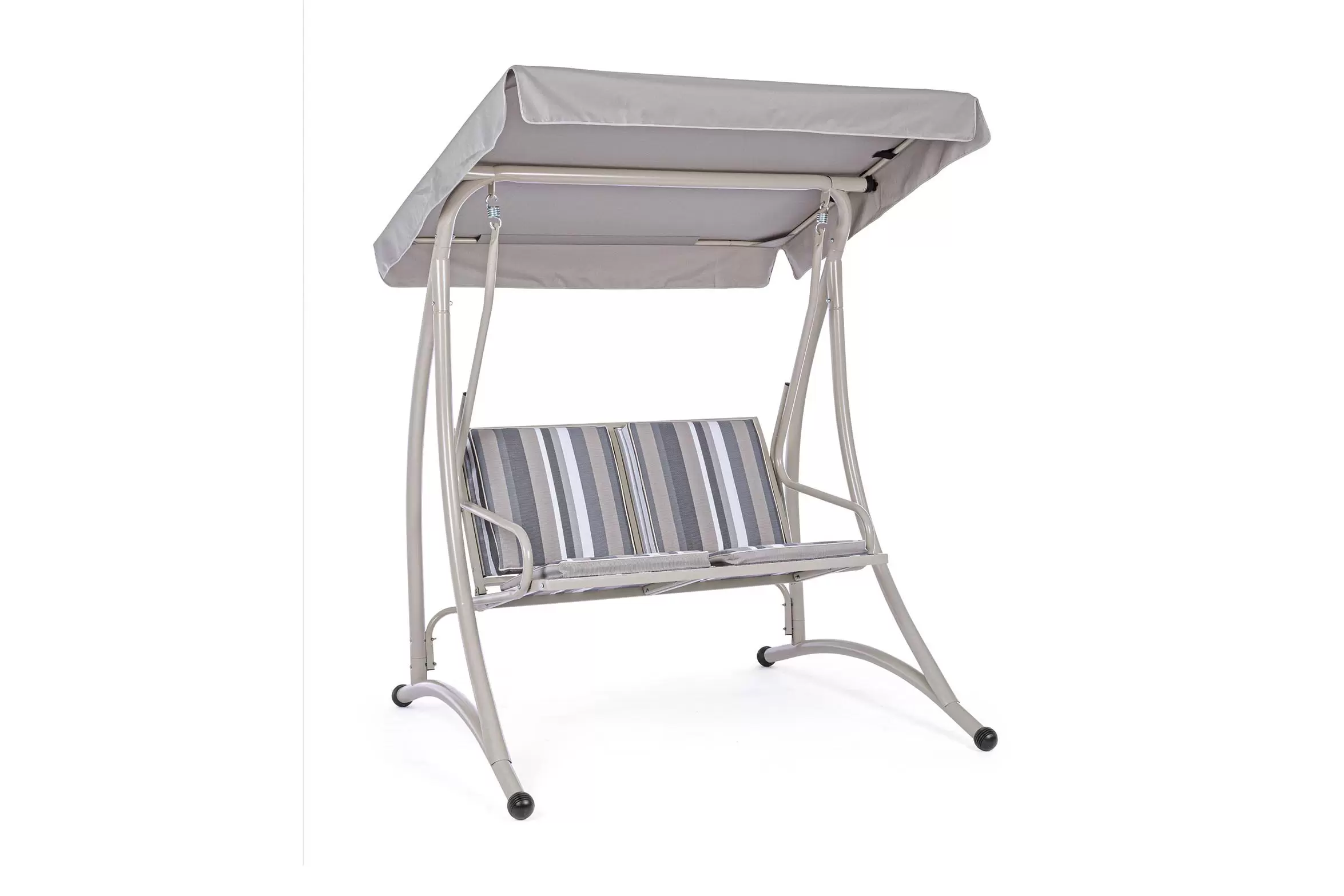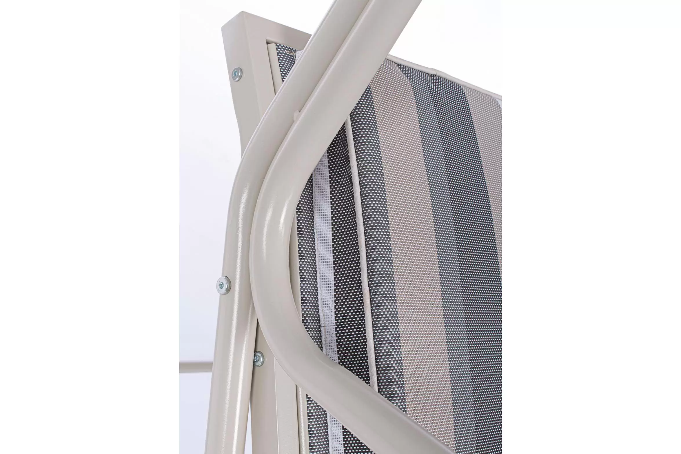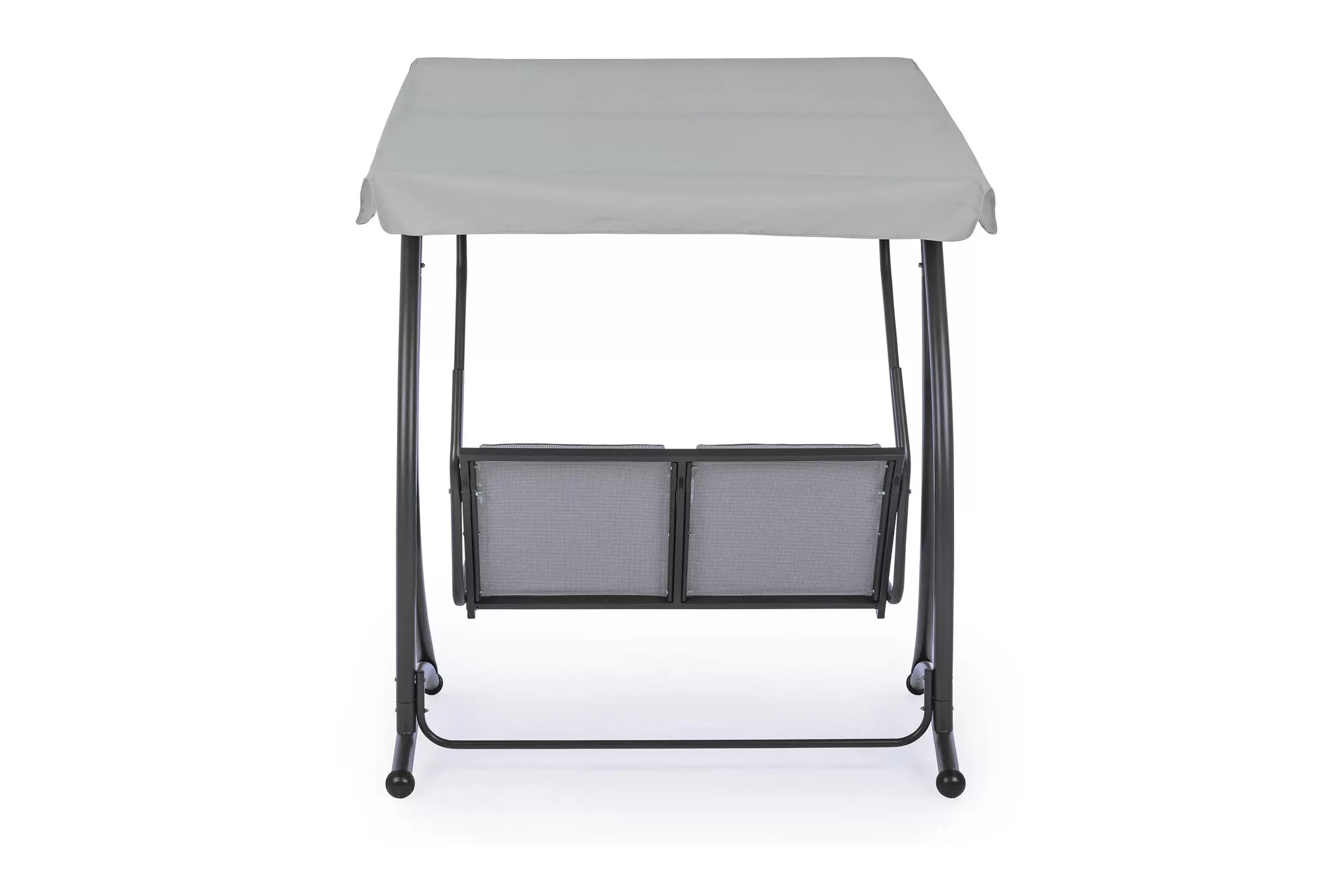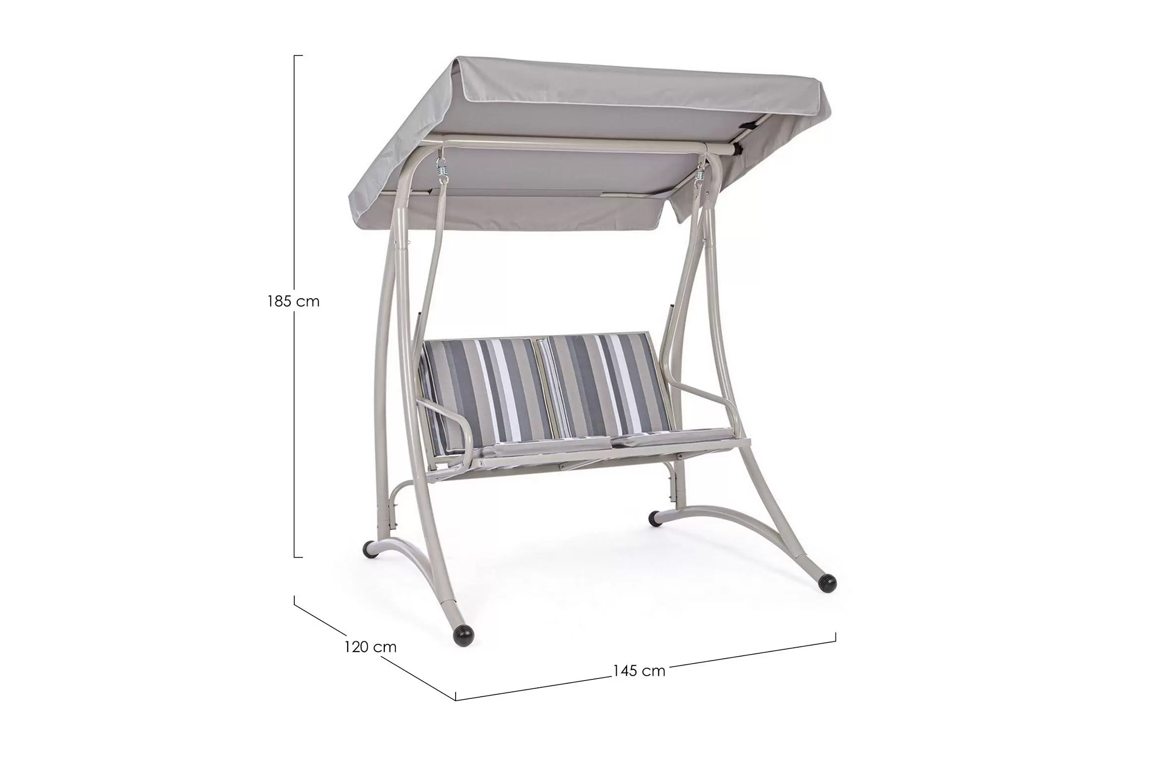 Stalowa huśtawka ogrodowa z daszkiem dla 2 osób. Dwa kolory konstrukcji oraz siedziska z miękkim wypełnieniem szybkoschnącym z tekstyliny.