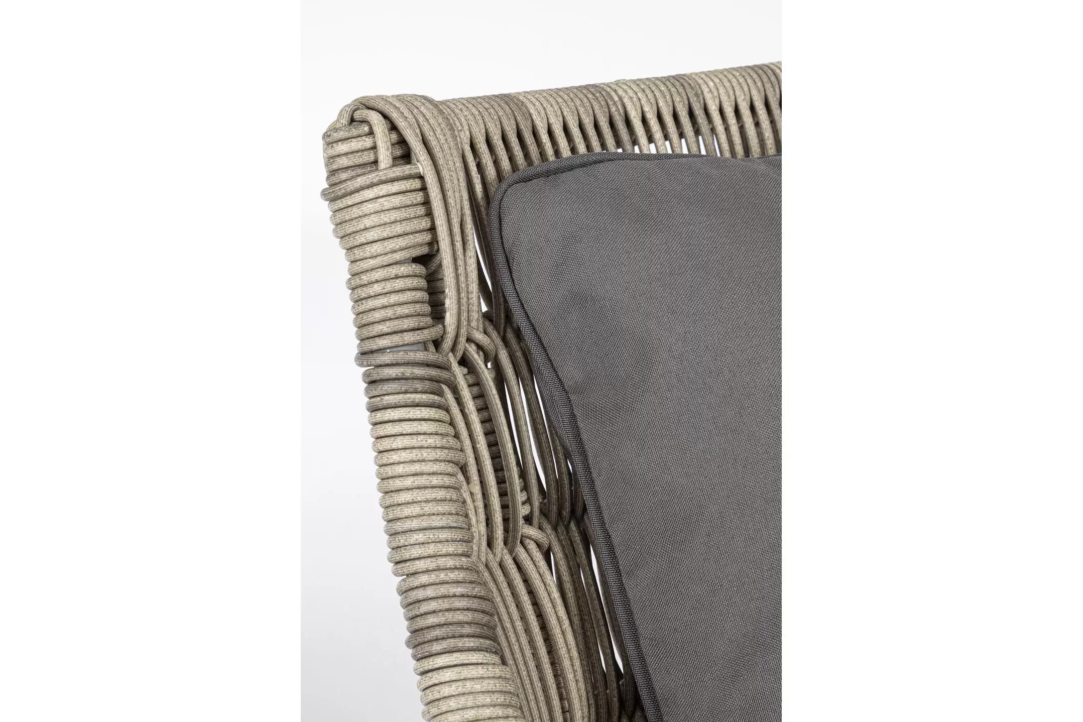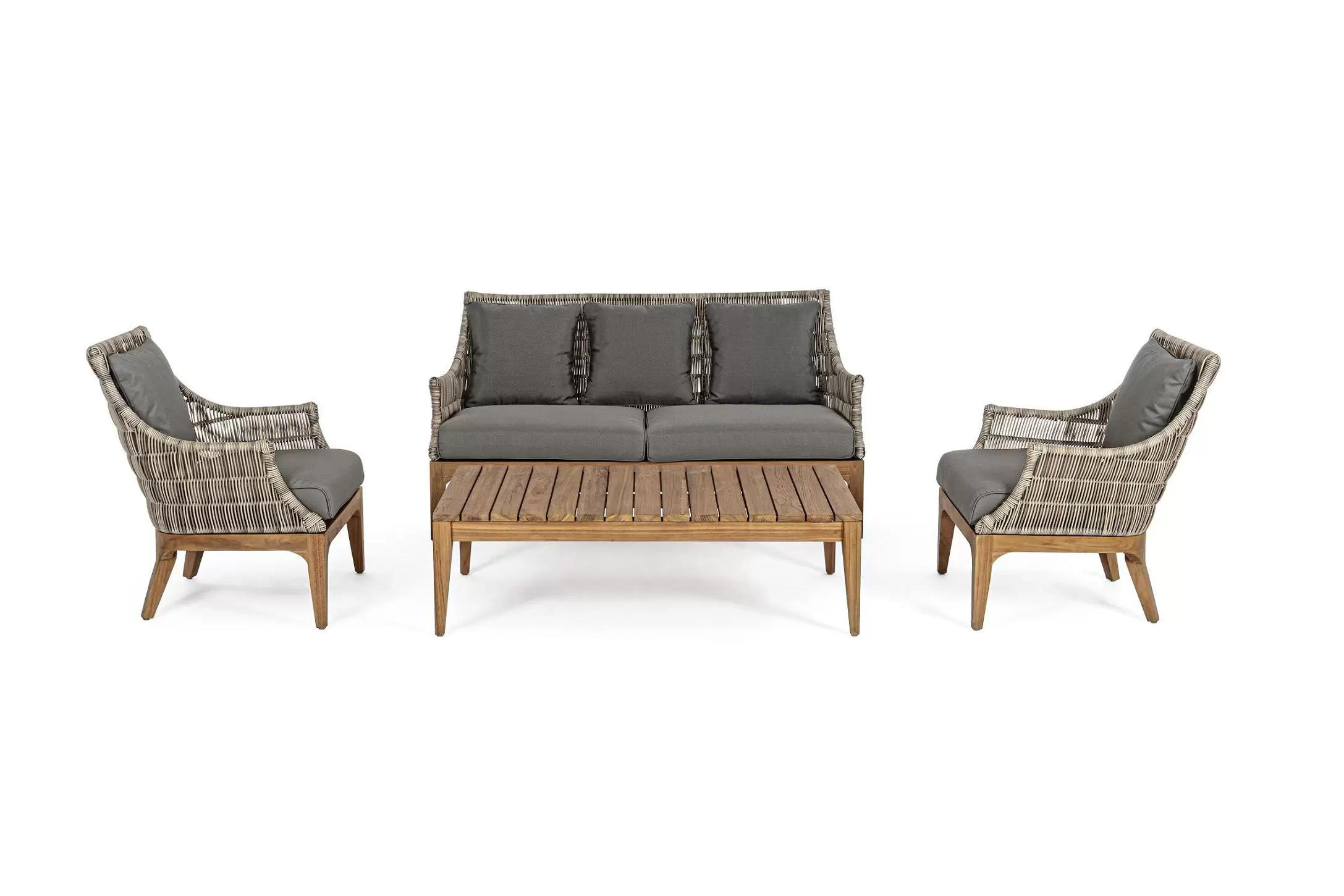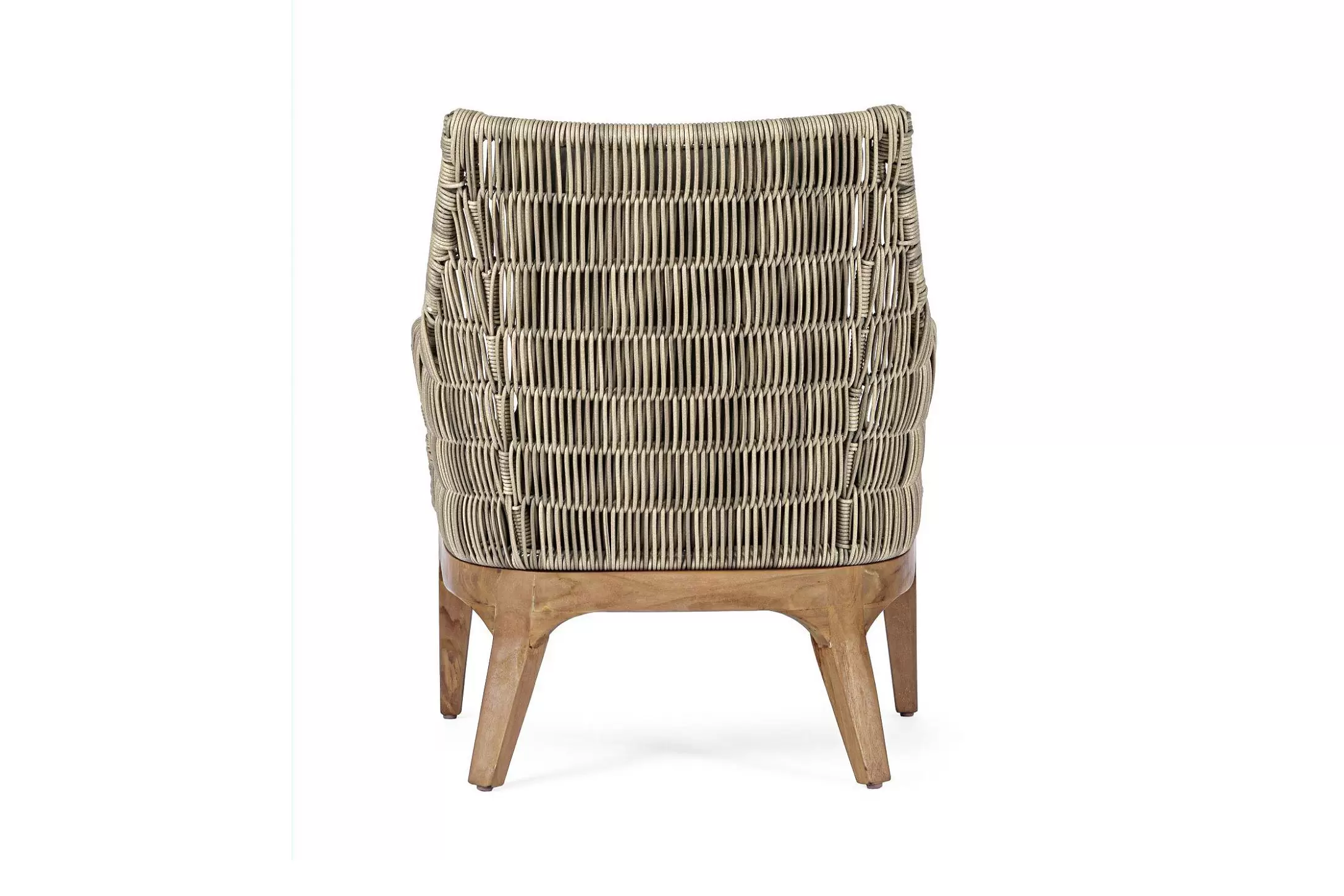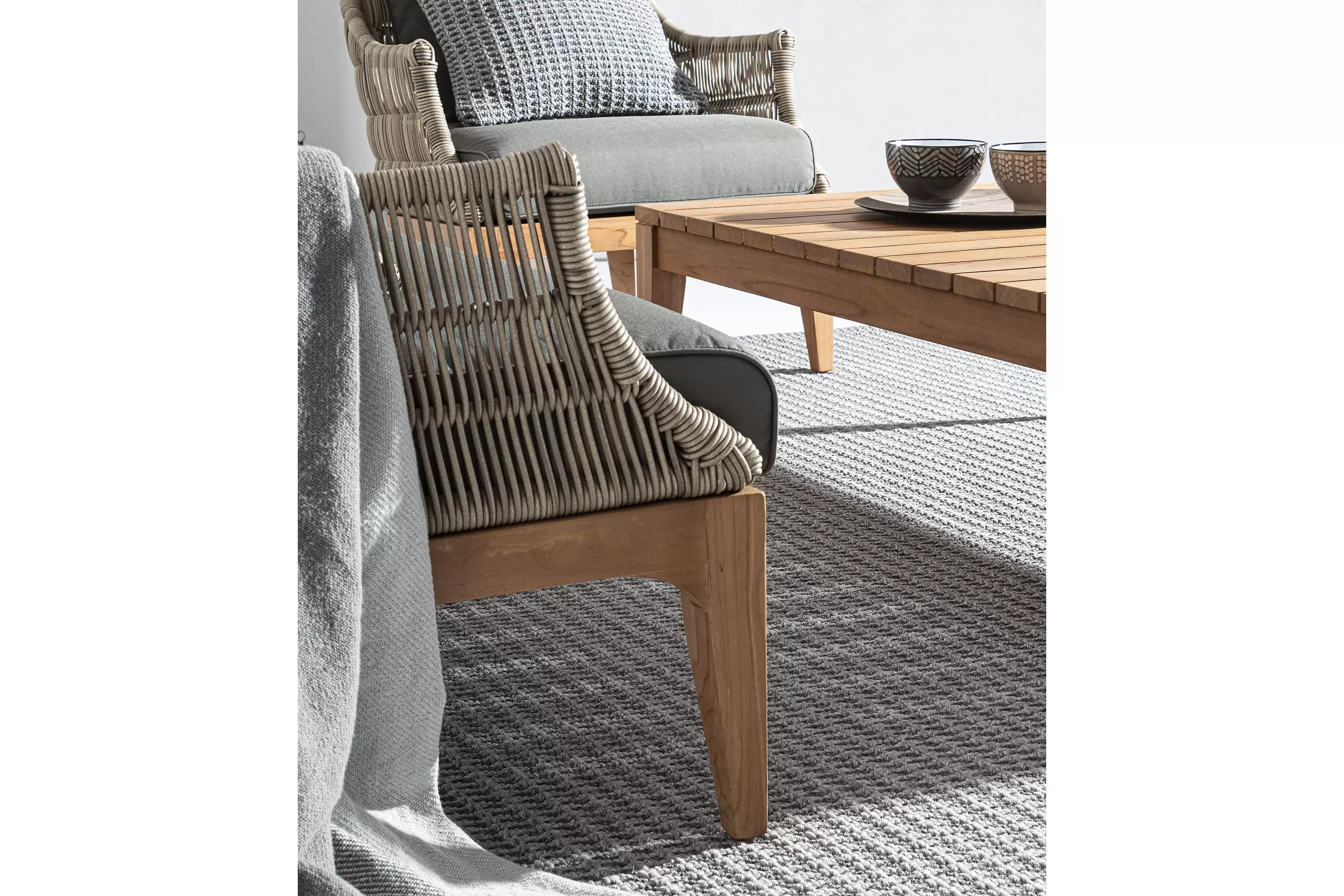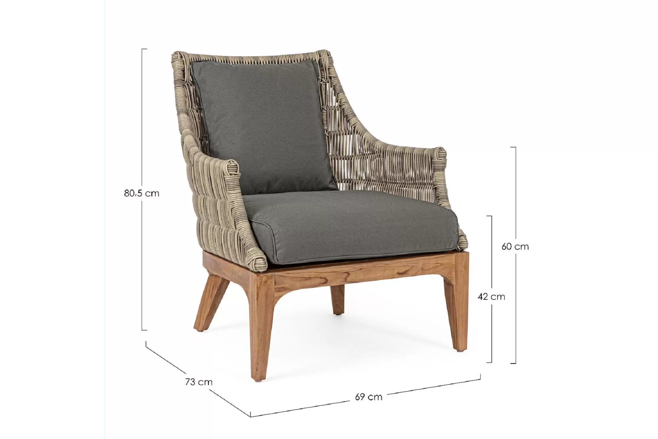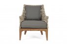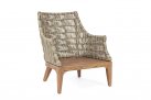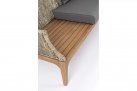 Fotel ogrodowy nowoczesny z wodoodpornymi poduszkami o teakowej podstawie i aluminiowej ramie siedzisk oplecionej technorattanem.
