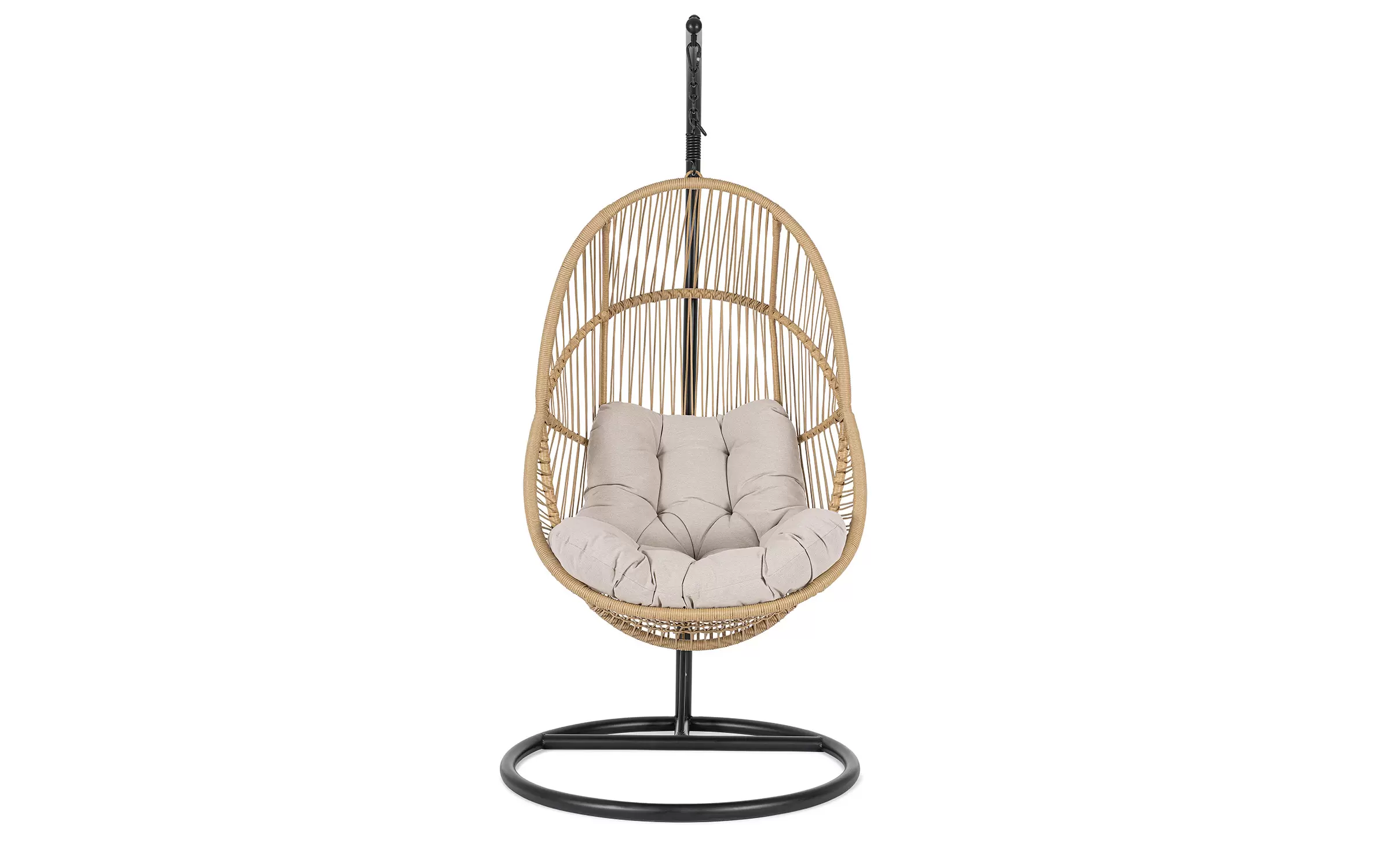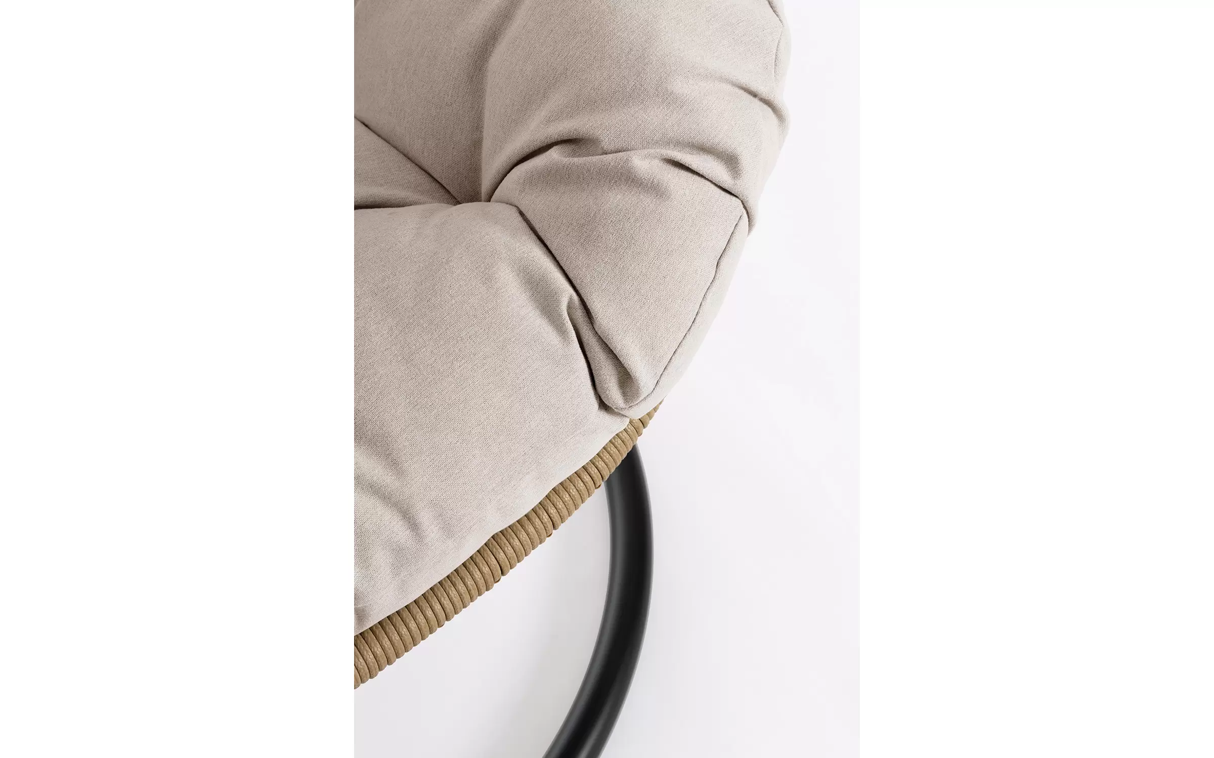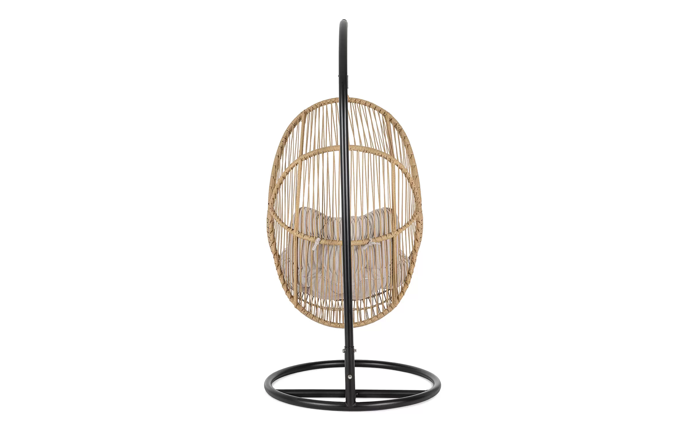 Huśtawka typu kokon zawieszony na podstawie stalowej czarnej. Kosz opleciony piaskowym technorattanem.