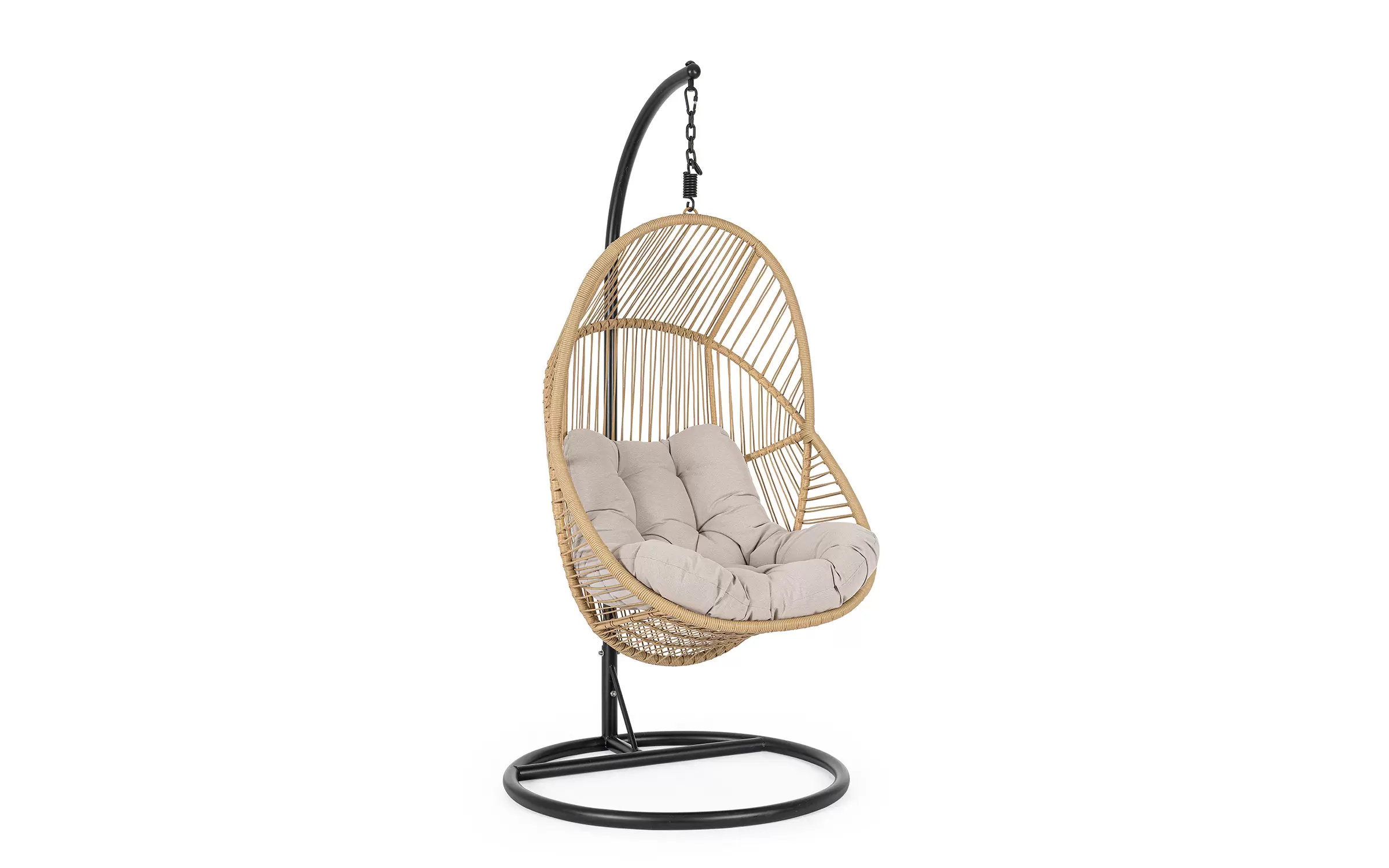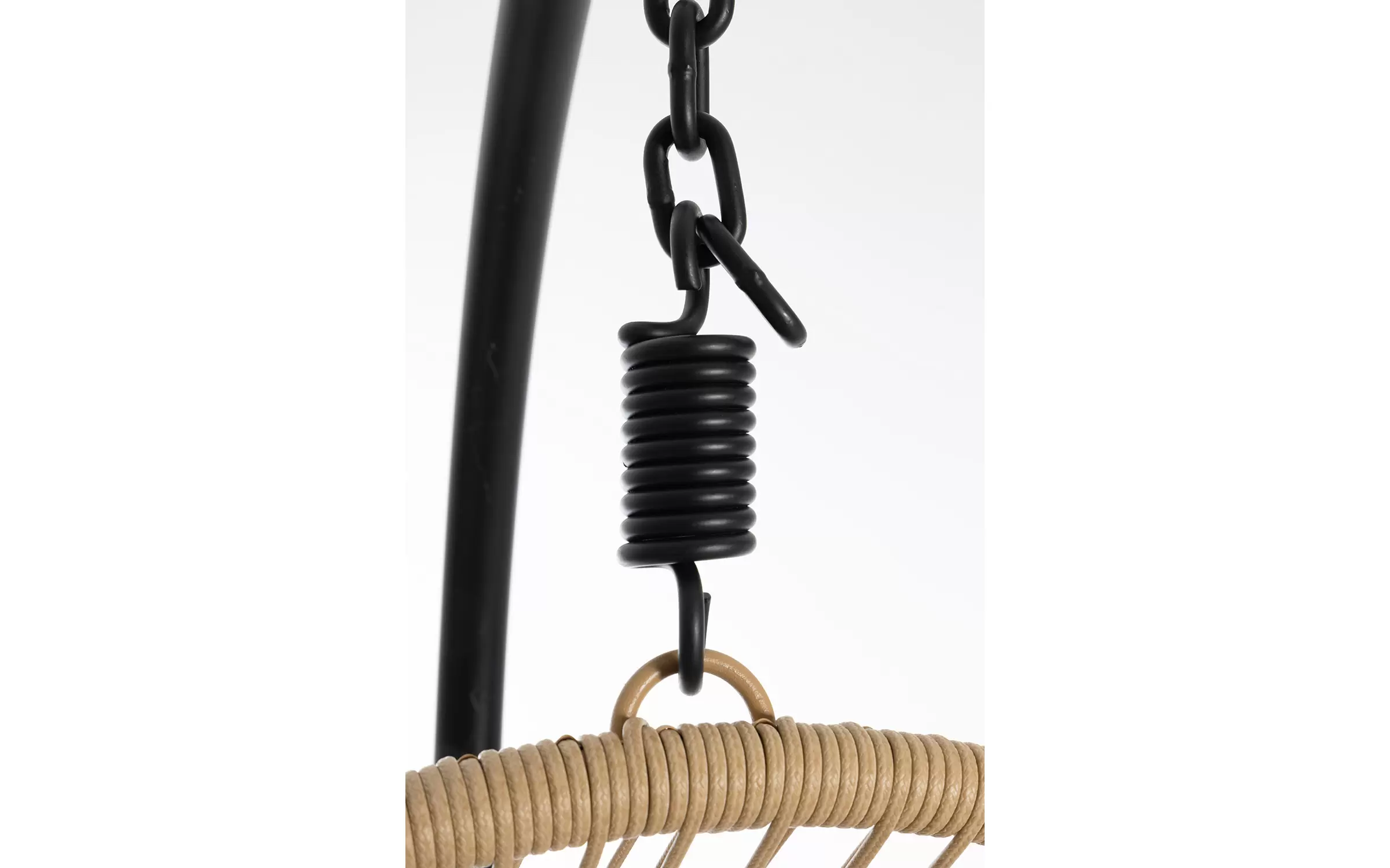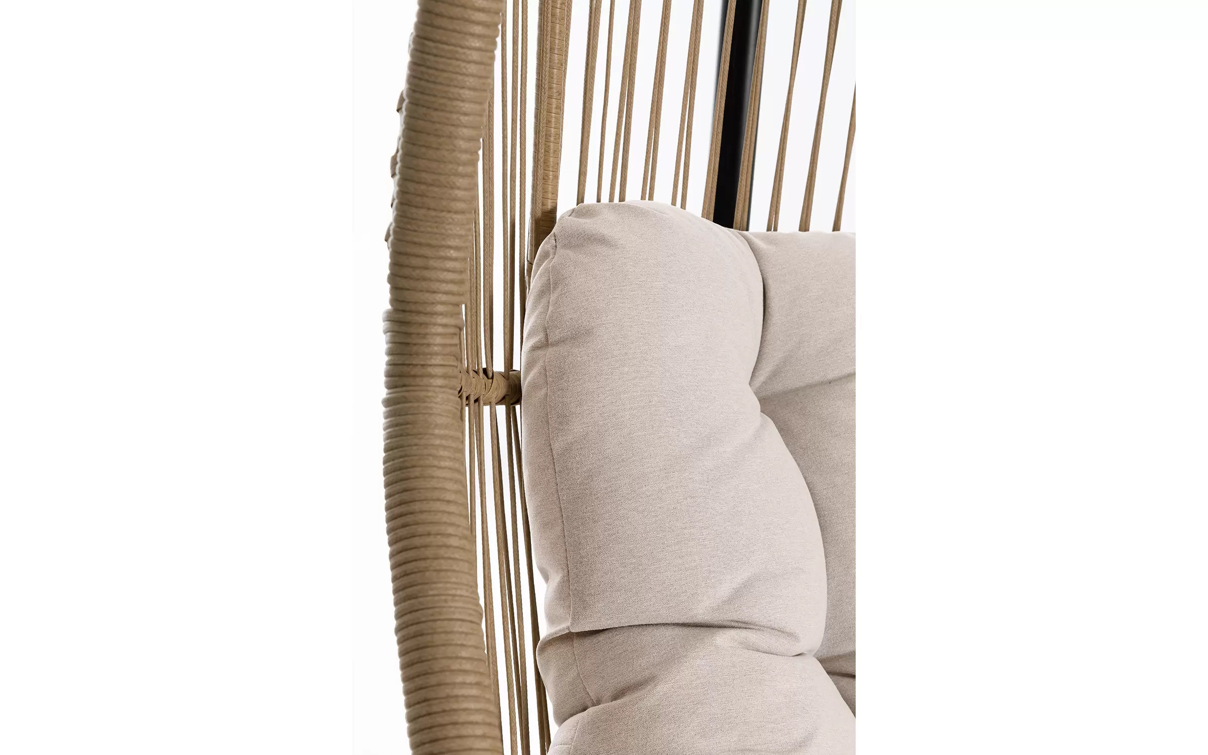 Huśtawka typu kokon zawieszony na podstawie stalowej czarnej. Kosz opleciony piaskowym technorattanem.