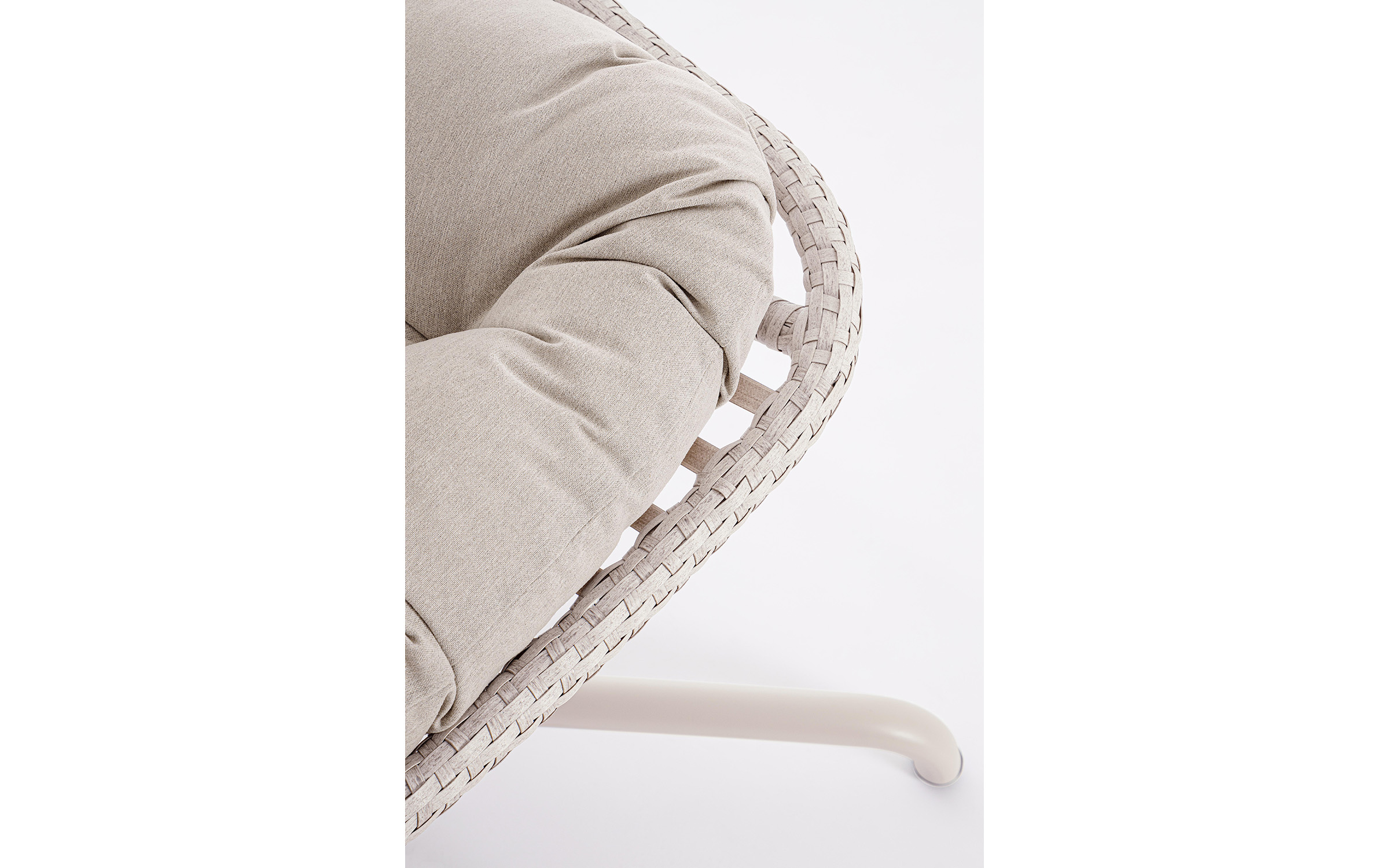 Stalowa konstrukcja zabezpieczona do użytku zewnętrznego poprzez fosforanowanie i malowanie proszkowe (poliester). Plecionka z włókna syntetycznego. Niedemontowalna poduszka wykonana z poliestrowej tkaniny odpornej na wodę. Obrotowe siedzenie 360°. Maksymalne obciążenie: 130 kg. Podstawa (do samodzielnego montażu) pakowana w karton. Siedzenie pakowane bez kartonu.