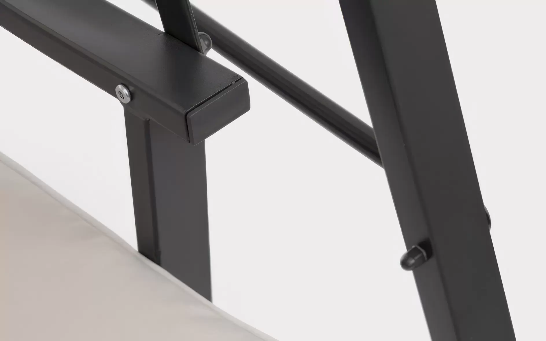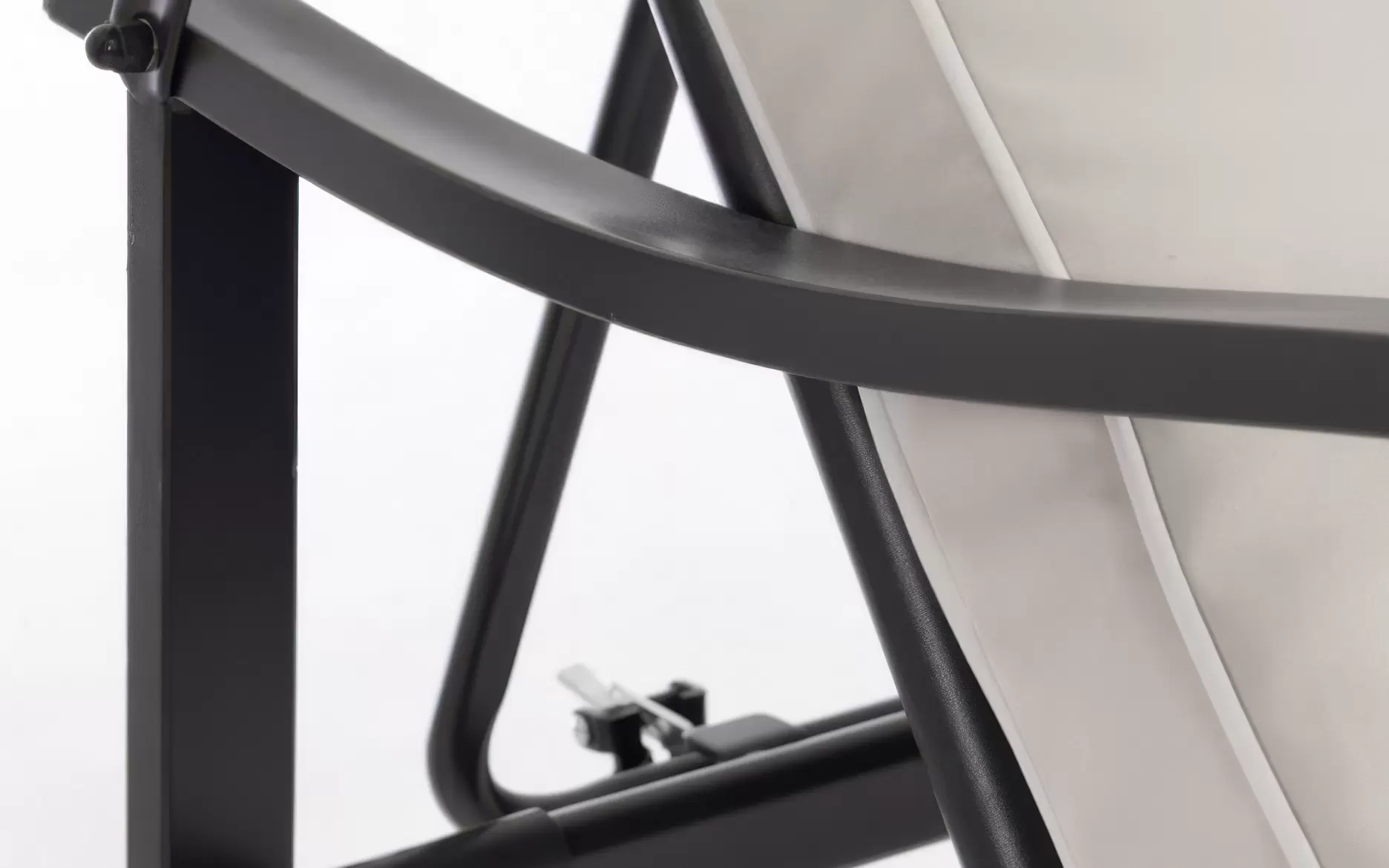 Siedzisko i oparcie wykonano z wytrzymałej tkaniny oxford 300×600D, a miękkie, pikowane poduszki z poliestru 160 g/m² zapewniają wysoki komfort użytkowania. Największym atutem modelu jest funkcja rozkładania oparcia do pozycji leżanki, dzięki której powstaje wygodna powierzchnia wypoczynkowa o wymiarach 150 × 108 cm.